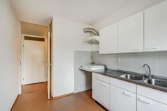 De gesloten keuken is uitgerust met een gasfornuis en een afzuigkap. Daarnaast is er voldoende werkblad en bergruimte aanwezig, wat de keuken praktisch en functioneel maakt.