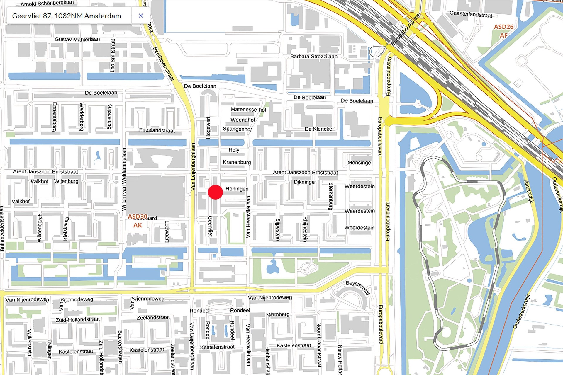 Geervliet 87 ligt in de gewilde en groene wijk Buitenveldert, op loopafstand van winkelcentrum Gelderlandplein, supermarkten en gezellige horecagelegenheden. De verbindingen met het openbaar vervoer (tram, metro en bus) zijn uitstekend, en de A10 is binnen enkele minuten bereikbaar. Daarnaast bevindt u zich op korte afstand van de Zuidas, het Amsterdamse Bos en diverse sport- en recreatiemogelijkheden.
