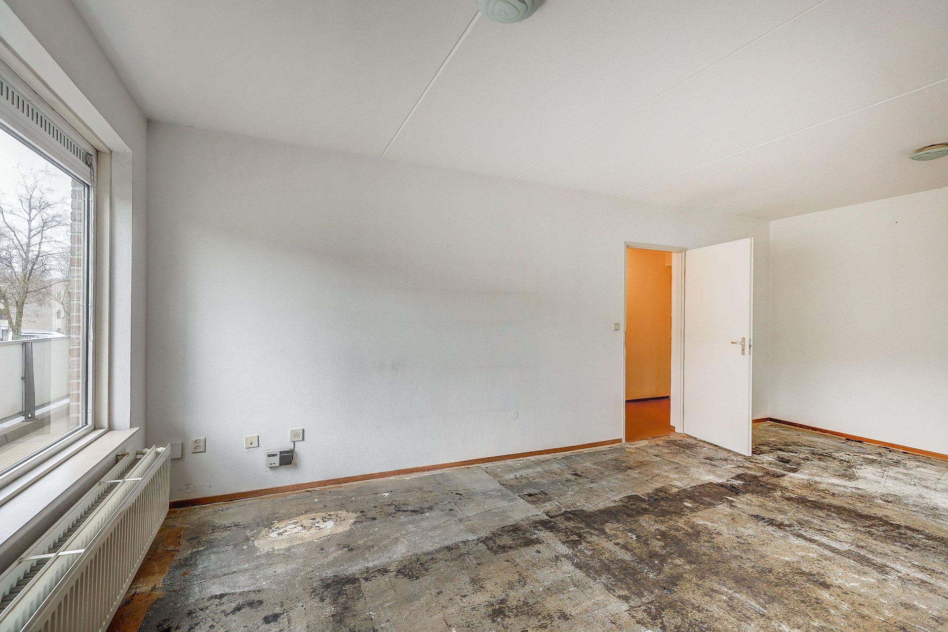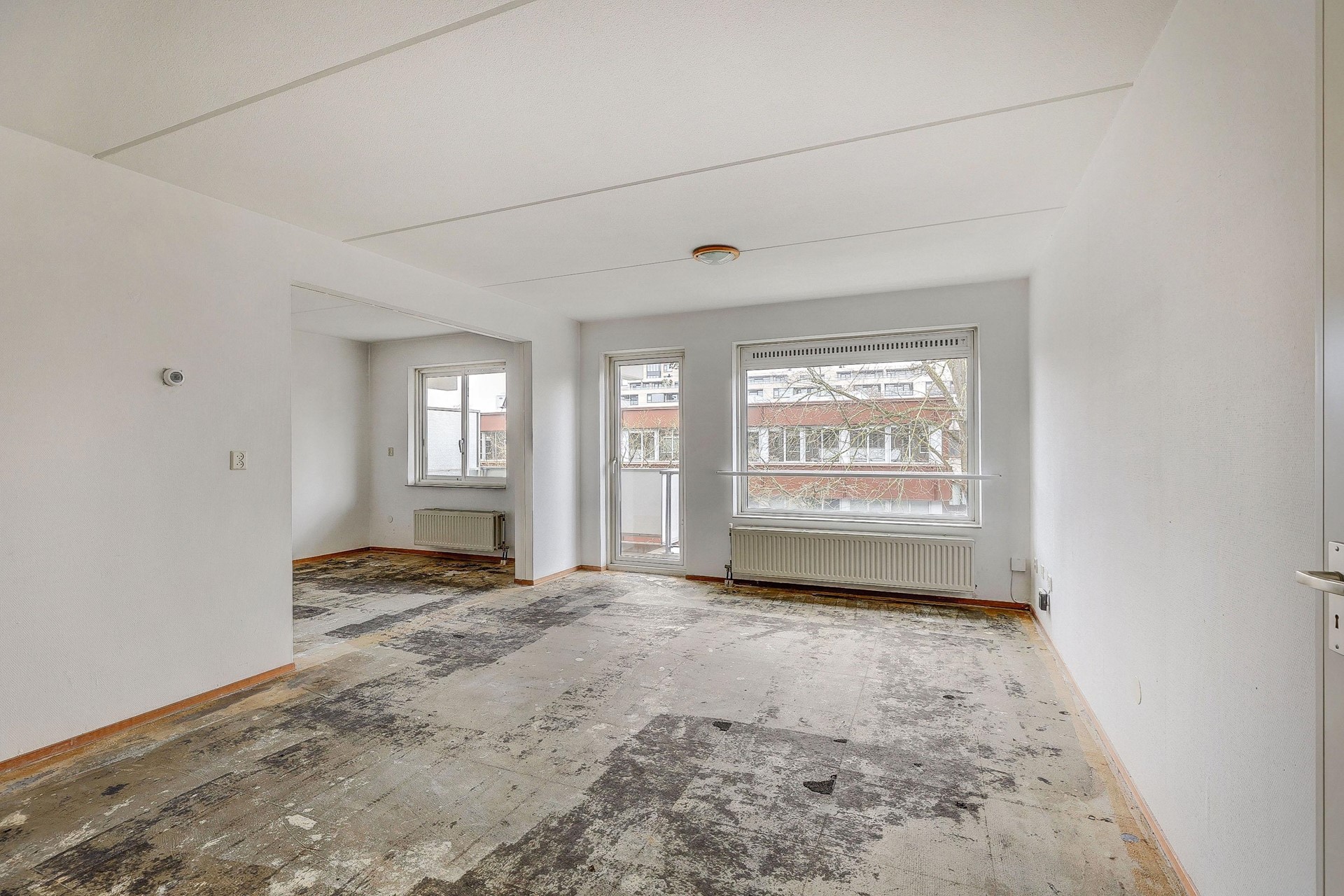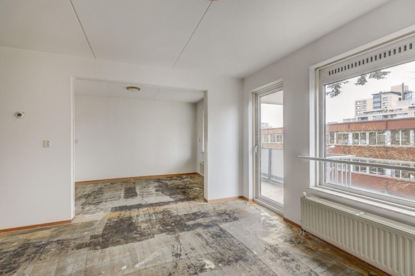De lichte woonkamer biedt toegang tot het balkon waar u heerlijk kunt genieten van de buitenlucht. Grote raampartijen zorgen voor veel natuurlijk licht en een vrij uitzicht op de straat.