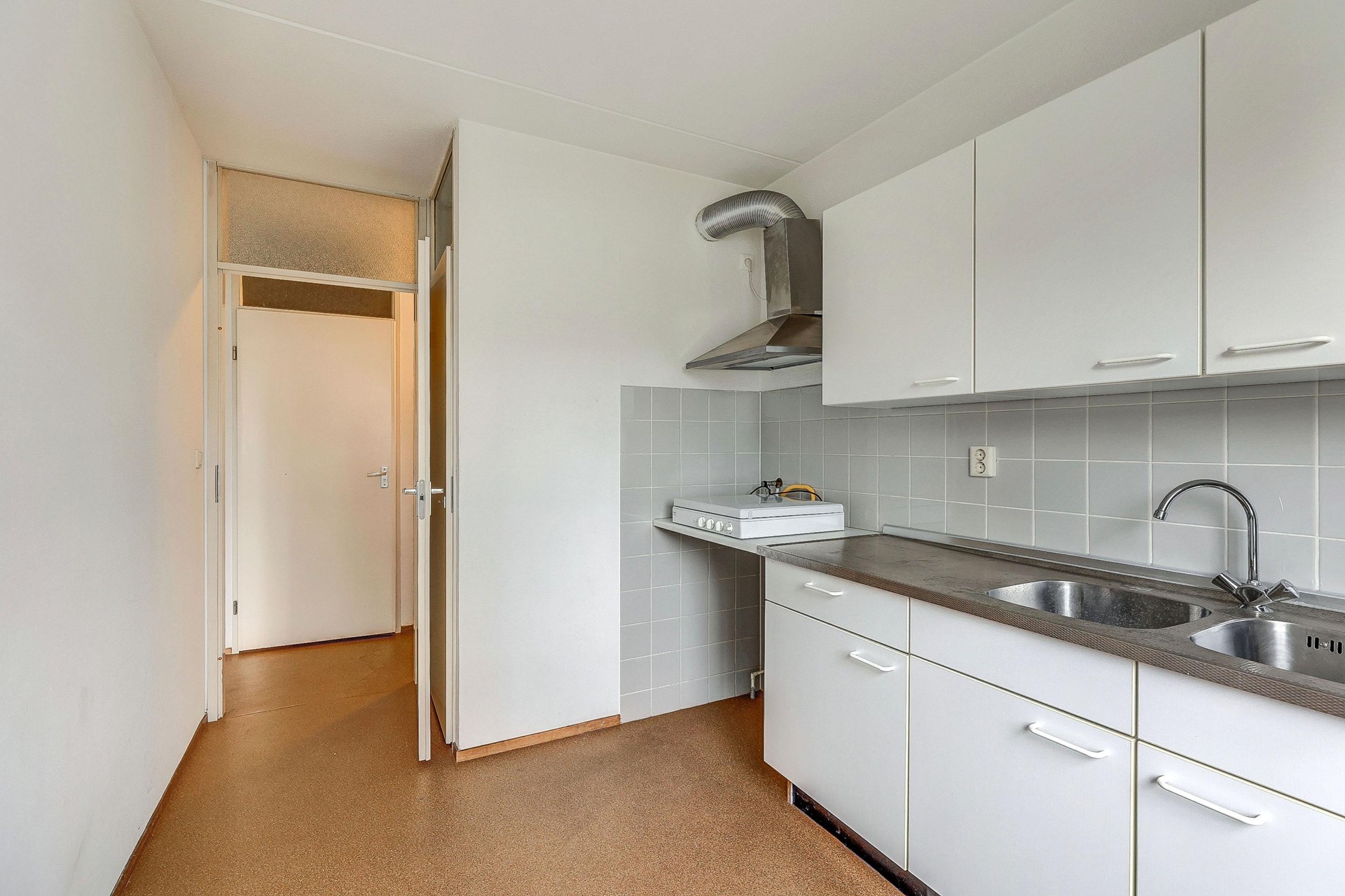 De dichte keuken beschikt over een gasfornuis en afzuigkap. Ook is er voldoende werk- en opbergruimte.