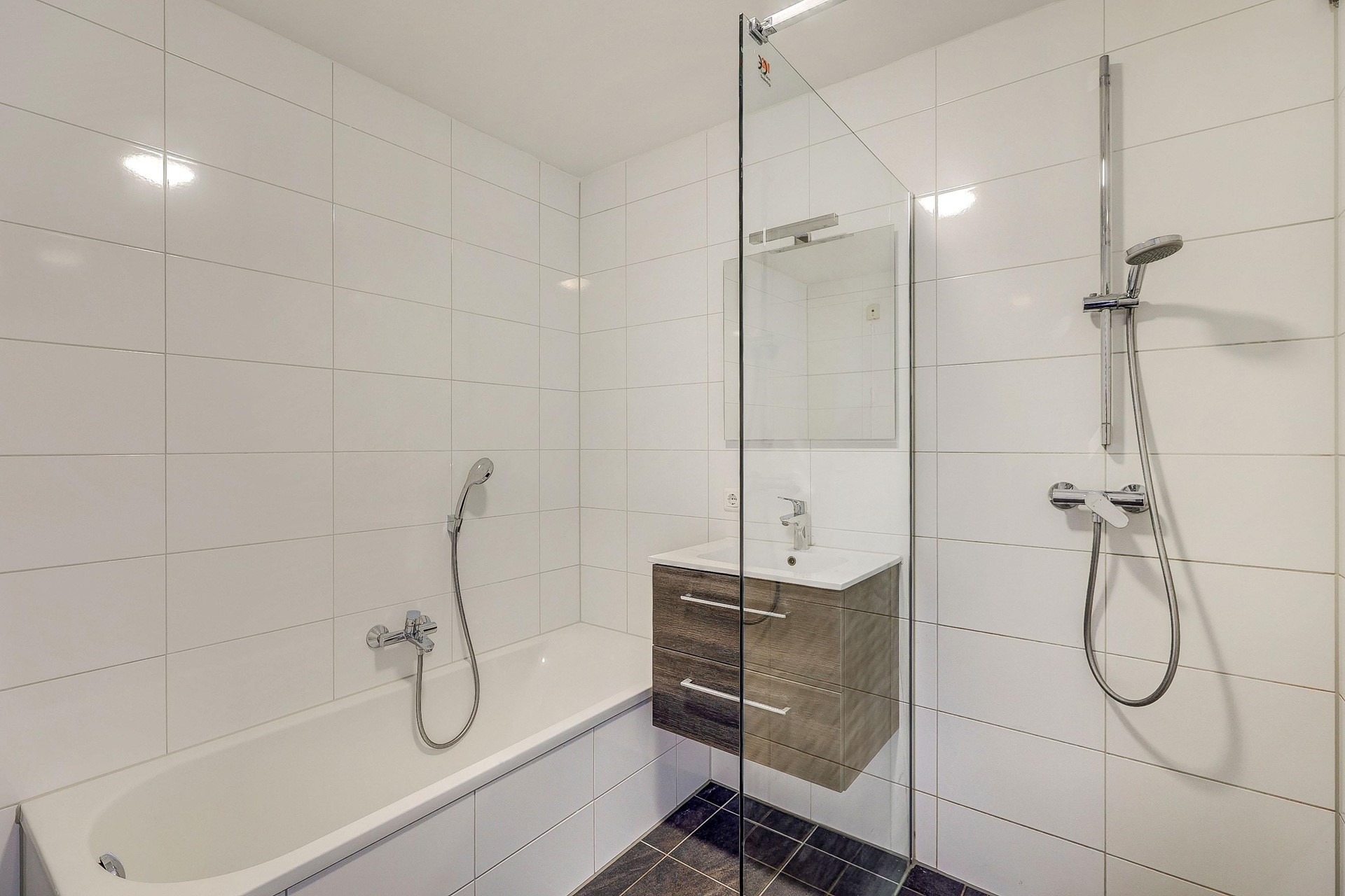 De onlangs gerenoveerde badkamer is voorzien van een inloopdouche, ligbad en een modern wastafelmeubel. Daarnaast is er een separaat toilet (ook onlangs gerenoveerd). Verder is er ook een extra ruimte in de hal waar ruimte is voor een wasmachine aansluiting.
