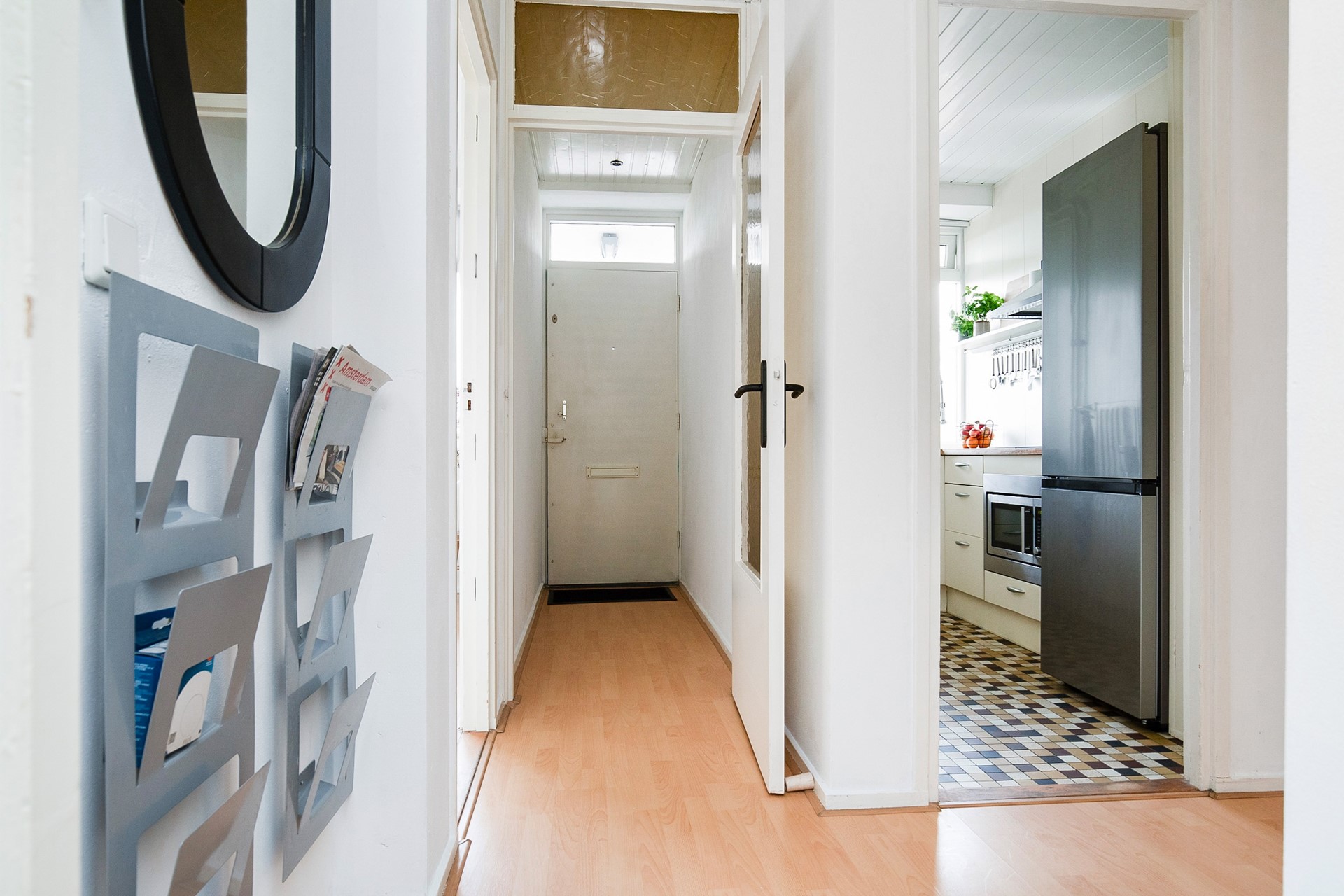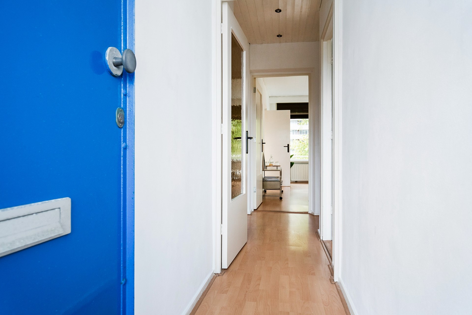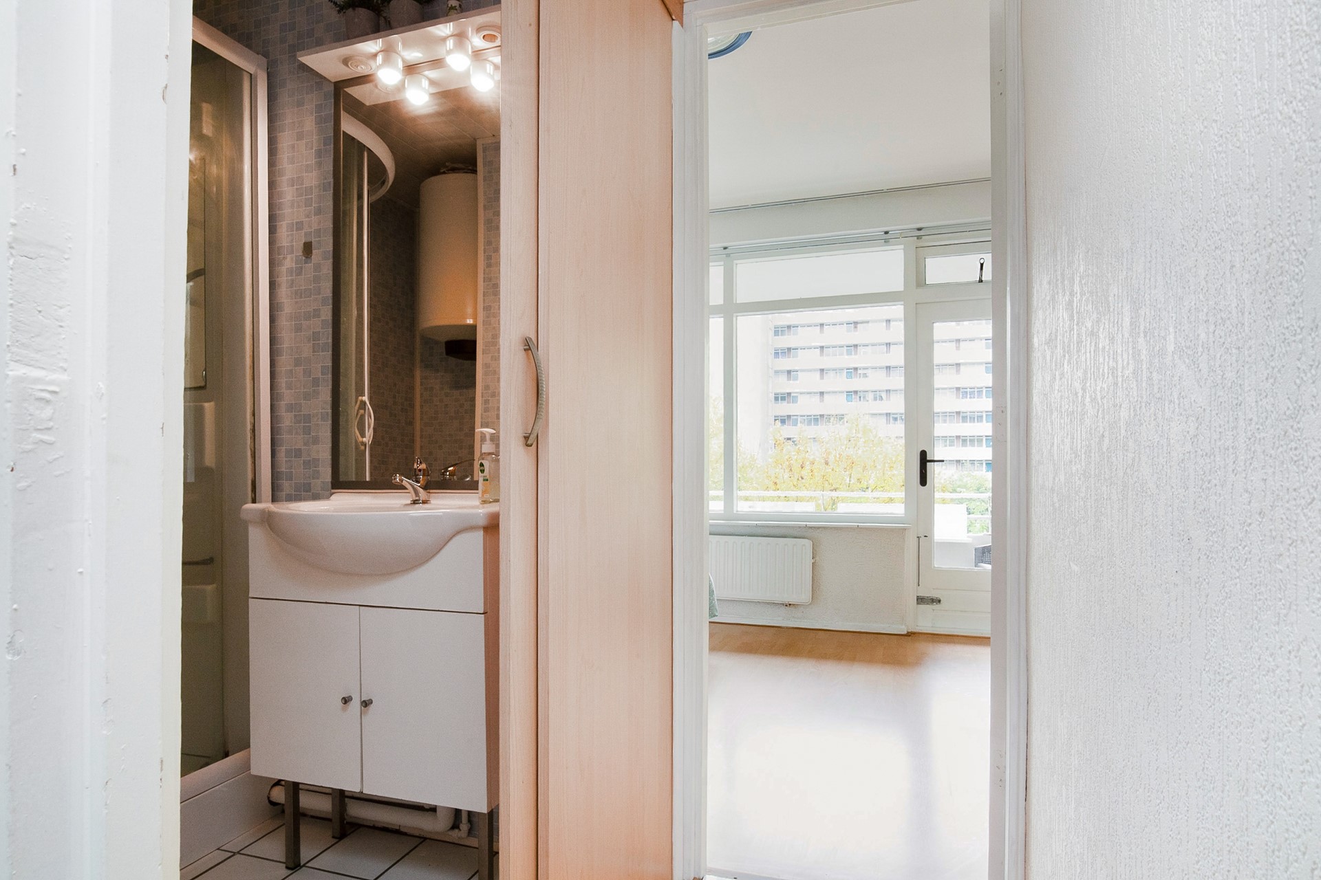 Via de centrale entree met trappenhuis en twee liften bereik je het appartement op de vierde verdieping. De ruime hal biedt toegang tot alle vertrekken. Aan de galerijzijde bevinden zich twee goed bemeten slaapkamers en de netjes afgewerkte keuken, voorzien van moderne apparatuur zoals een nieuwe inductieplaat, rvs afzuigunit en inbouwspots – ideaal voor de kookliefhebber.