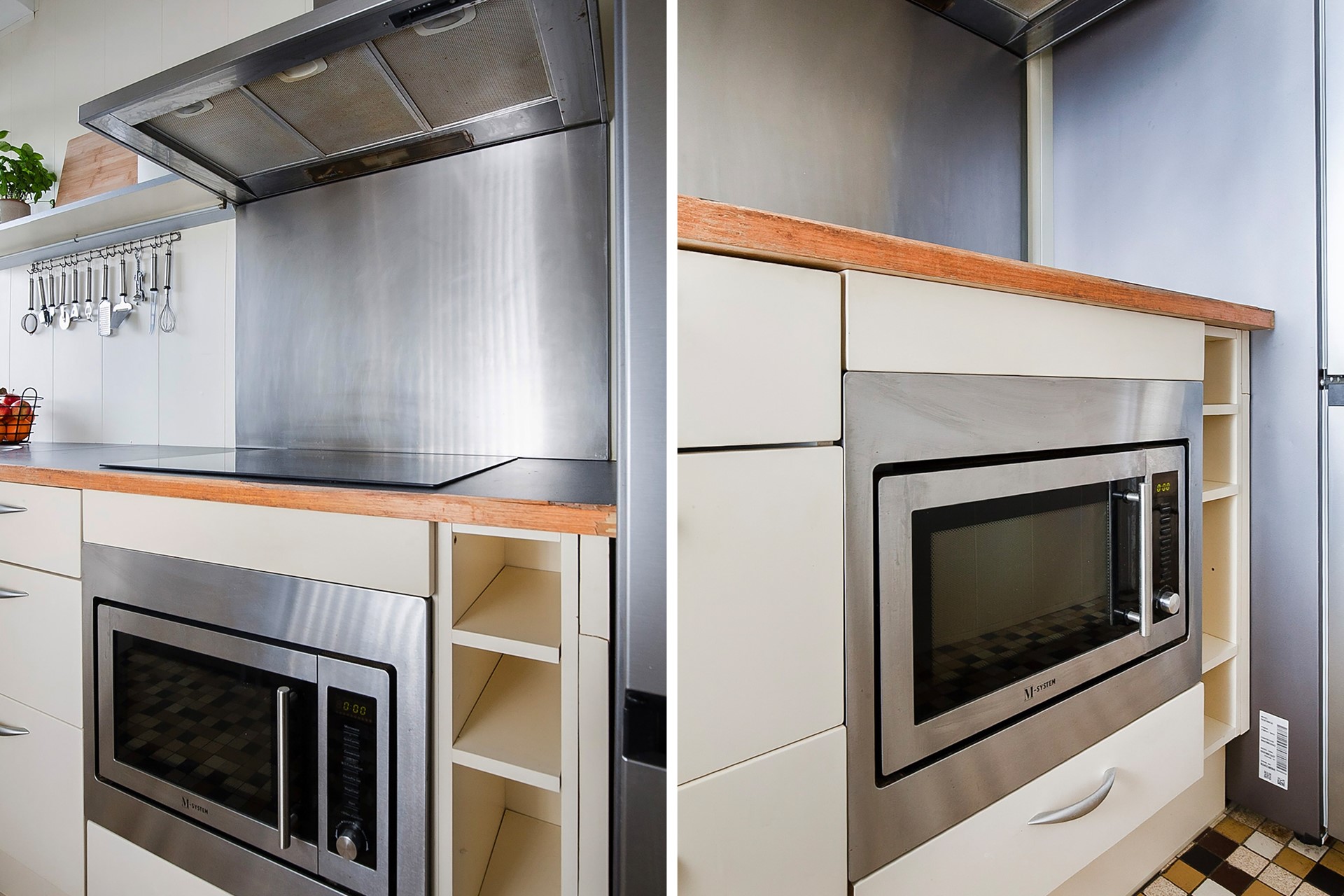 The spacious hallway provides access to all rooms. On the gallery side, you’ll find two well-sized bedrooms and a neatly finished kitchen equipped with modern appliances, including a new induction hob, stainless steel extractor hood, and recessed lighting – ideal for cooking enthusiasts.