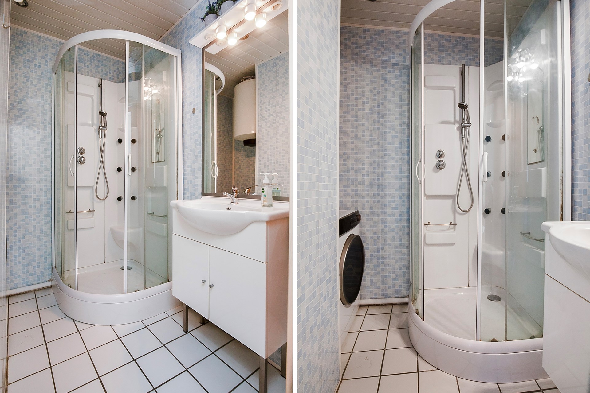 De badkamer is uitgerust met een stijlvol wastafelmeubel, een douchecabine met massage jets en een aansluiting voor de wasmachine. Daarnaast is er een apart toilet en een praktische meterkast.