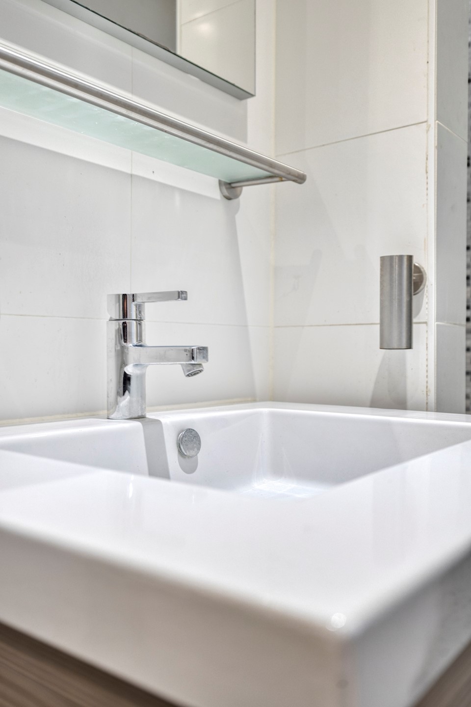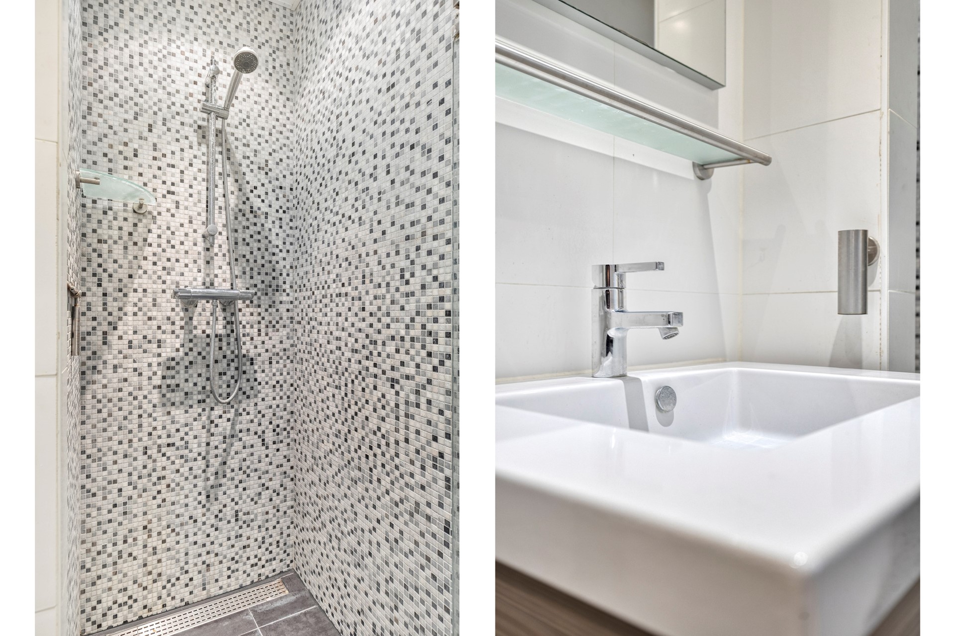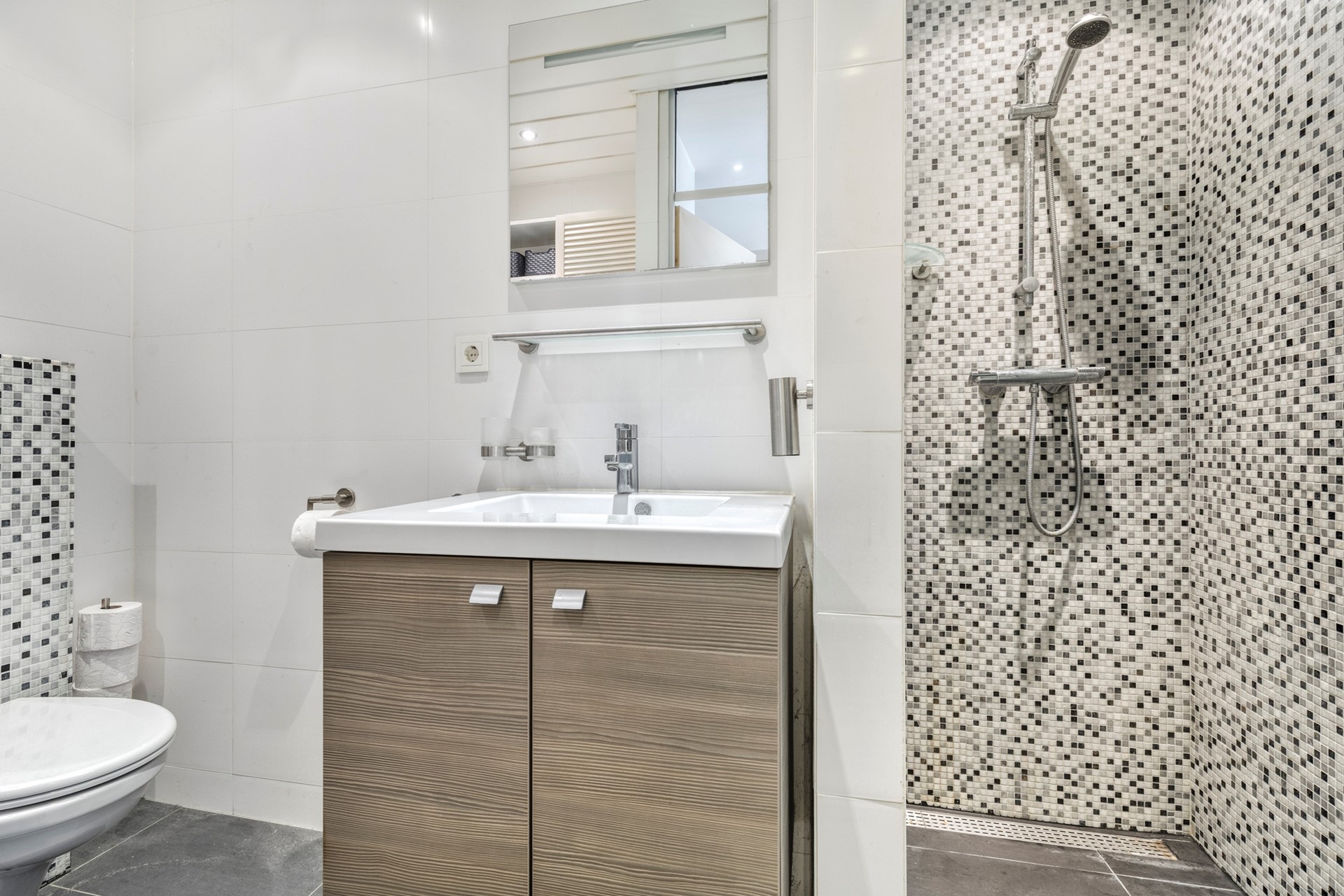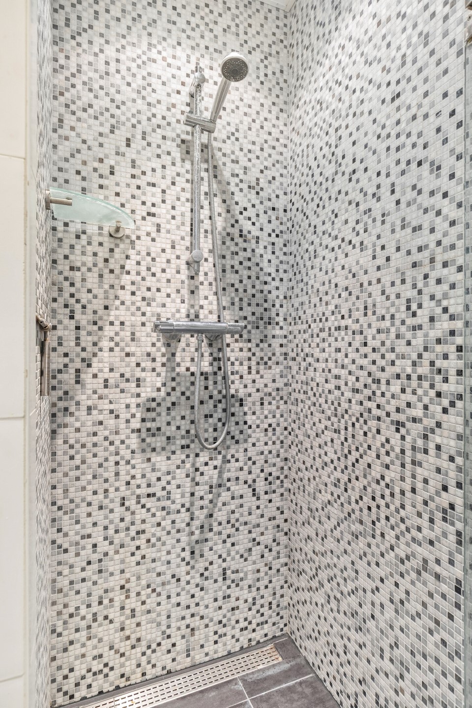 De badkamer is mooi afgewerkt met Italiaanse mozaïektegels en heeft een ruime inloopdouche en een wasmachine-aansluiting. De wasmachine kan eventueel achter twee louvre deuren uit het zicht geplaatst worden. De op maat gemaakte kast biedt voldoende opberg- en werkruimte.