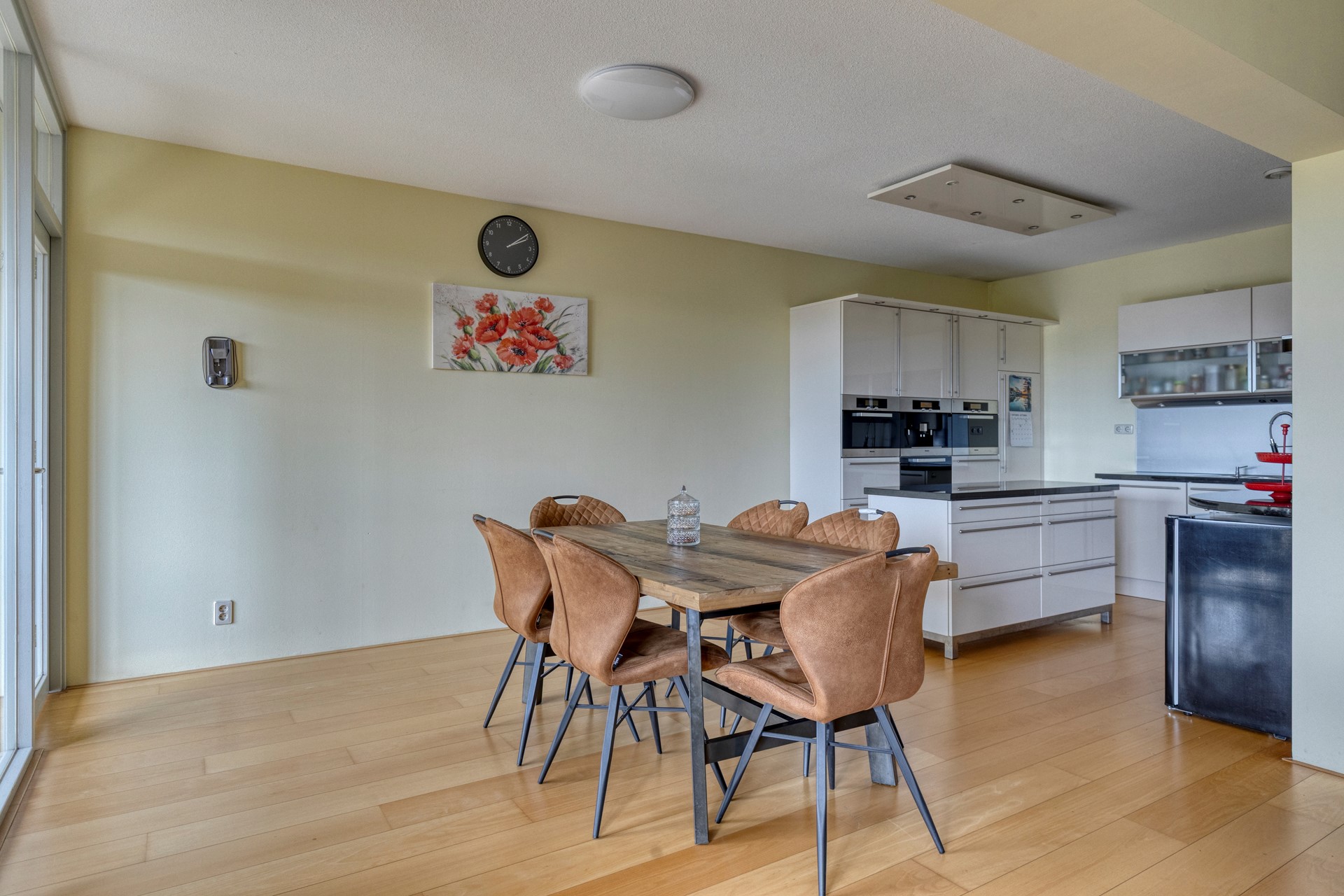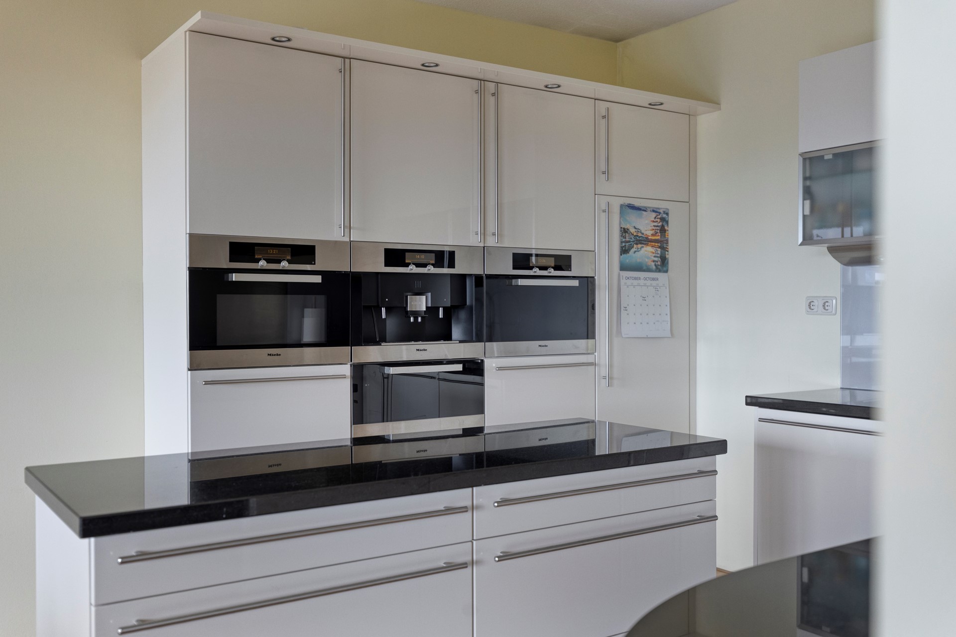 De keuken is voorzien van alle benodigde inbouwapparatuur, waaronder een geïntegreerde inductieplaat, Miele koffiemachine, combi-oven magnetron, koelkast en een vaatwasser. Daarnaast beschikt de keuken over een eland wat een zee aan werkruimte biedt.
