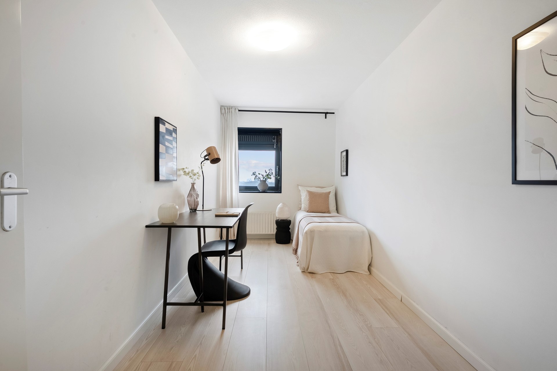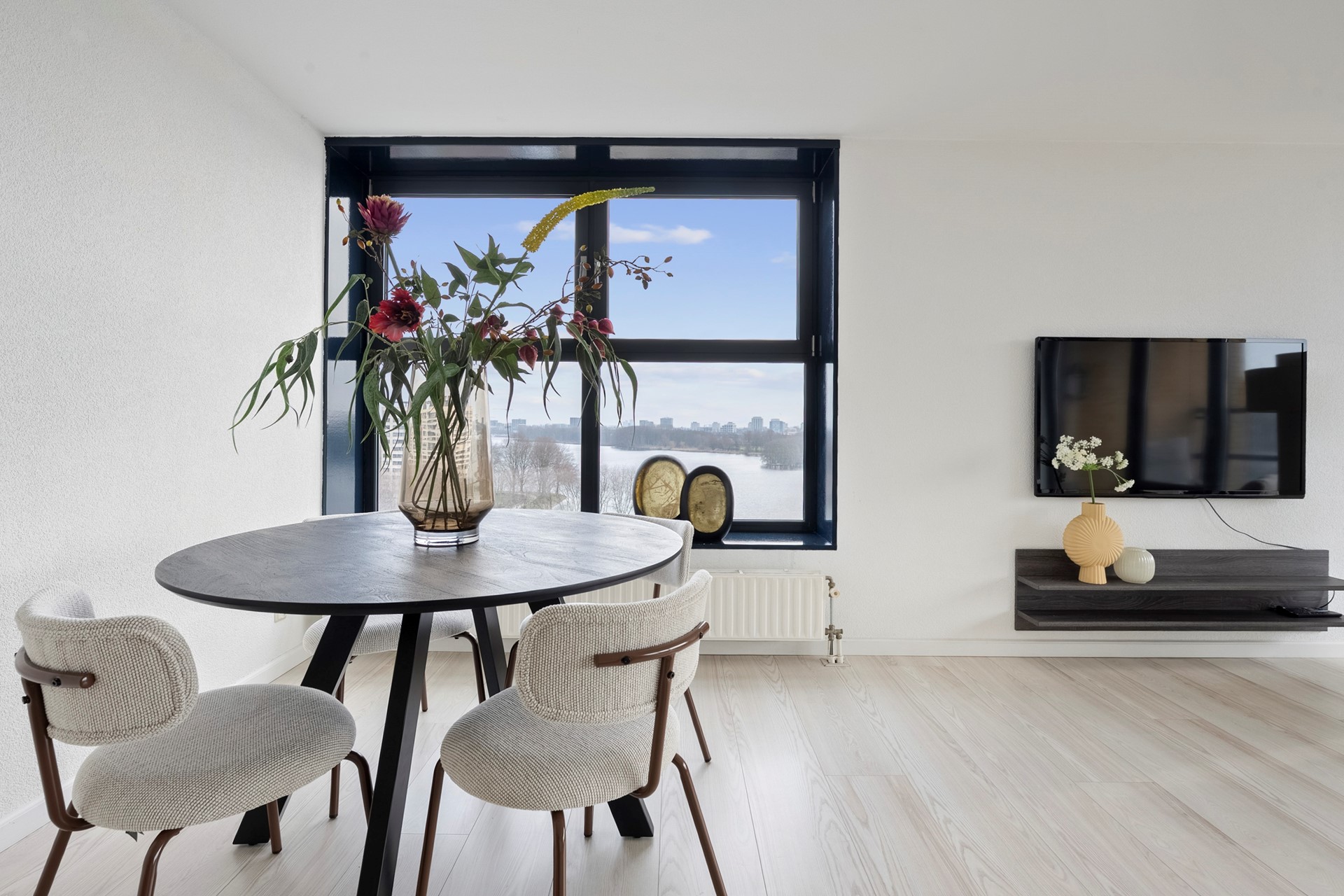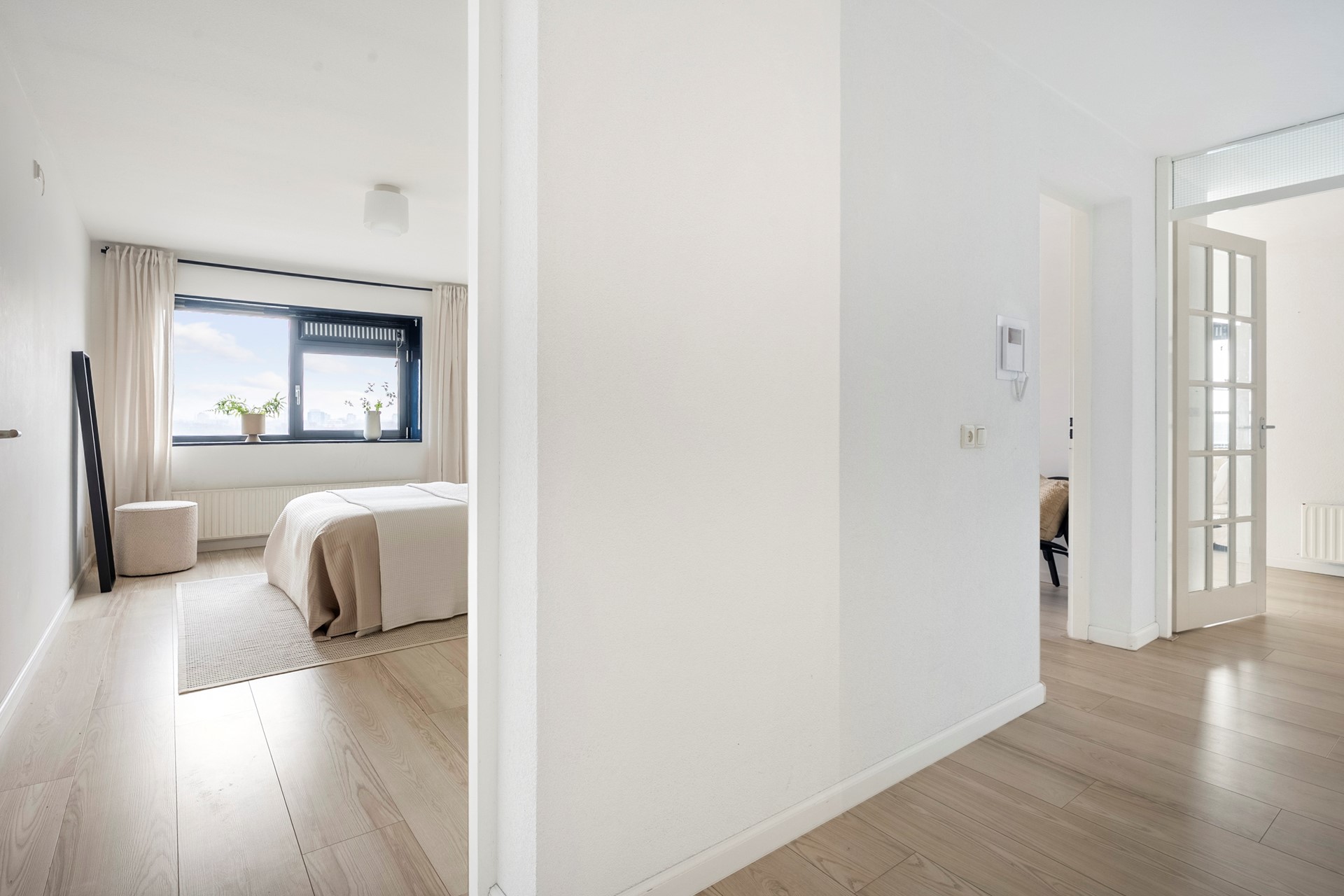 The hallway provides access to all rooms. The bright living room immediately stands out thanks to its corner position and large windows, offering spectacular views over the Sloterplas and surrounding greenery.