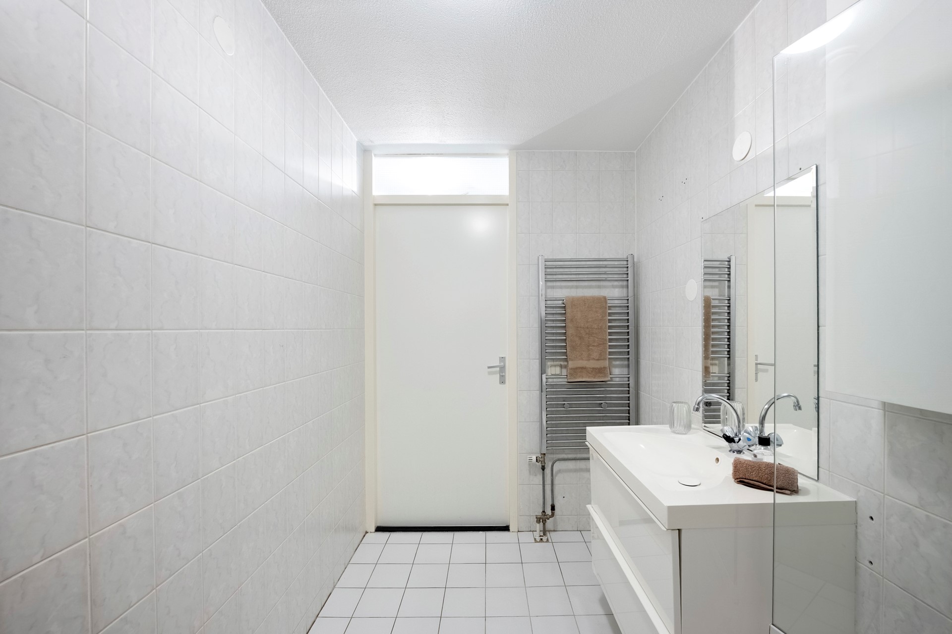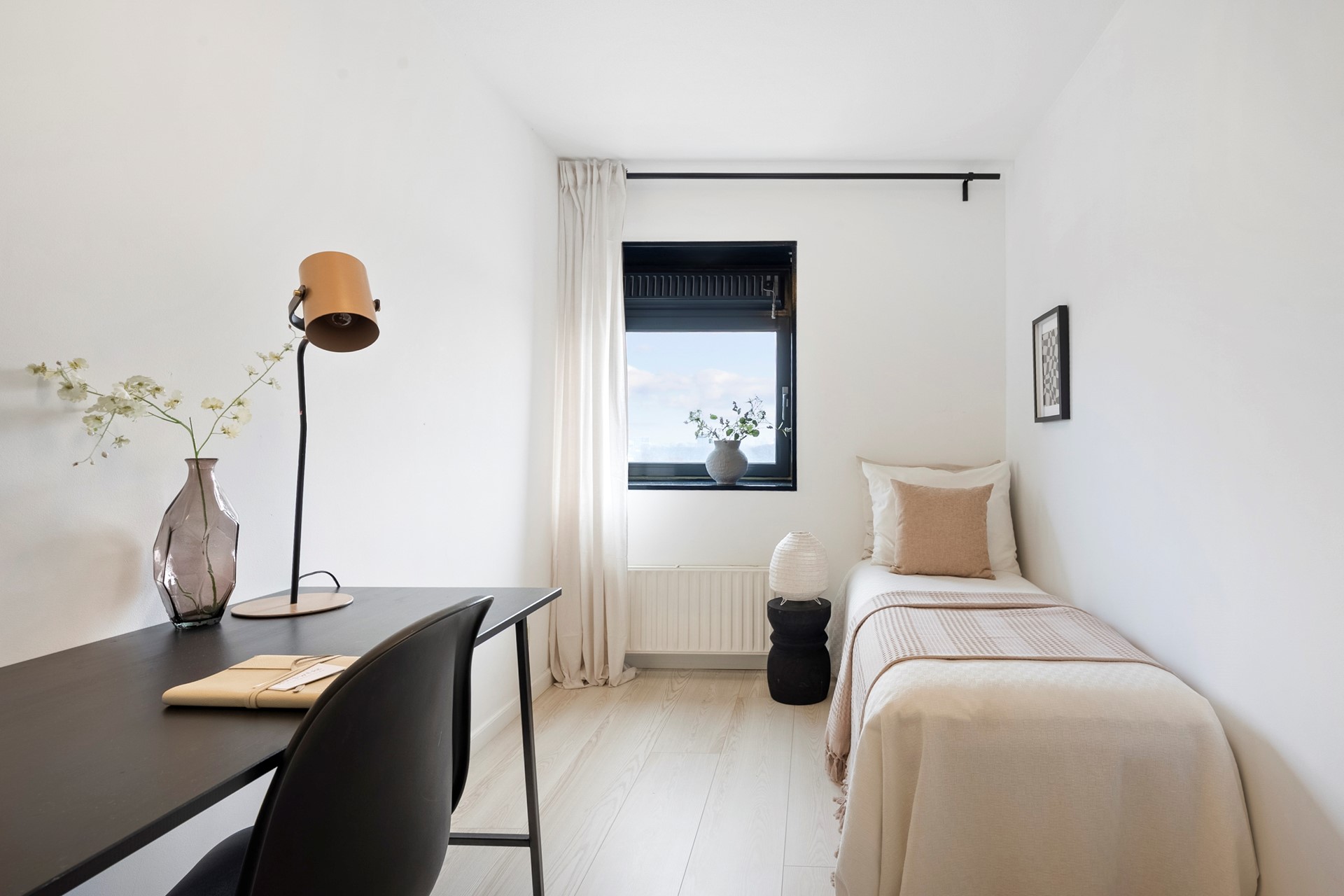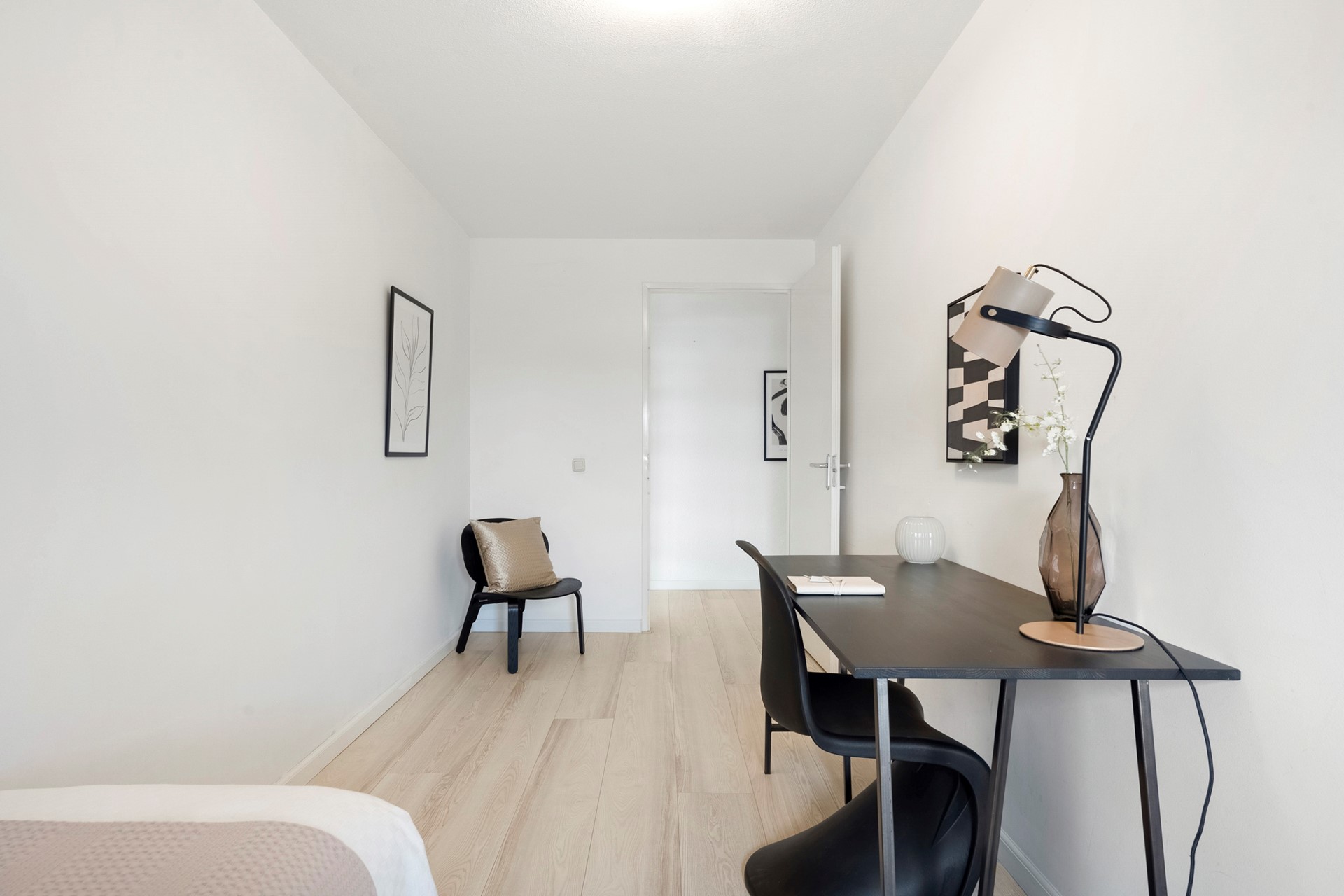 The hallway provides access to all rooms. The bright living room immediately stands out thanks to its corner position and large windows, offering spectacular views over the Sloterplas and surrounding greenery.
