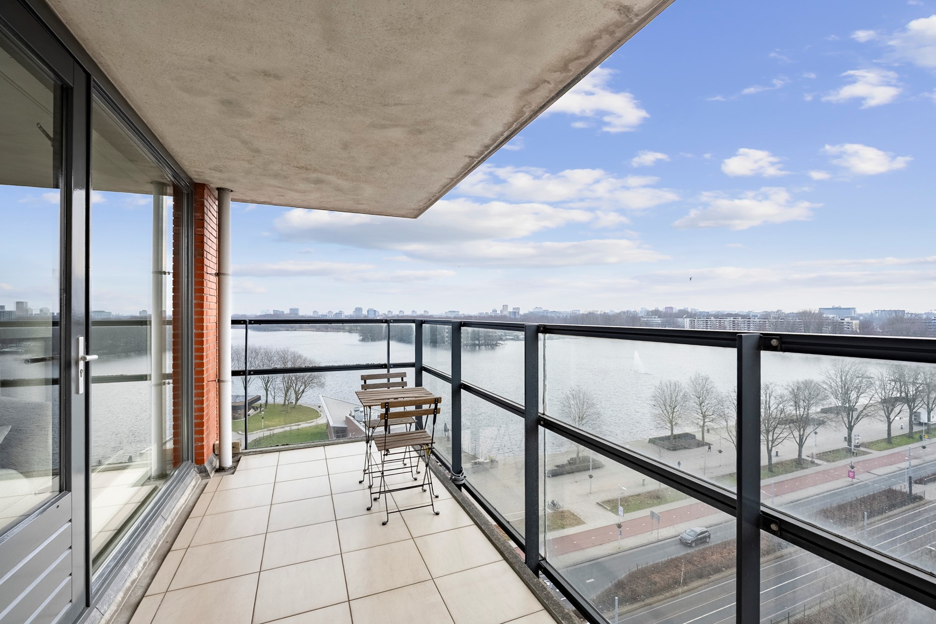 Vanuit de woonkamer stap je het zonnige balkon op het zuiden op, waar je in alle rust kunt genieten van het uitzicht over het water en het park – een unieke plek om te ontspannen.