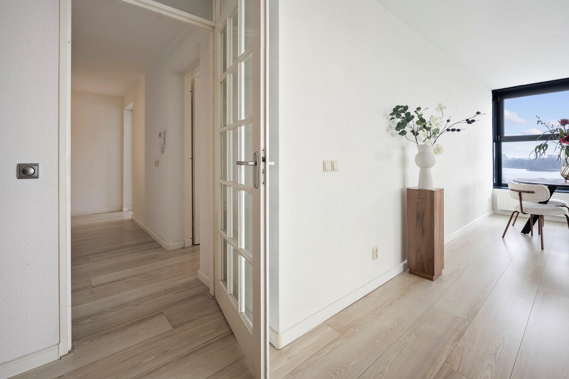 The hallway provides access to all rooms. The bright living room immediately stands out thanks to its corner position and large windows, offering spectacular views over the Sloterplas and surrounding greenery.