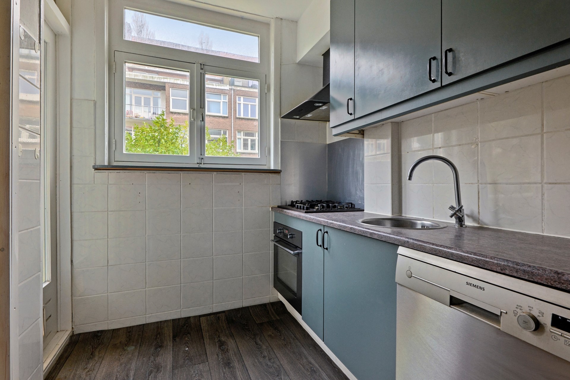 De royale woon-/eetkamer is heerlijk licht en vormt het hart van het appartement. Via de openslaande deuren bereik je het balkon, een prettige plek voor een kop koffie in de ochtendzon of een ontspannen moment buiten. De dichte keuken is functioneel, maar biedt tegelijkertijd de kans om deze naar eigen wens te moderniseren en in te richten.