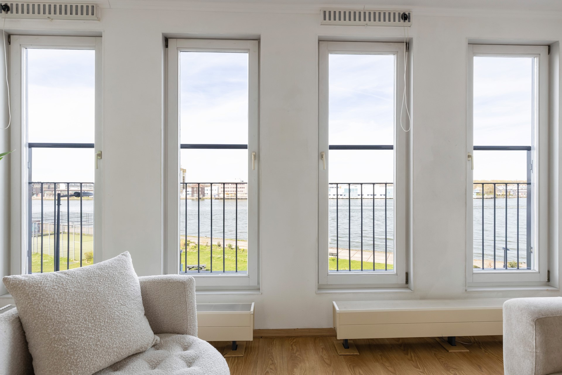 De lichte woonkamer heeft een enorm prachtig uitzicht over het IJ, zie jij je zelf hier al zitten, kijkend naar de zonsondergang?