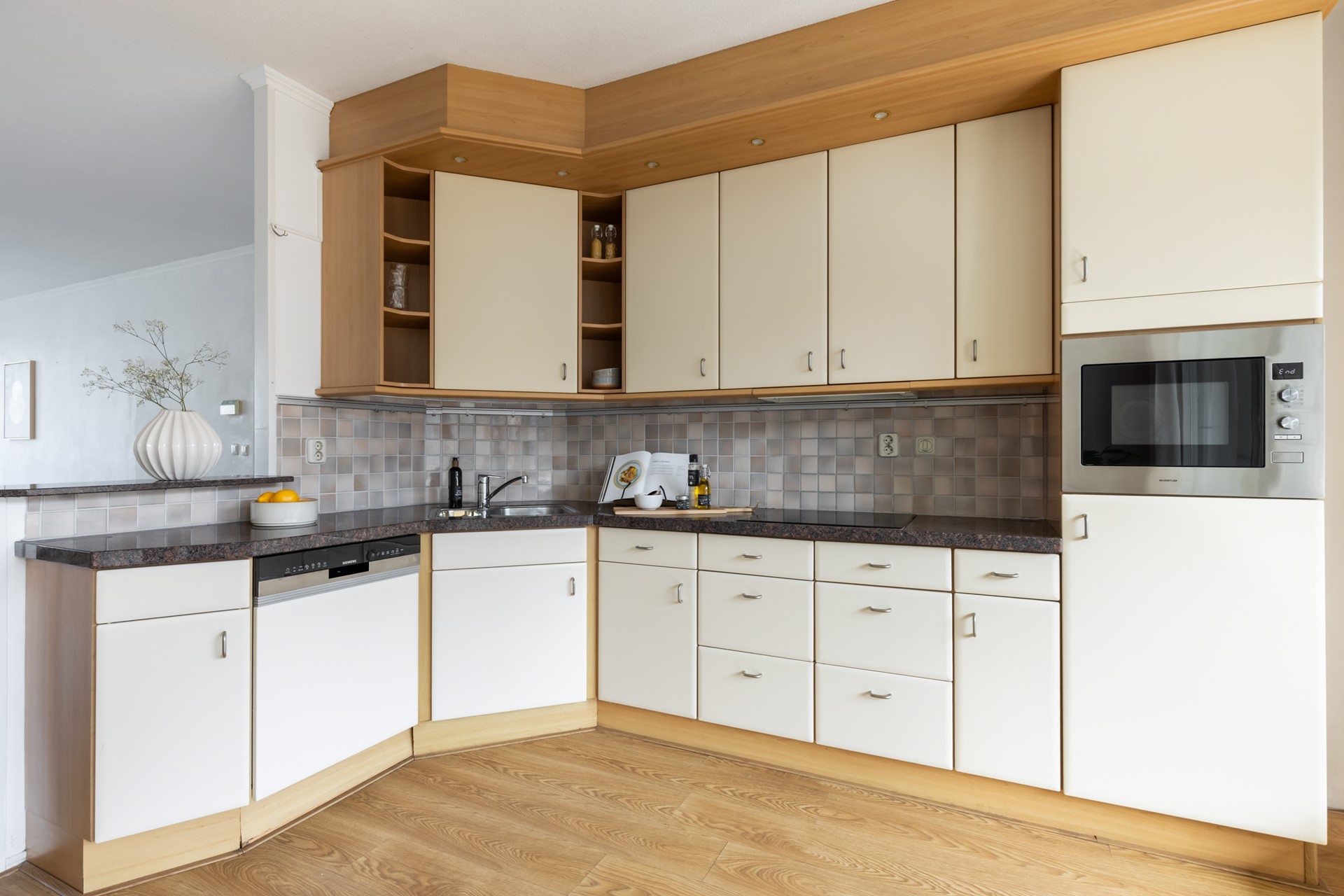 De open keuken is ingedeeld met een keukenblok, boven,- en onderkastjes, een 4 pits-inductiekookplaat, magnetron en een vaatwasmachine. De keuken geeft toegang tot het balkon.