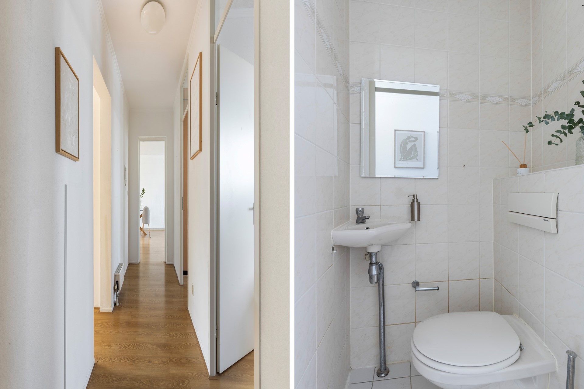 De hal geeft toegang tot de keuken (acherzijde) en de woonkamer (voorzijde).