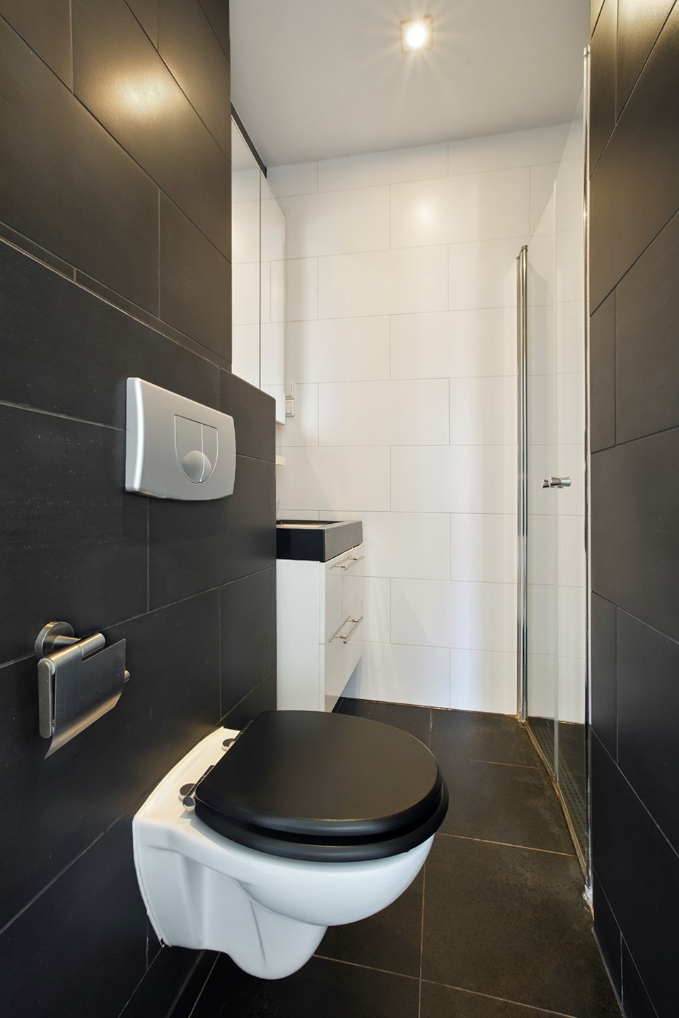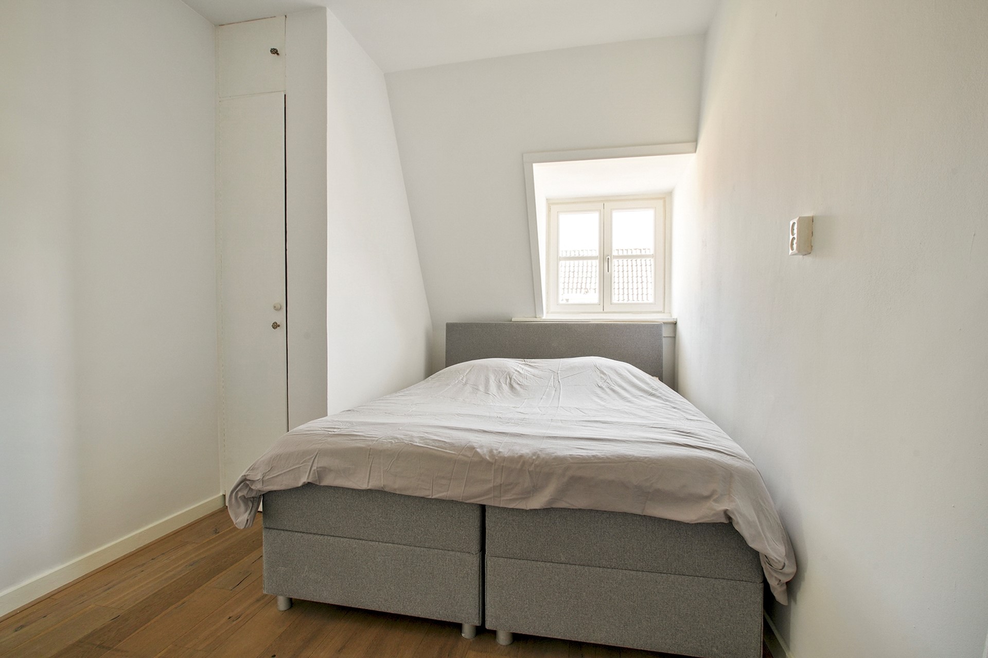 Aan de achterzijde bevindt zich een rustige slaapkamer met een ruime inbouwkast. In het midden van het appartement liggen de functioneel ingedeelde keuken (voorzien van inbouwapparatuur) en de badkamer met inloopdouche, wastafel en toilet.