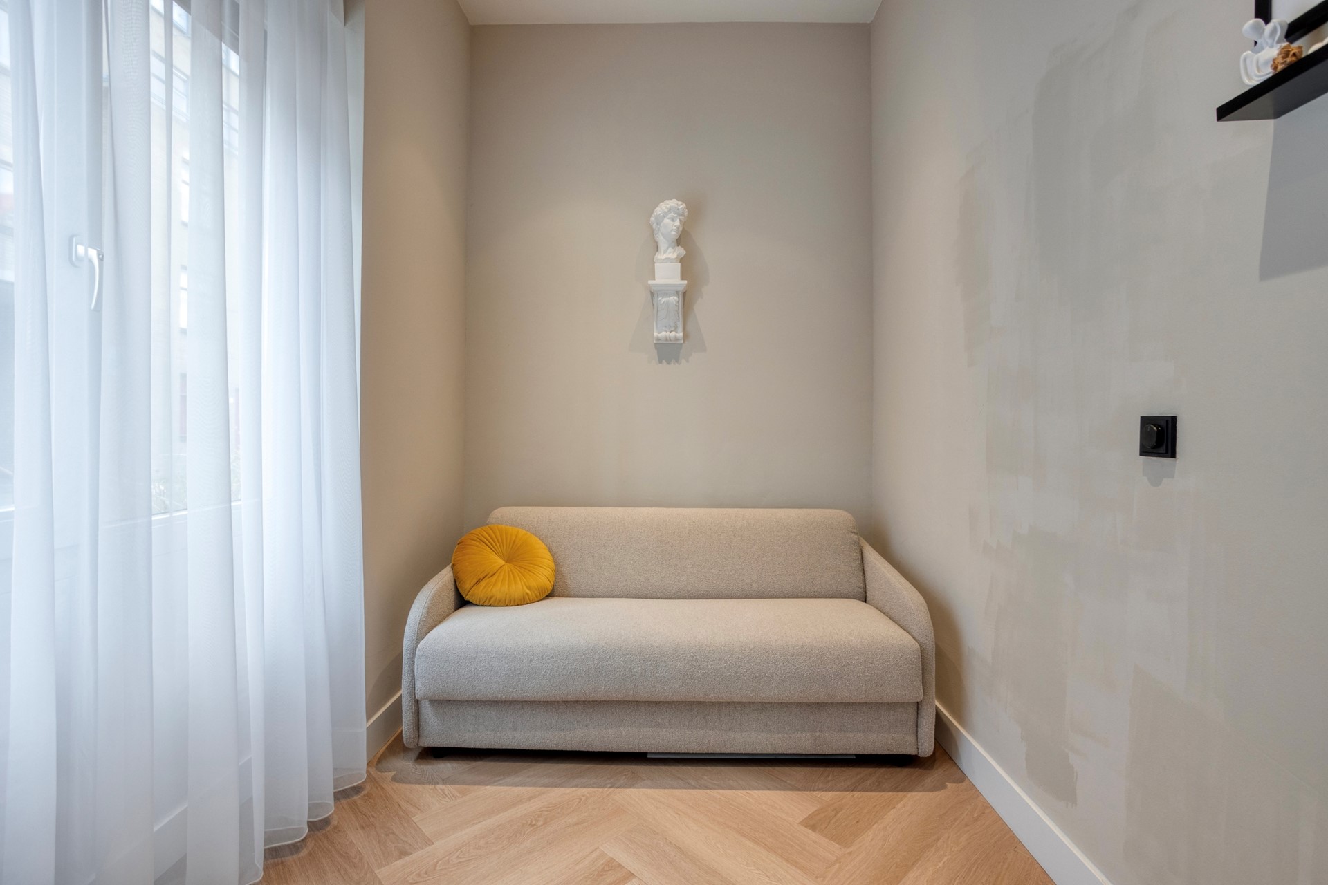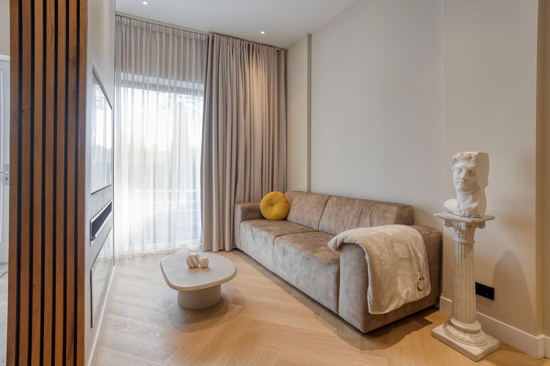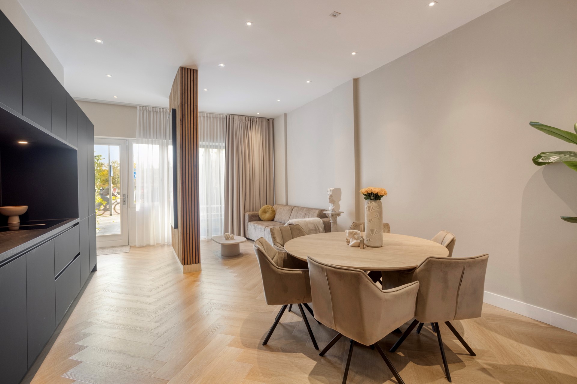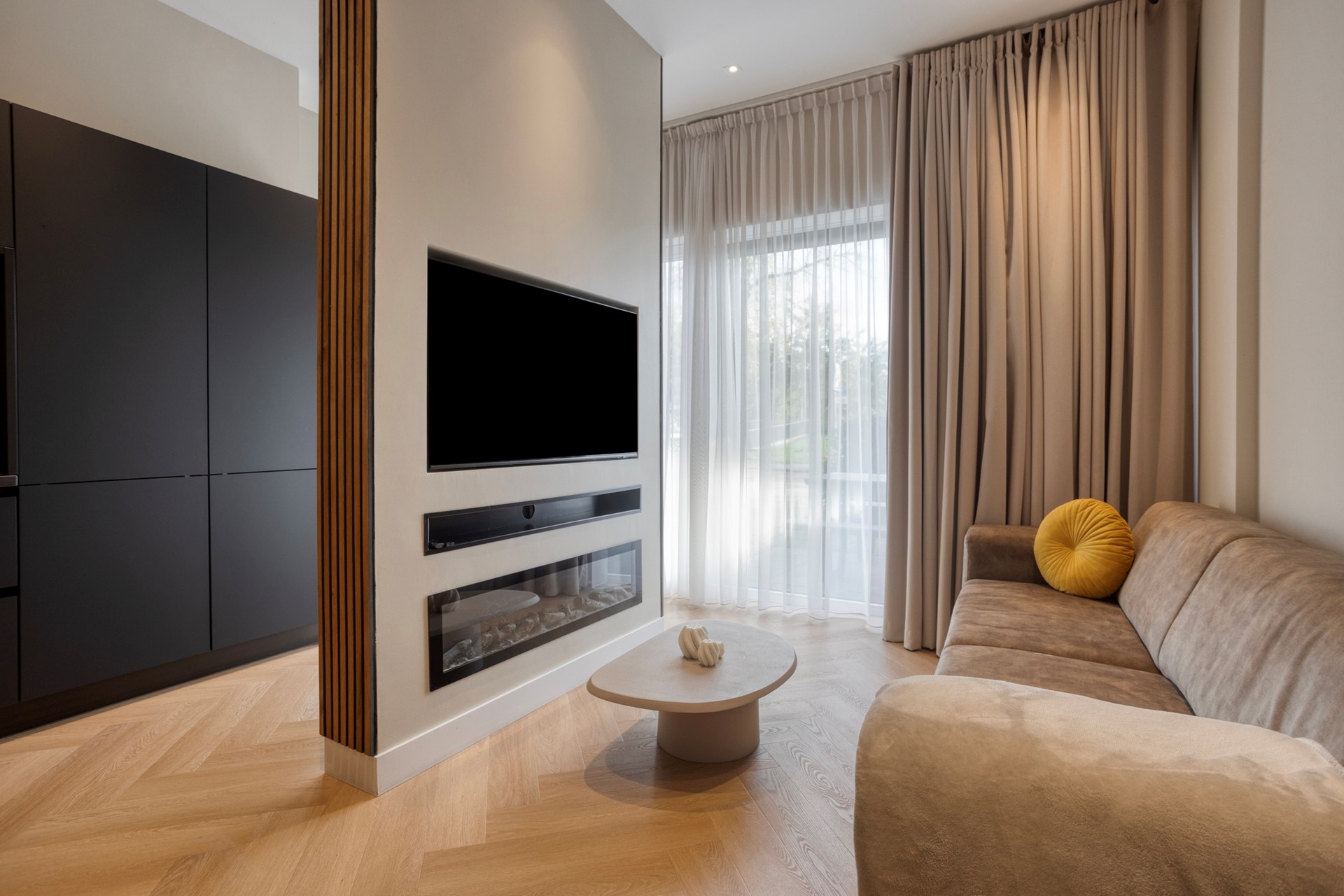 Via de privé-tuin stap je binnen in de lichte woonkamer met hoge plafonds (ca. 3 m) en grote ramen, wat zorgt voor een ruimtelijk en loftachtig gevoel. Blikvanger in de woonkamer is de cinewall met ingebouwde (elektrische) haard – strak vormgegeven, sfeervol en praktisch doordat alle media-apparatuur netjes is weggewerkt. De open keuken sluit hier naadloos op aan en is voorzien van een inductiekookplaat, vaatwasser, combimagnetron en koel-vriescombinatie. Dankzij de ruime opzet is er plek voor zowel een eethoek als een gezellige zithoek; het echte hart van de woning.