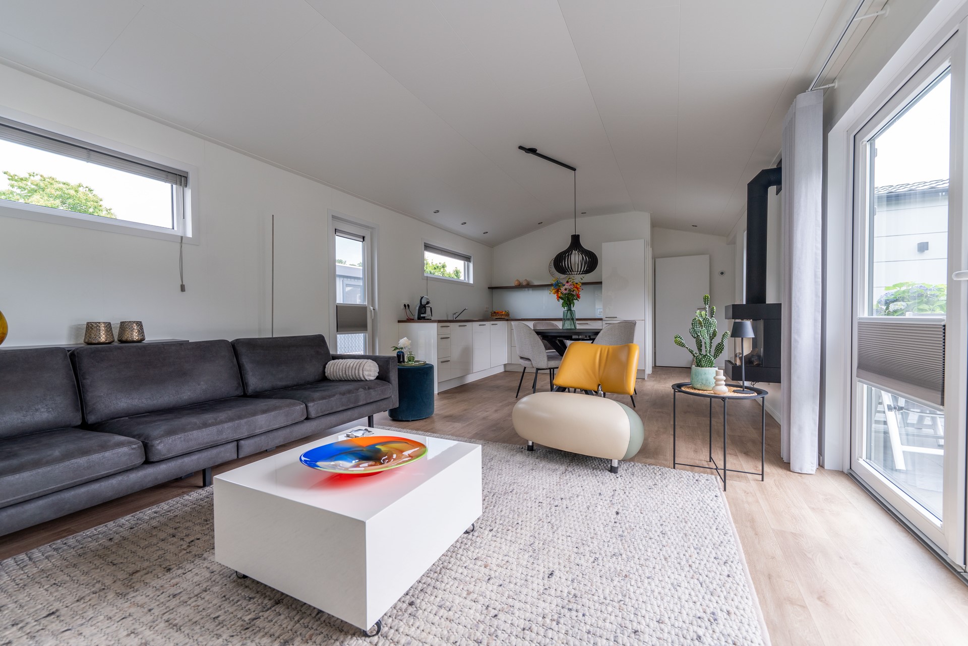 De woonkamer is aangenaam licht dankzij grote raampartijen en staat in open verbinding met de keuken. Dit zorgt voor een ruimtelijk geheel dat ideaal is voor zowel dagelijks gebruik als ontspannen momenten.