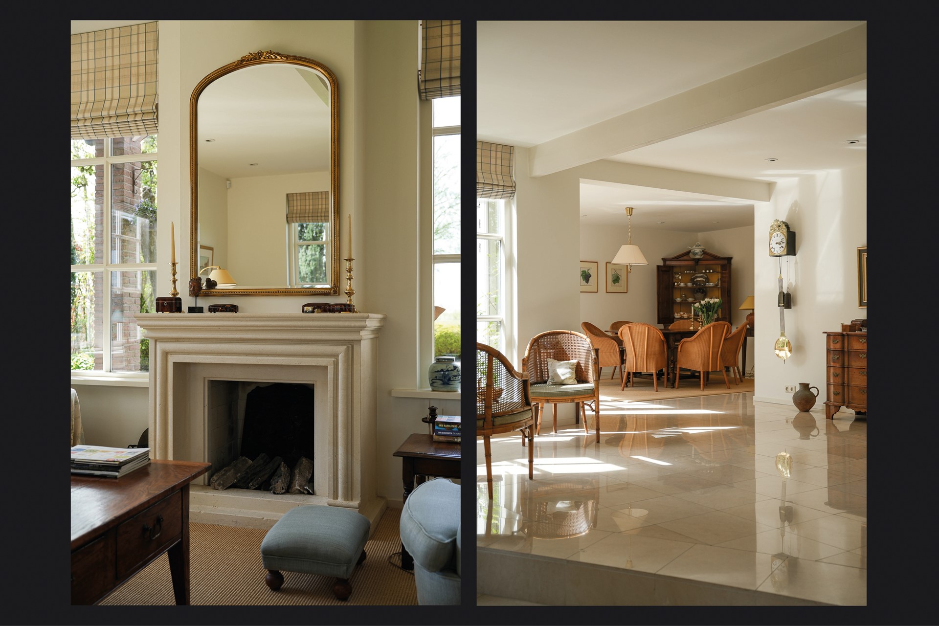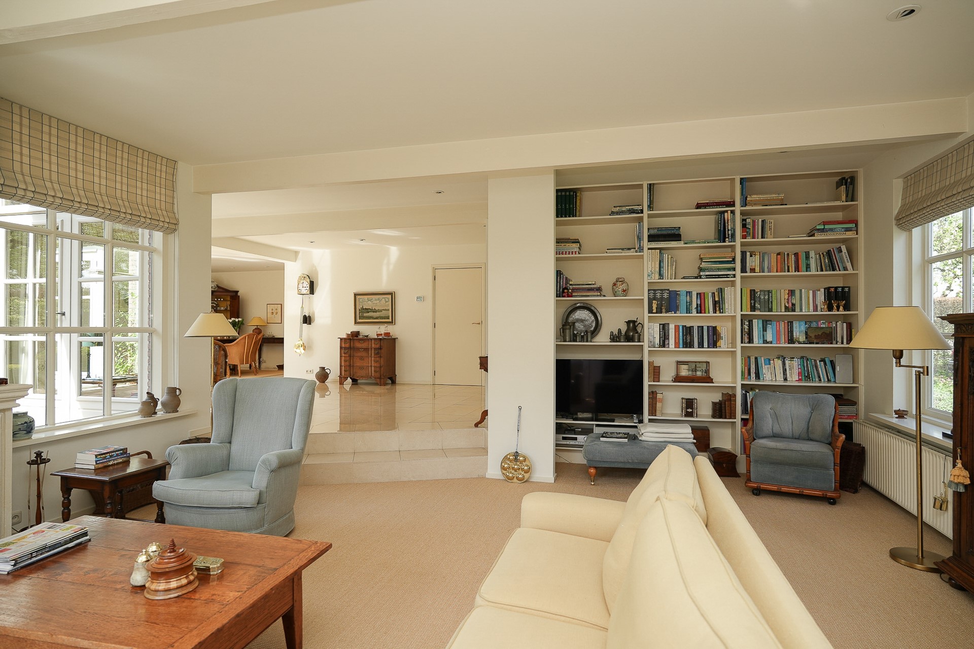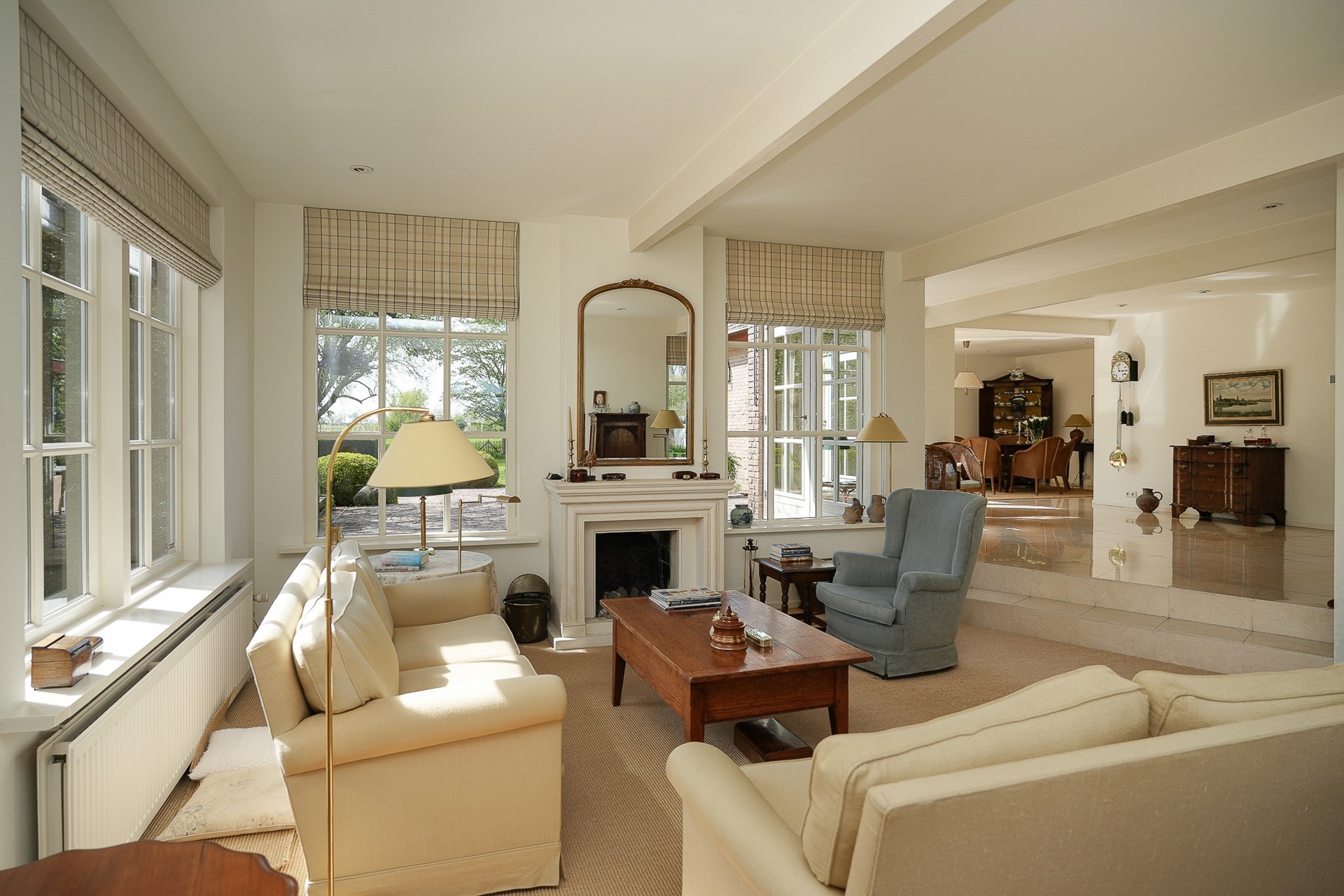 De woonkamer is rustig en licht, met meerdere grote ramen aan drie zijden en een klassieke gas-openhaard met kalkstenen schouw. Een ingebouwde boekenkast geeft de ruimte extra diepte.