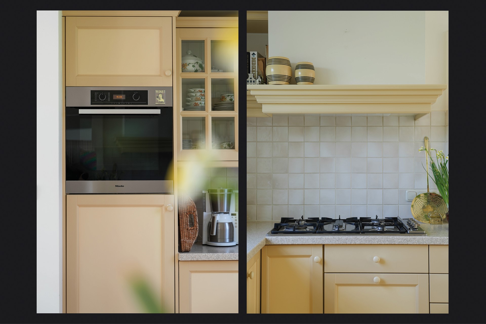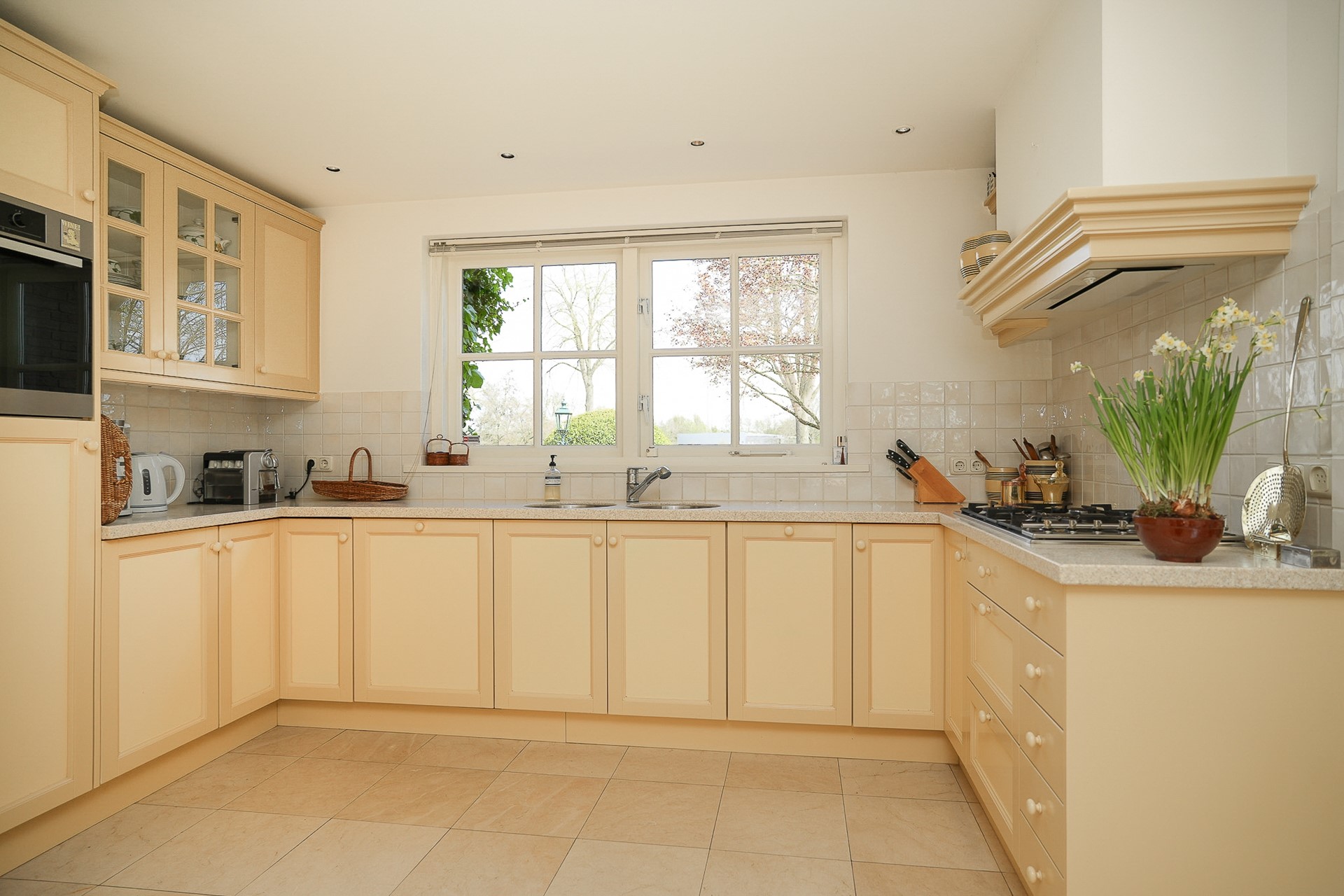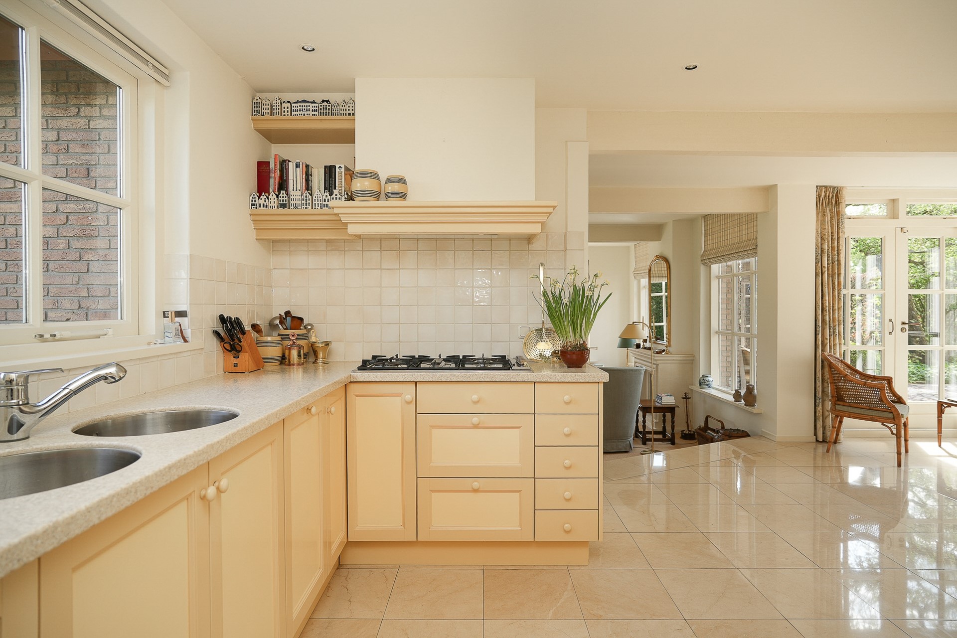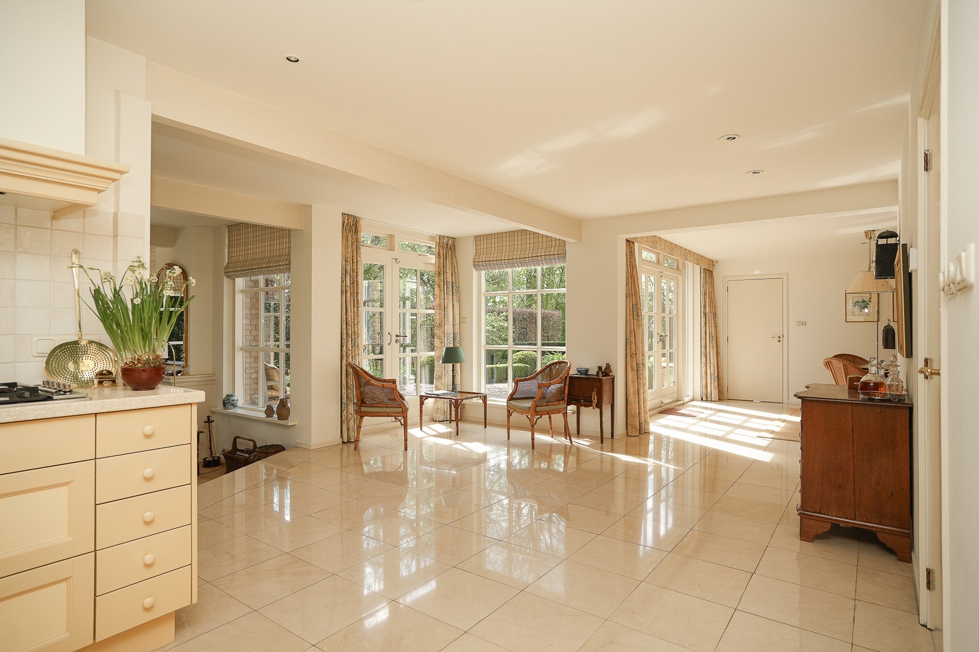 Via de hal kom je in het centrale leefgedeelte. De woonkeuken vormt het kloppende hart van de woning: een grote, lichte ruimte met een keukenblok in een hoek-opstelling, voorzien van Miele apparatuur zoals een oven, vaatwasser, koelkast (Liebherr), SMEG gaskookplaat met afzuigkap, dubbele spoelbak en volop kast- en werkruimte. De vloer is uitgevoerd in marmer met vloerverwarming.