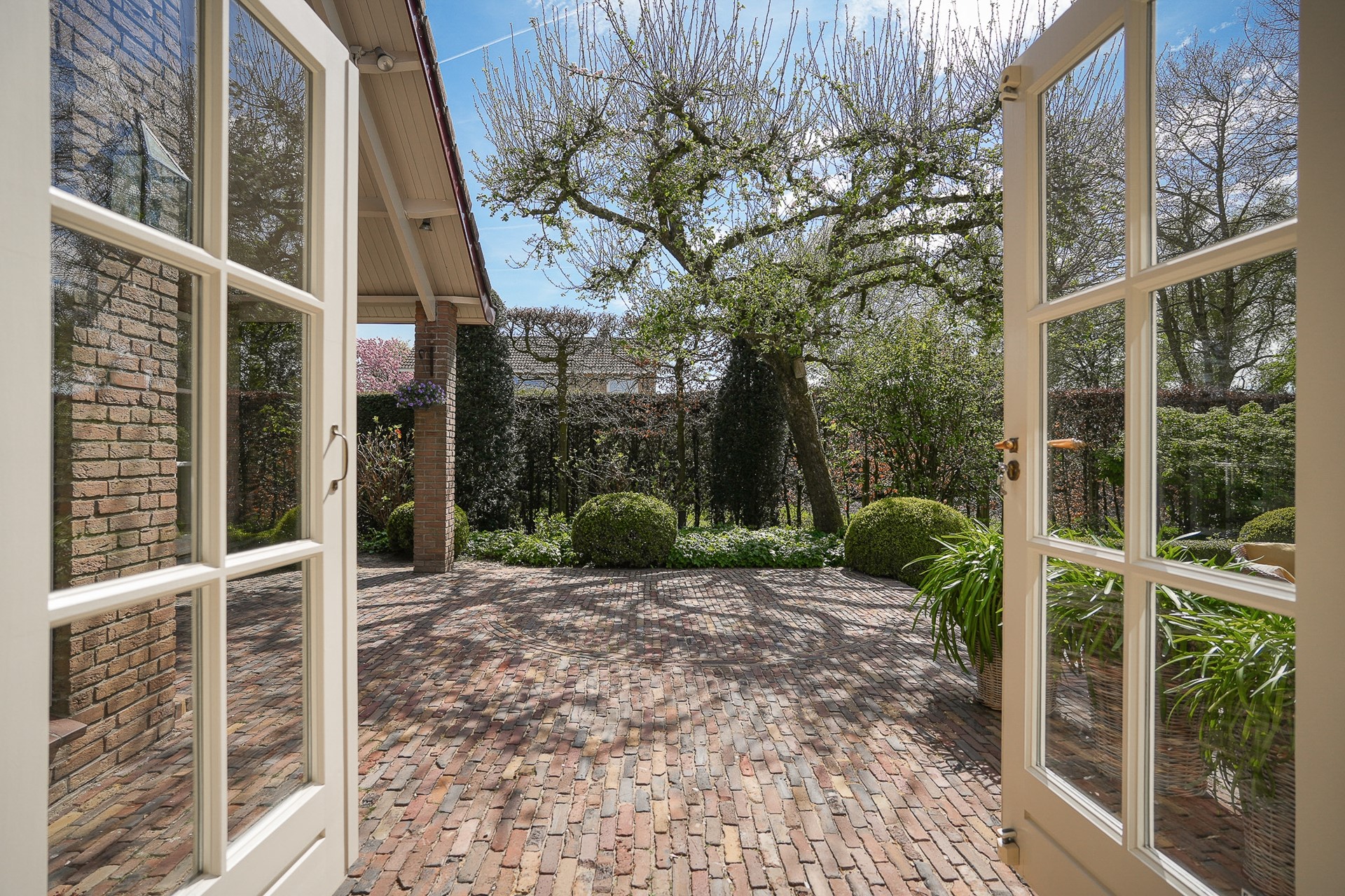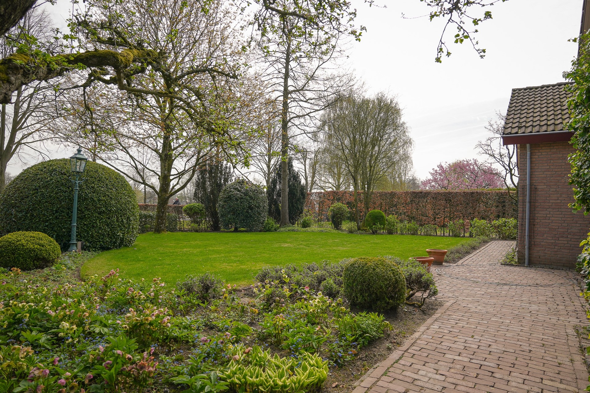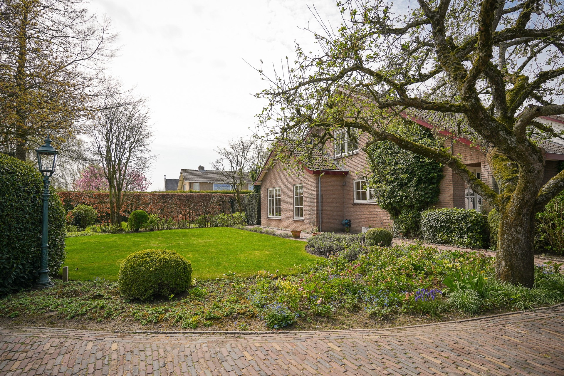 De tuin is waar deze woning tot zijn recht komt. Aan de voorzijde een verzorgde tuin met waaltjesbestrating, strak gesnoeide beukhagen en een mooie oude appelboom over het garagepad.