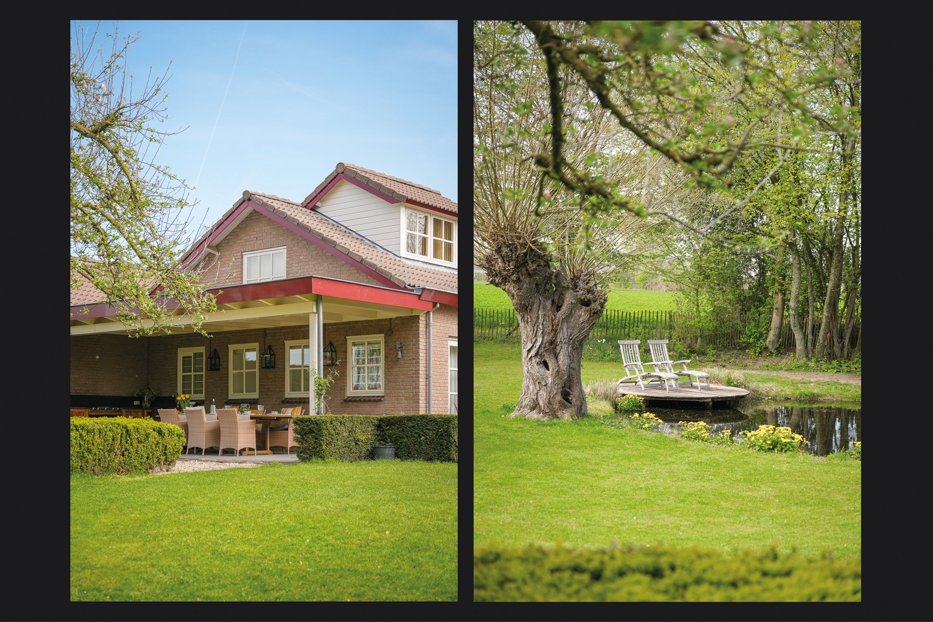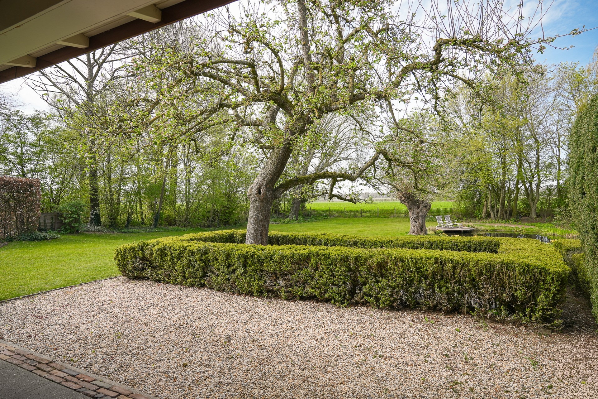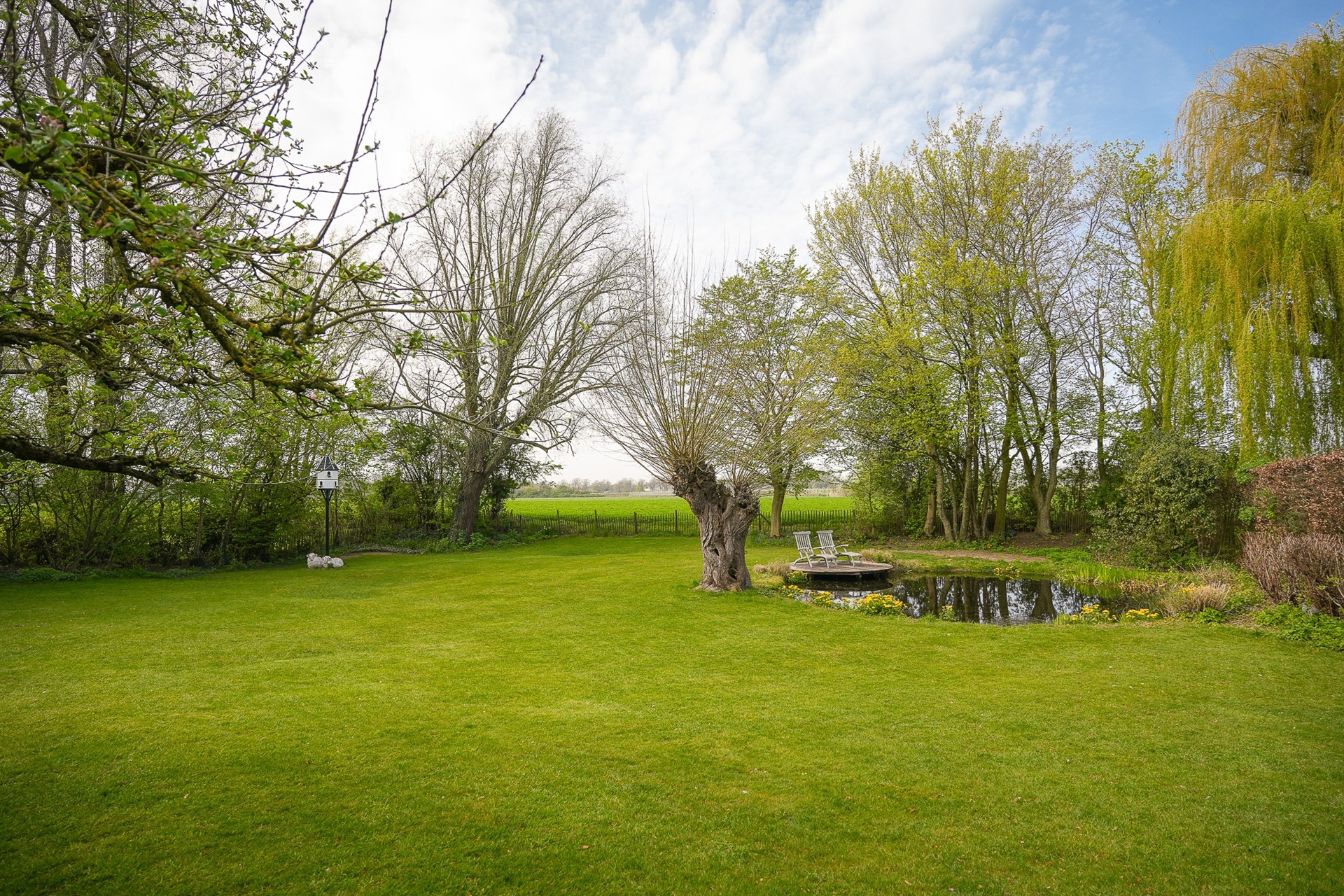 Verder in de tuin liggen een vijver met houten vlonder en zitplek met een solitaire knotwilg en een treurwilg die het achterste deel van de tuin sierlijk afsluit. Een grote gazonpartij met appelbomen maakt het geheel compleet. Achterin grenst het perceel direct aan de open landerijen.