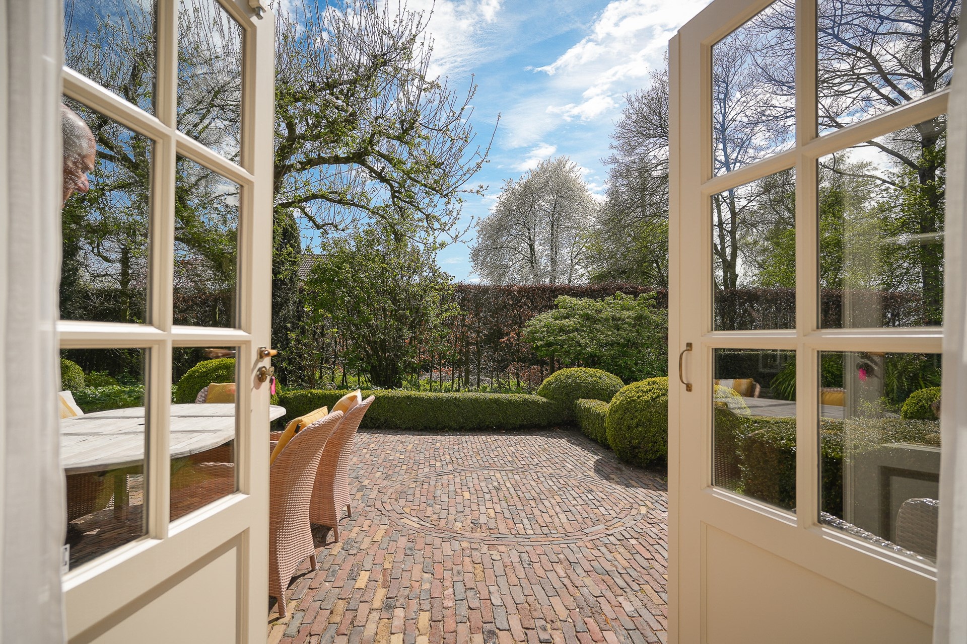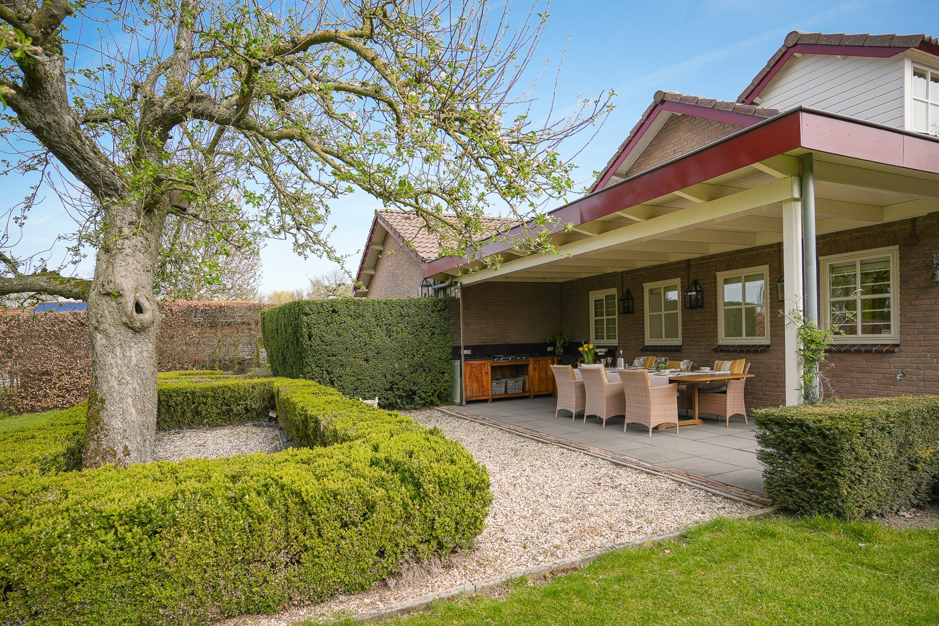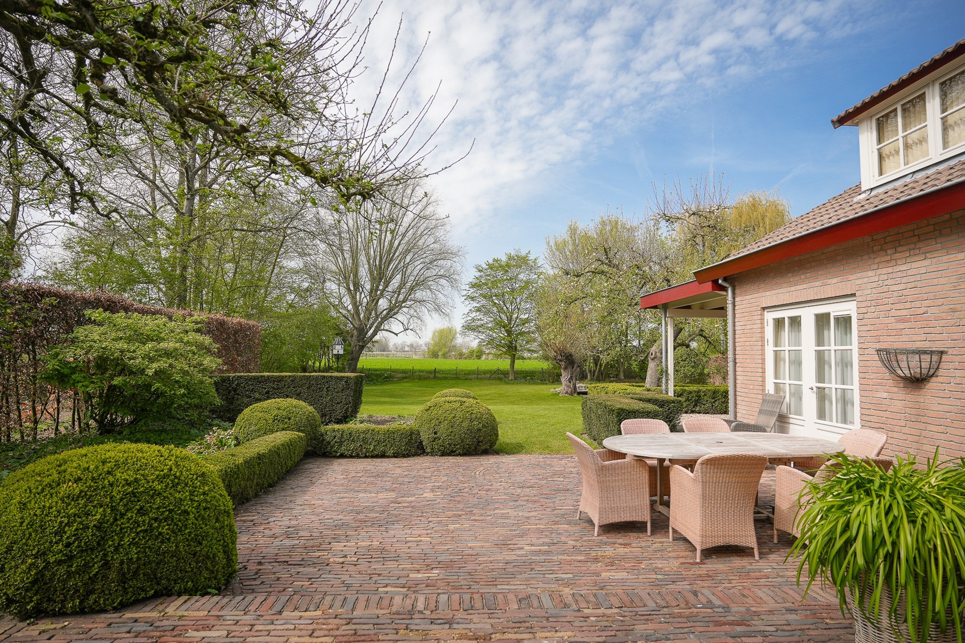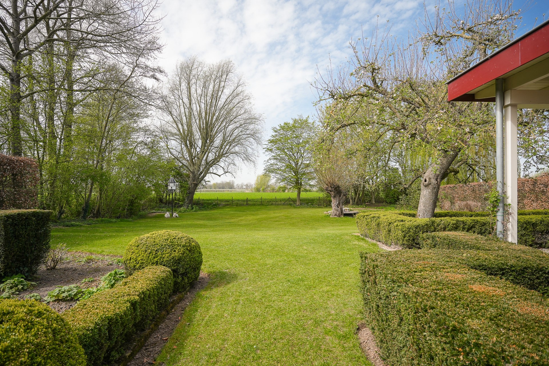Verder in de tuin liggen een vijver met houten vlonder en zitplek met een solitaire knotwilg en een treurwilg die het achterste deel van de tuin sierlijk afsluit. Een grote gazonpartij met appelbomen maakt het geheel compleet. Achterin grenst het perceel direct aan de open landerijen.