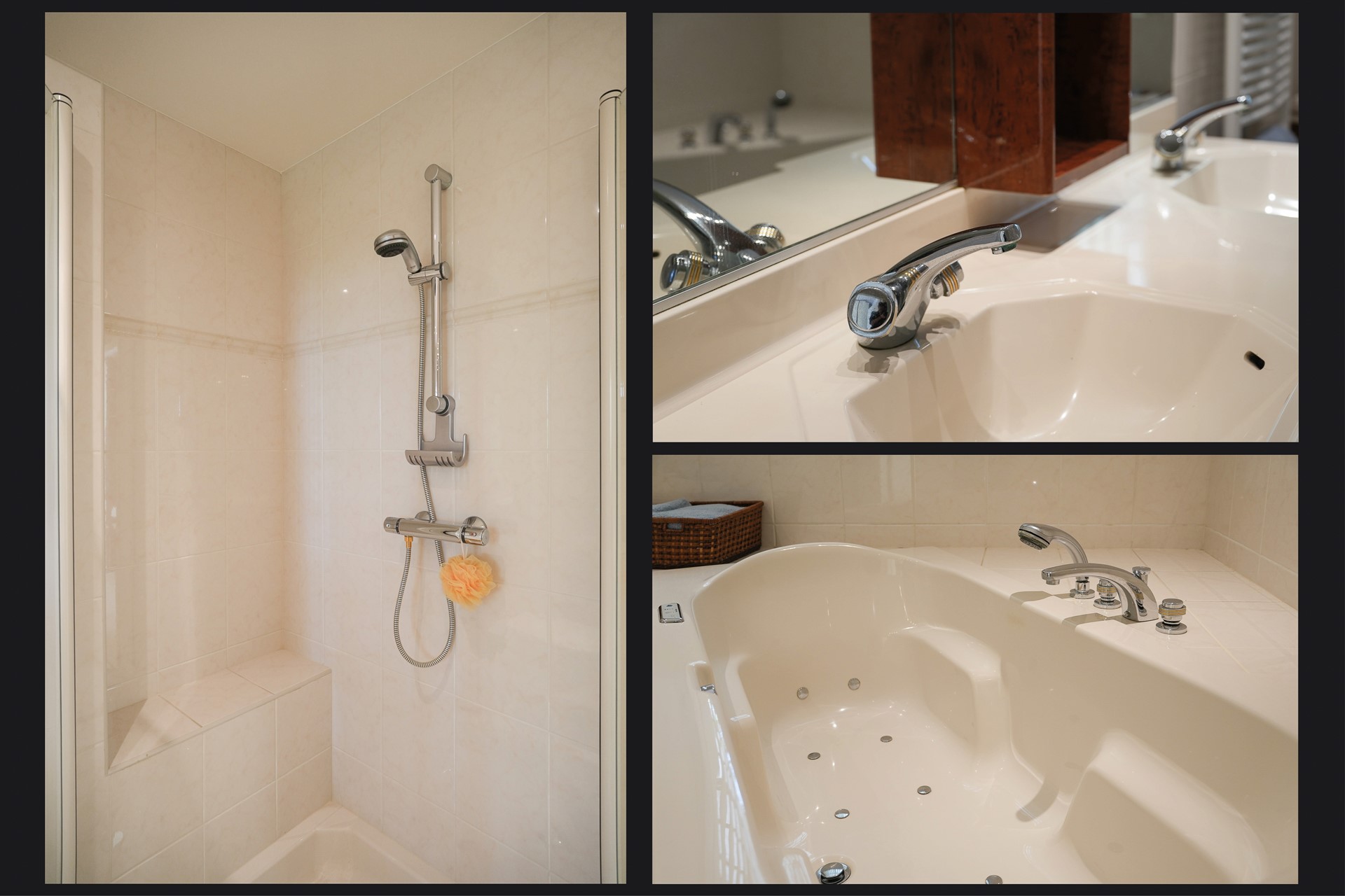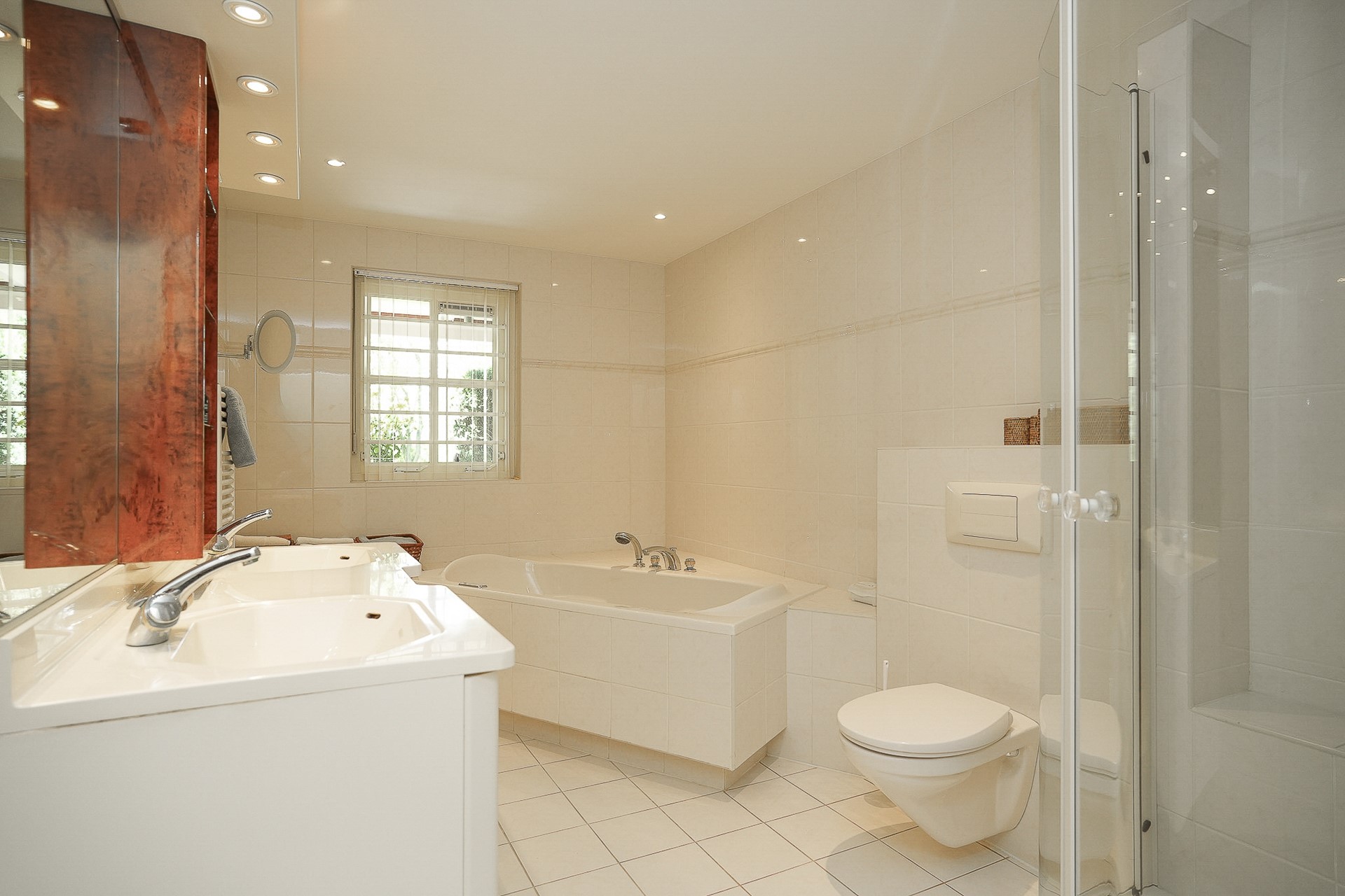 Op de begane grond bevindt zich een ruime slaapkamer. De grote slaapkamer heeft openslaande deuren naar de tuin, vloerbedekking en een ingebouwde kastenwand. De badkamer, direct grenzend aan de slaapkamer, is voorzien van een ligbad met whirlpoolfunctie, een inloopdouche, toilet en een wastafelmeubel met twee wasbakken.