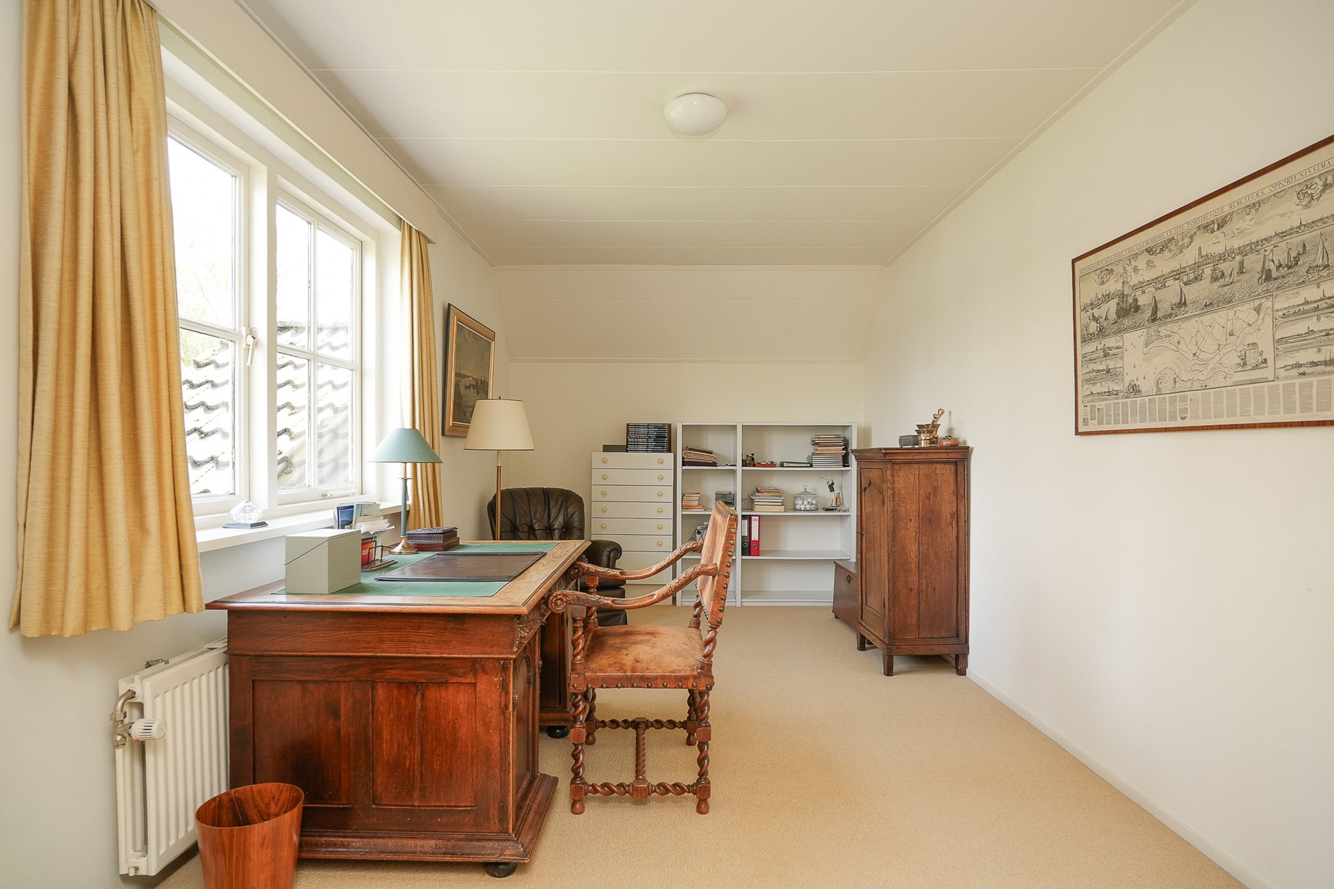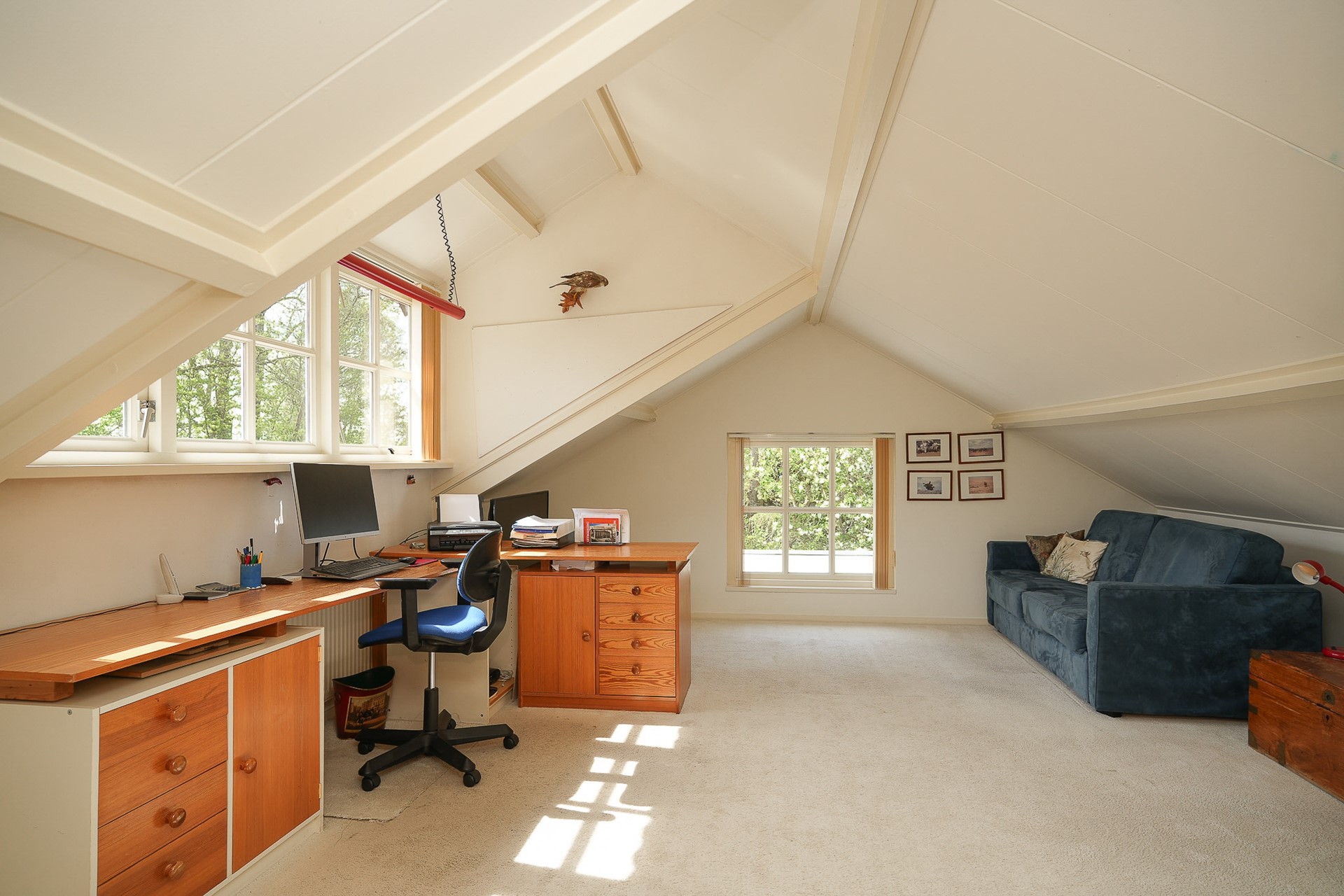 Boven het achterste gedeelte tref je wederom een grote, de derde, slaapkamer op deze etage. Momenteel in gebruik als studeerkamer met zithoek, maar net zo geschikt als slaapkamer, logeer- of hobbyruimte. De open kapconstructie met zichtbare spanten en ramen aan twee zijden geven de ruimte een eigen karakter. Door de dakkapel is het een zeer lichte kamer.