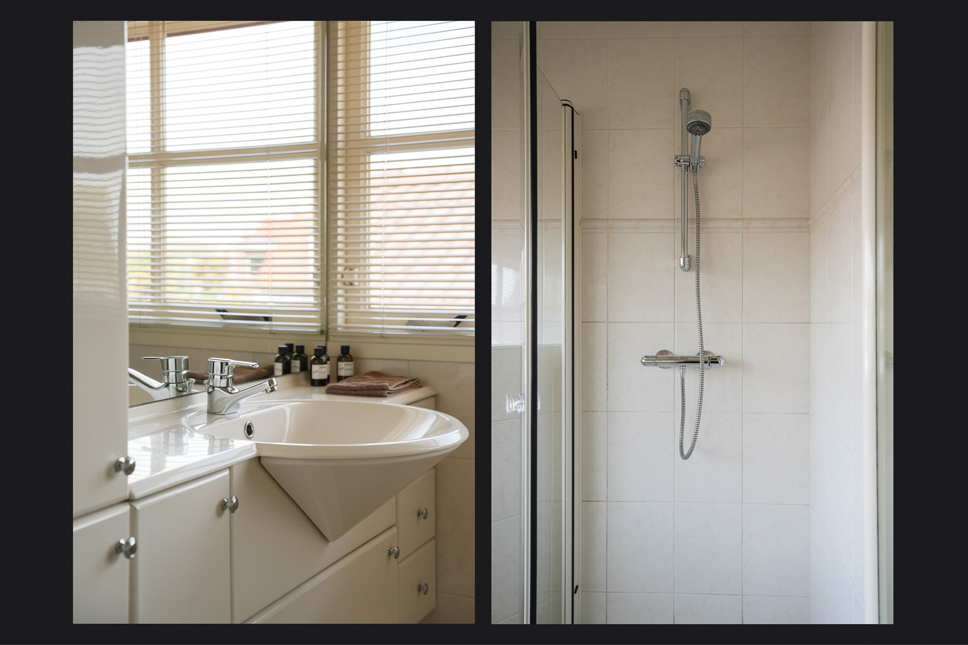 Tegenover deze tweede slaapkamer is een badkamer. Deze badkamer is voorzien van een inloopdouche, toilet en ruim wastafelmeubel.