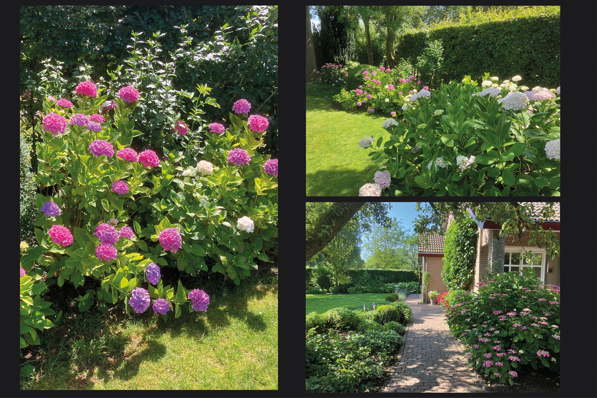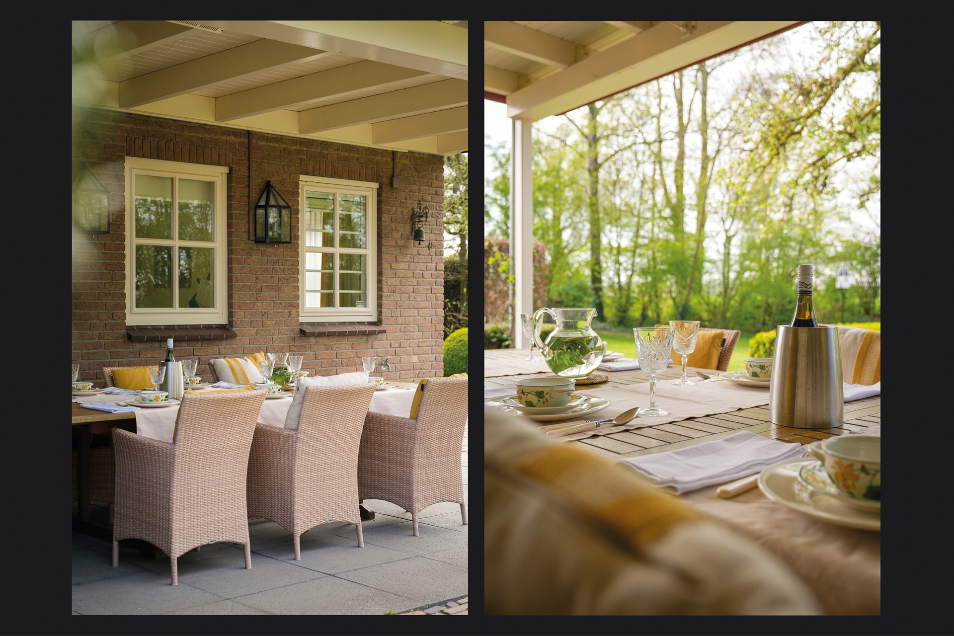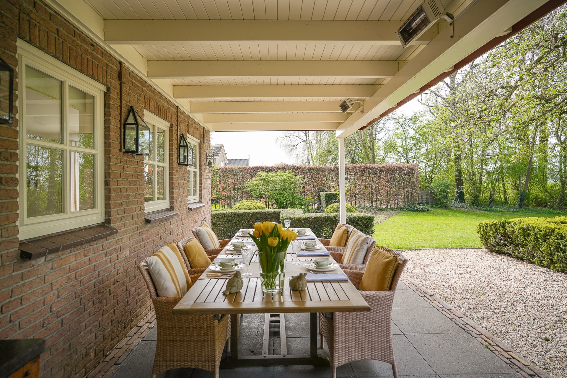 Direct achter de woning ligt een royaal overdekt terras met een ingebouwde buitenkeuken met een Boretti gaskookplaat met teppanyaki, spoelbak en werkblad in Belgisch hardsteen, en een verwarmingselement in het plafond. Hier buitenkoken en eten terwijl de avond valt: het kan hier. Vanuit de woning heb je toegang tot een tweede terras met waaltjes, omzoomd door borders met meerdere soorten hortensia's die in de zomer volop kleur geven.