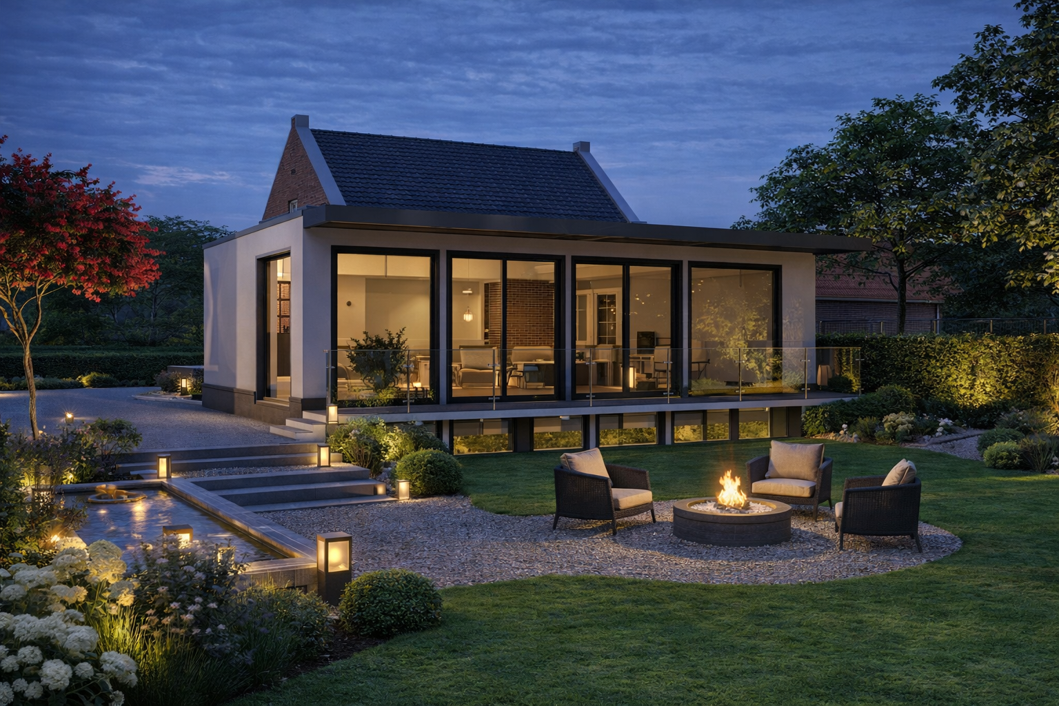 Op het perceel staat momenteel een voormalige loods. Voor deze loods is al een vergunning verleend om deze te renoveren en uit te breiden tot een moderne, comfortabele woning met aanbouw aan de achterzijde en een souterrain. De impressies die je hier ziet geven een beeld van wat hier gerealiseerd kan worden: een karaktervolle woning met eigentijdse architectuur, grote glaspartijen en een sterke verbinding tussen binnen en buiten.