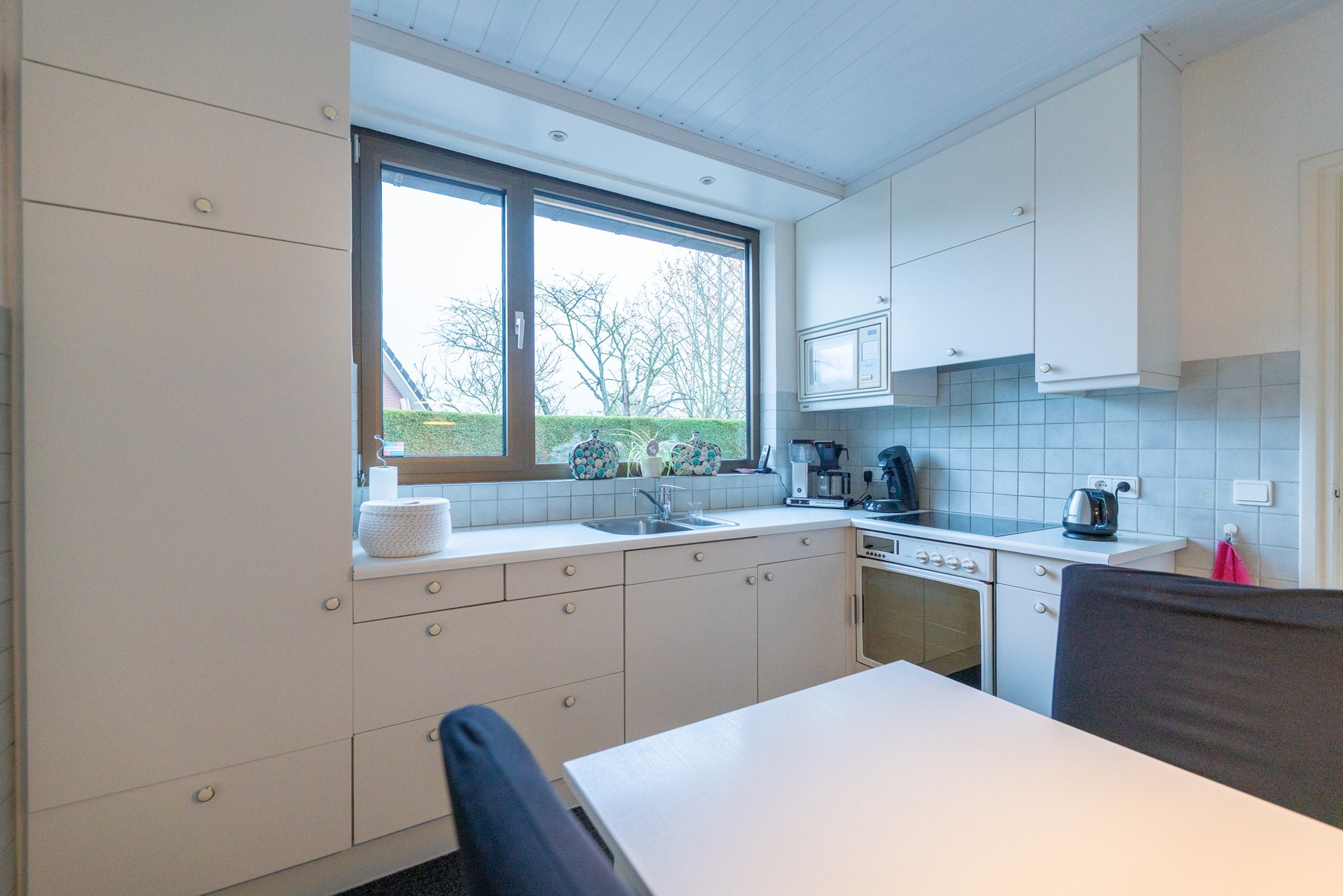 De royale keuken biedt volop werk- en opbergruimte en is uitgerust met een keramische kookplaat, oven, afzuigkap, vaatwasser en magnetron. Dankzij de ruime opzet is er voldoende plaats voor een ontbijthoek.