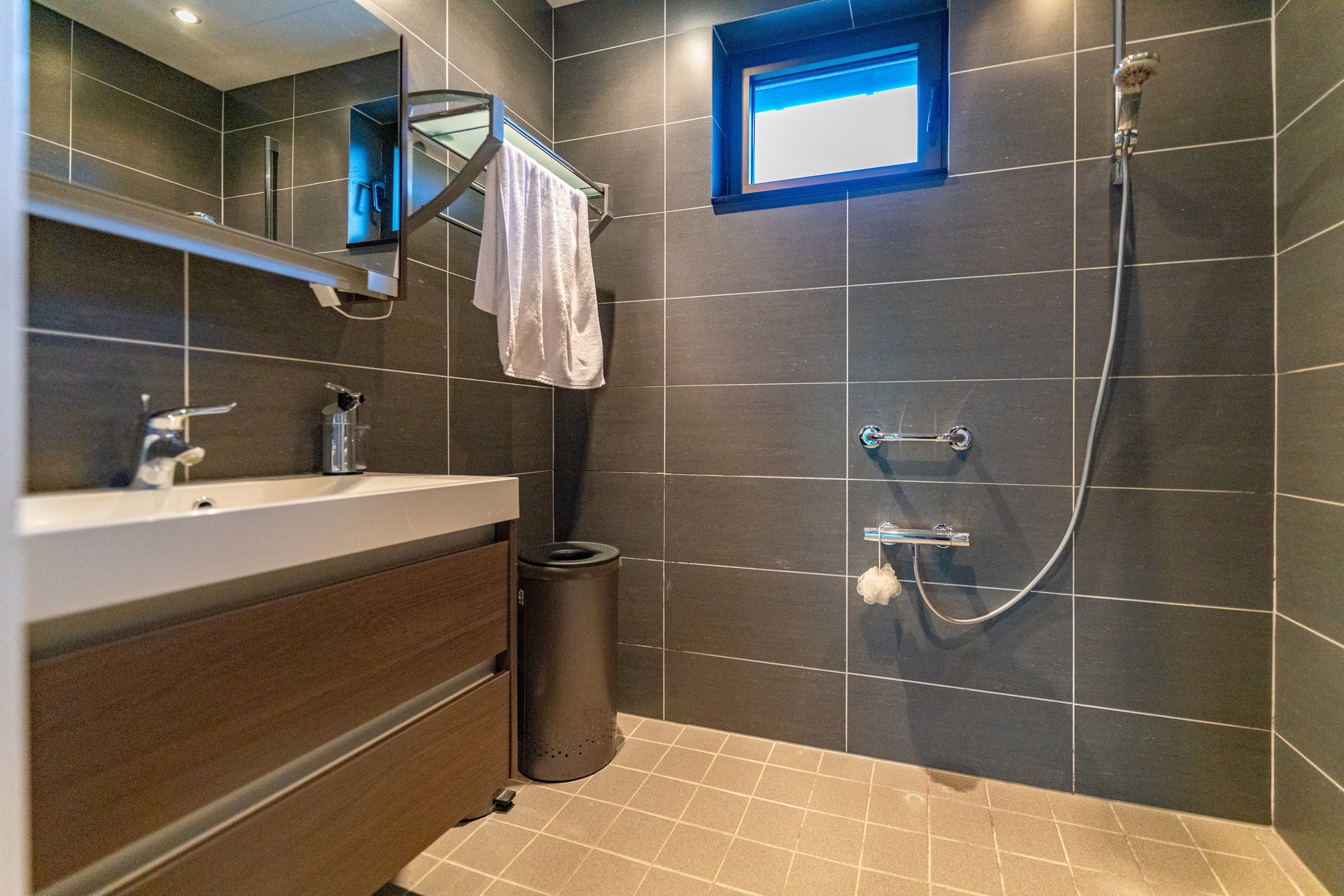 De moderne, volledig betegelde badkamer beschikt over een dubbele wastafel, ruime doucheruimte, designradiator en vloerverwarming.