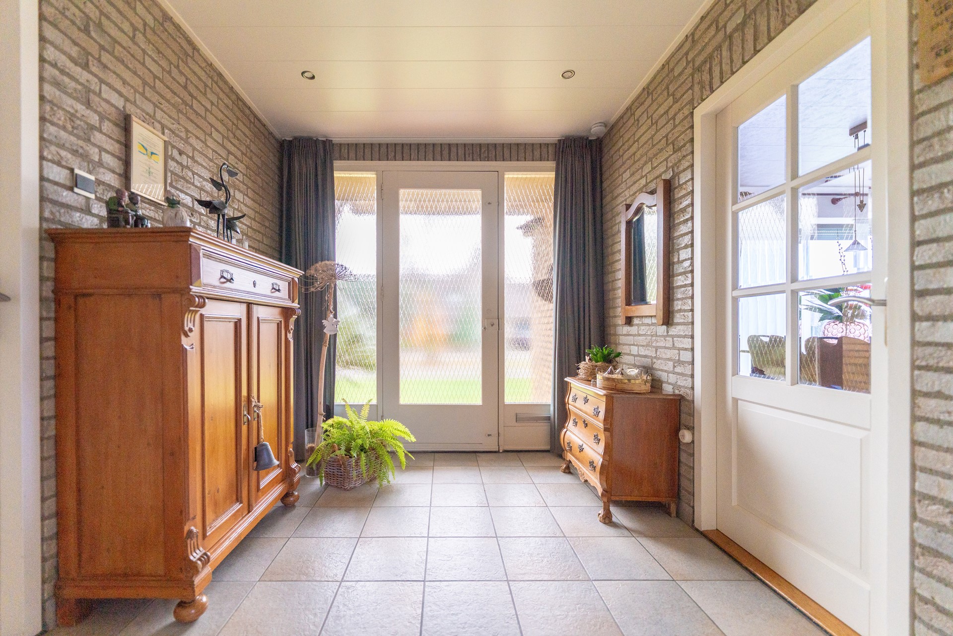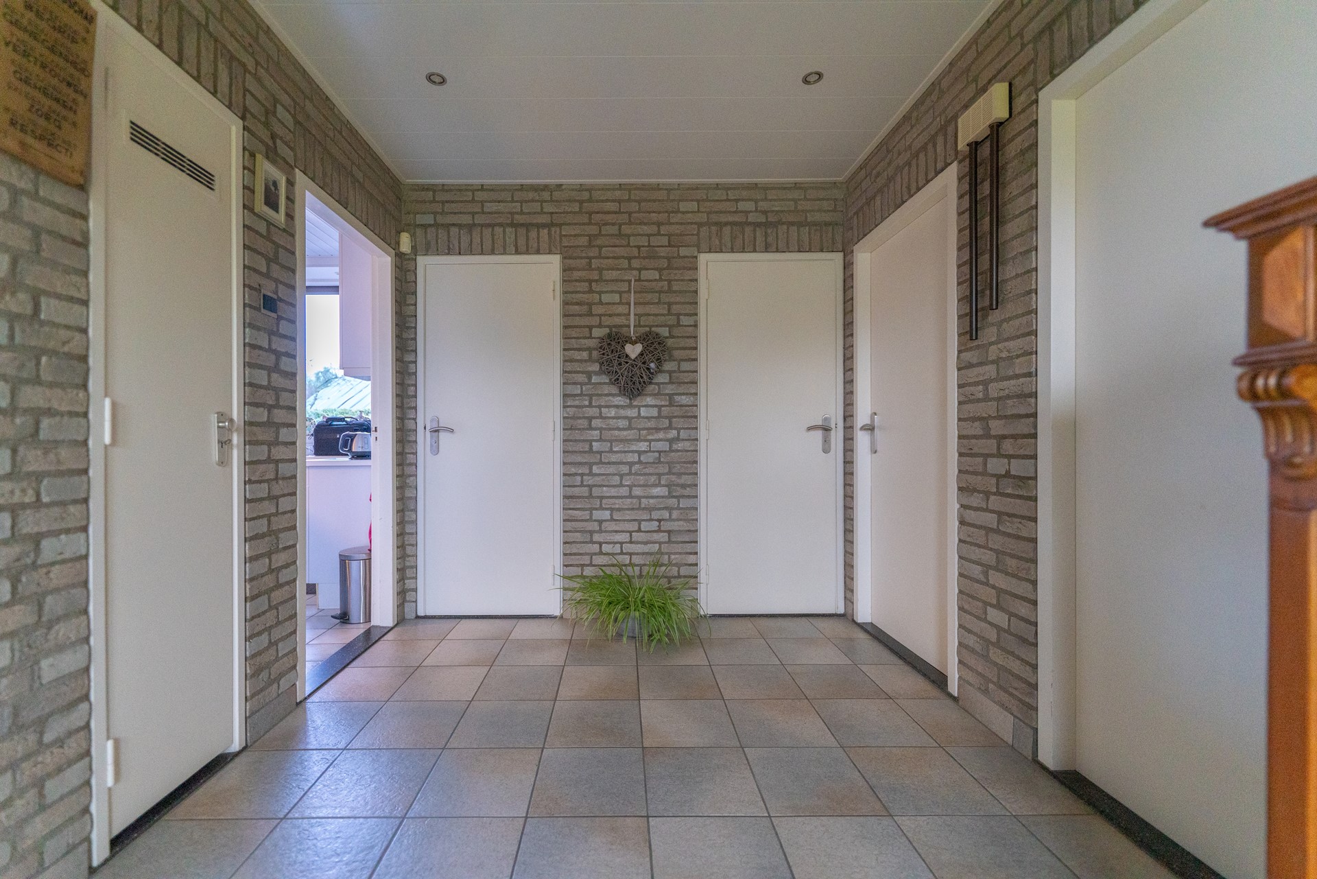 De ruime, centrale hal geeft toegang tot de woonkamer, keuken, slaapkamers en het toilet.