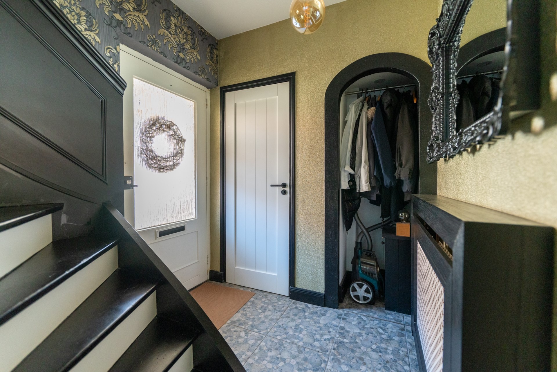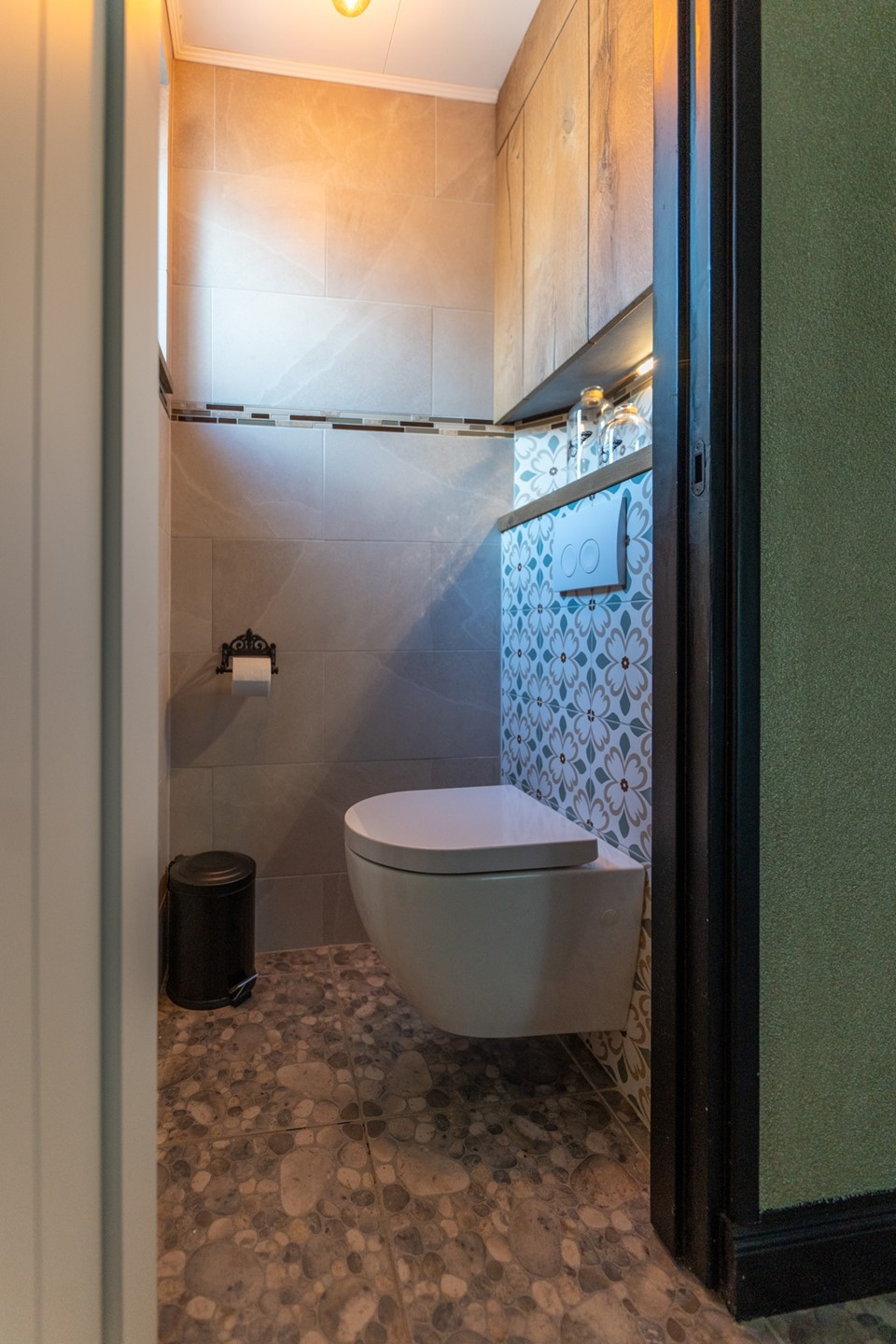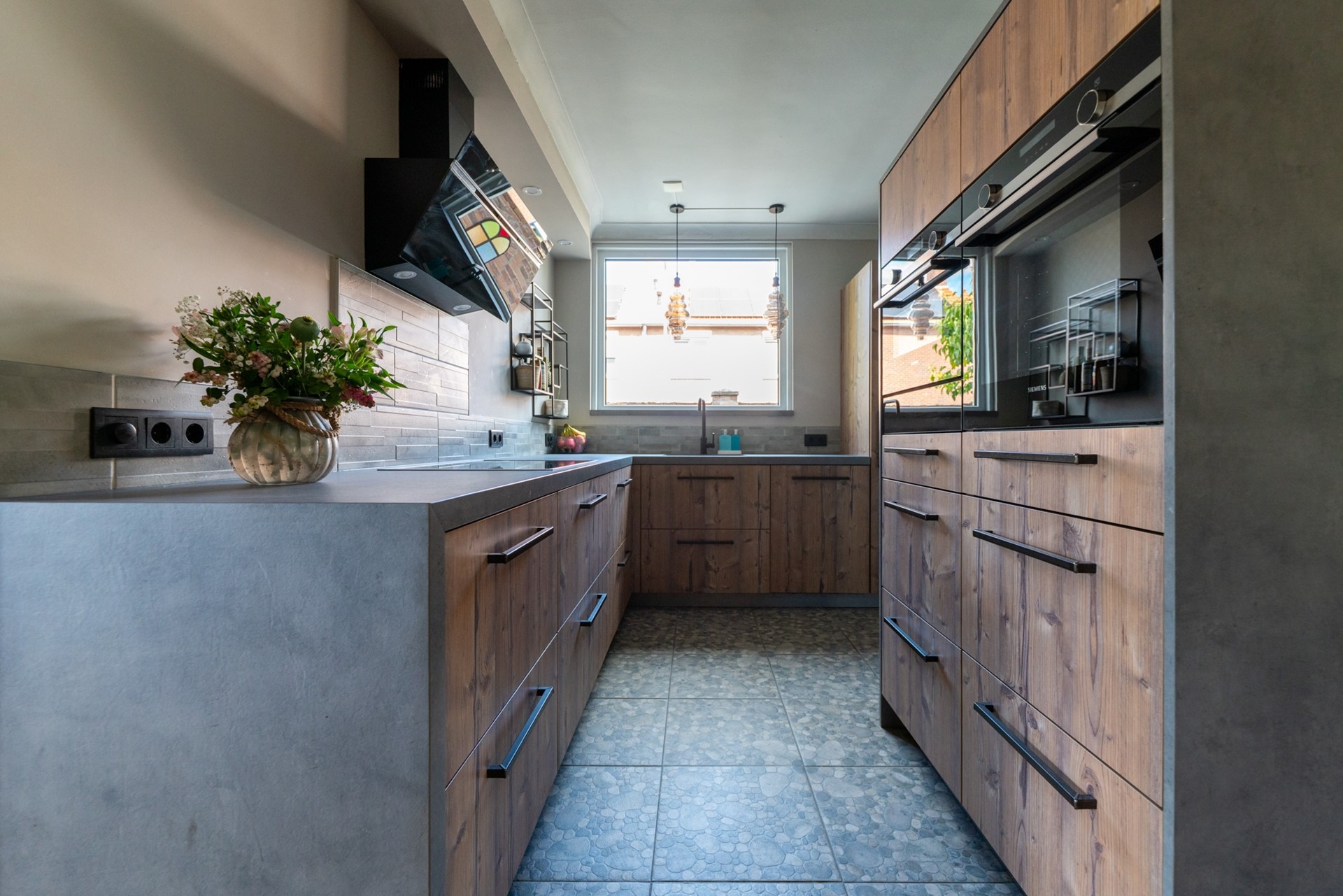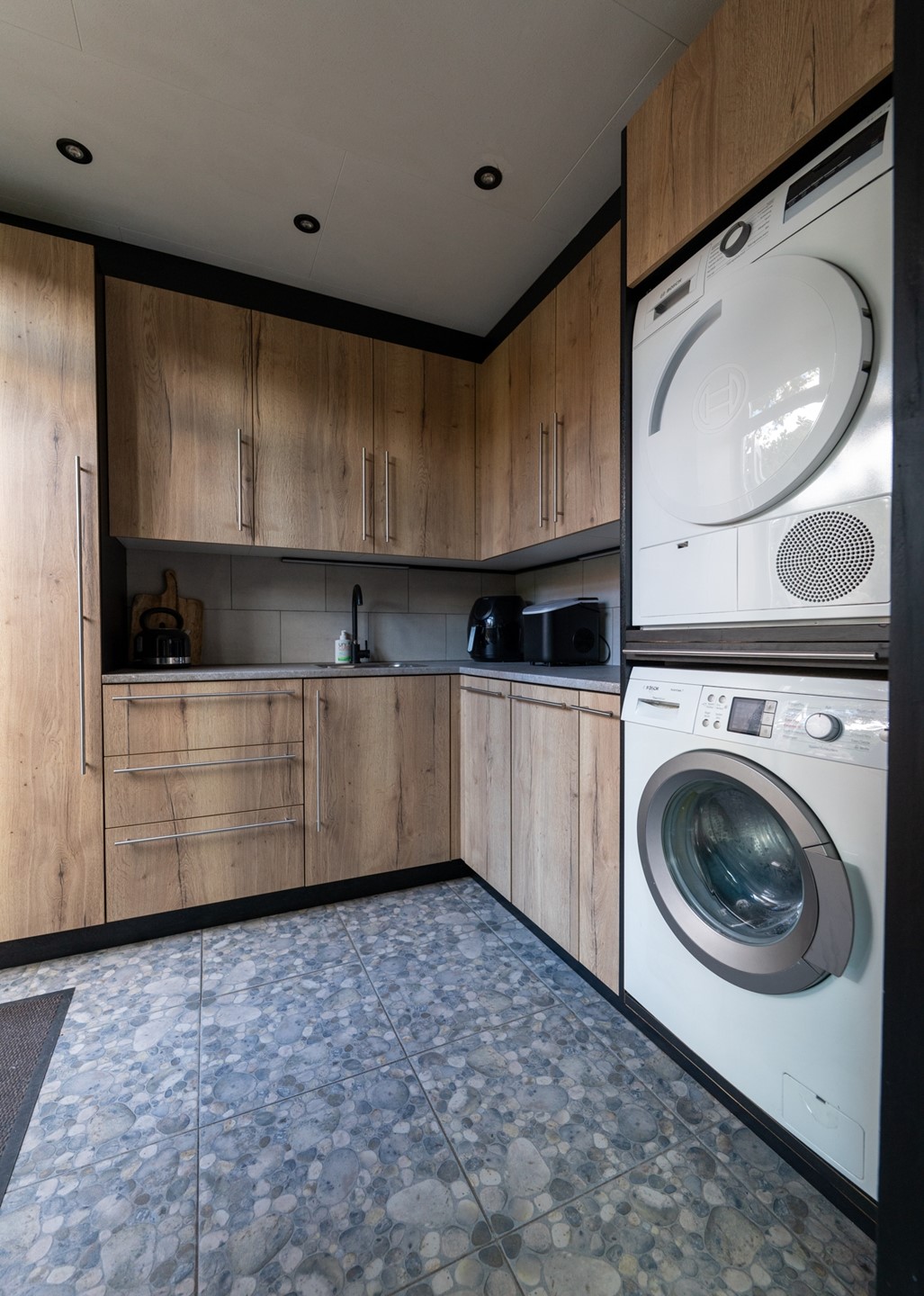 De praktische bijkeuken biedt extra kastruimte en plek voor wasmachine en droger, die mooi zijn weggewerkt. Vanuit hier heb je toegang tot de tuin.