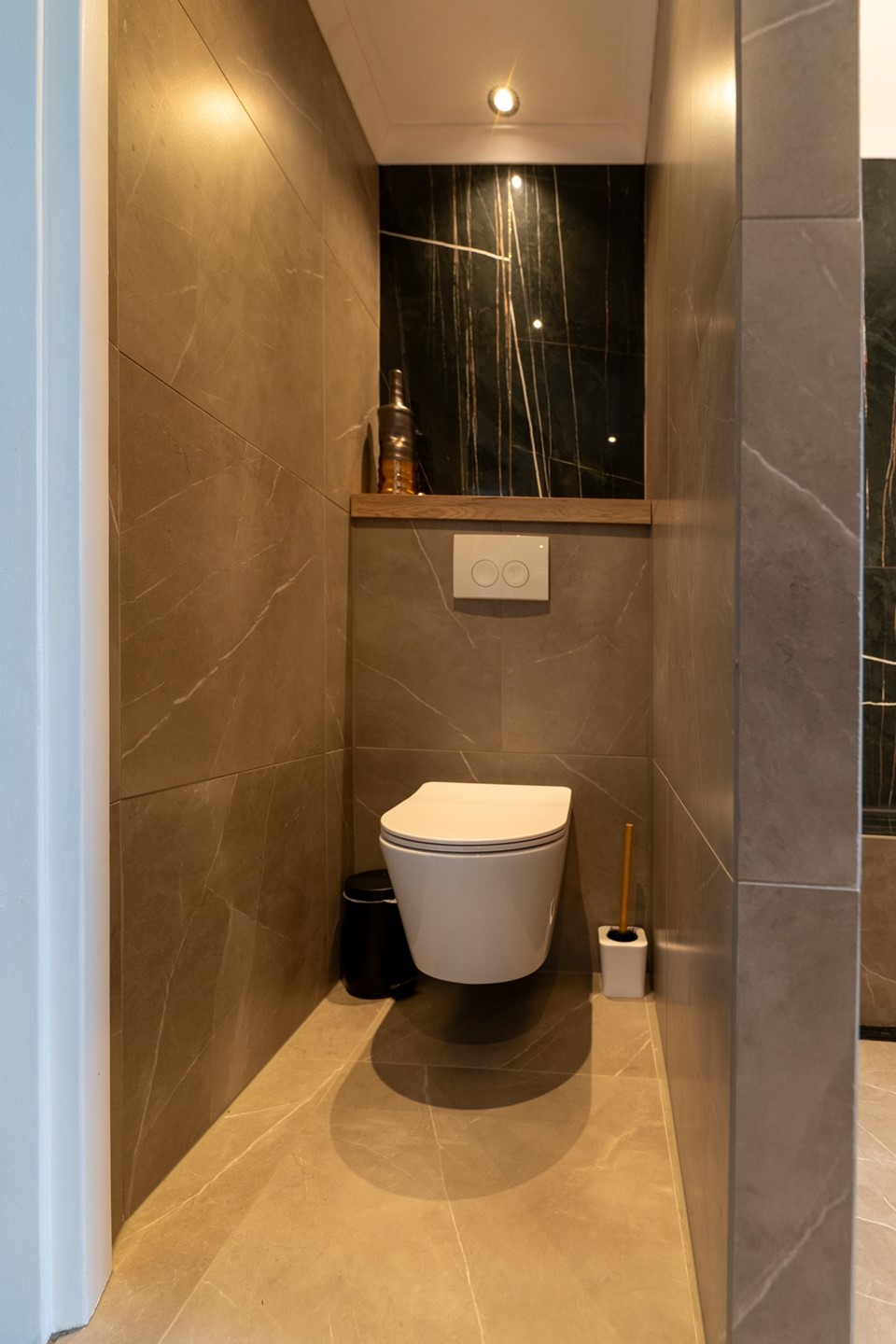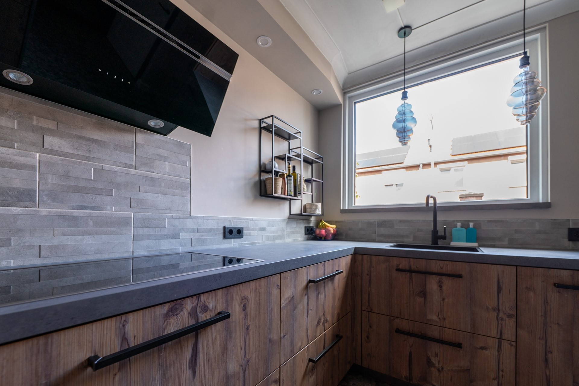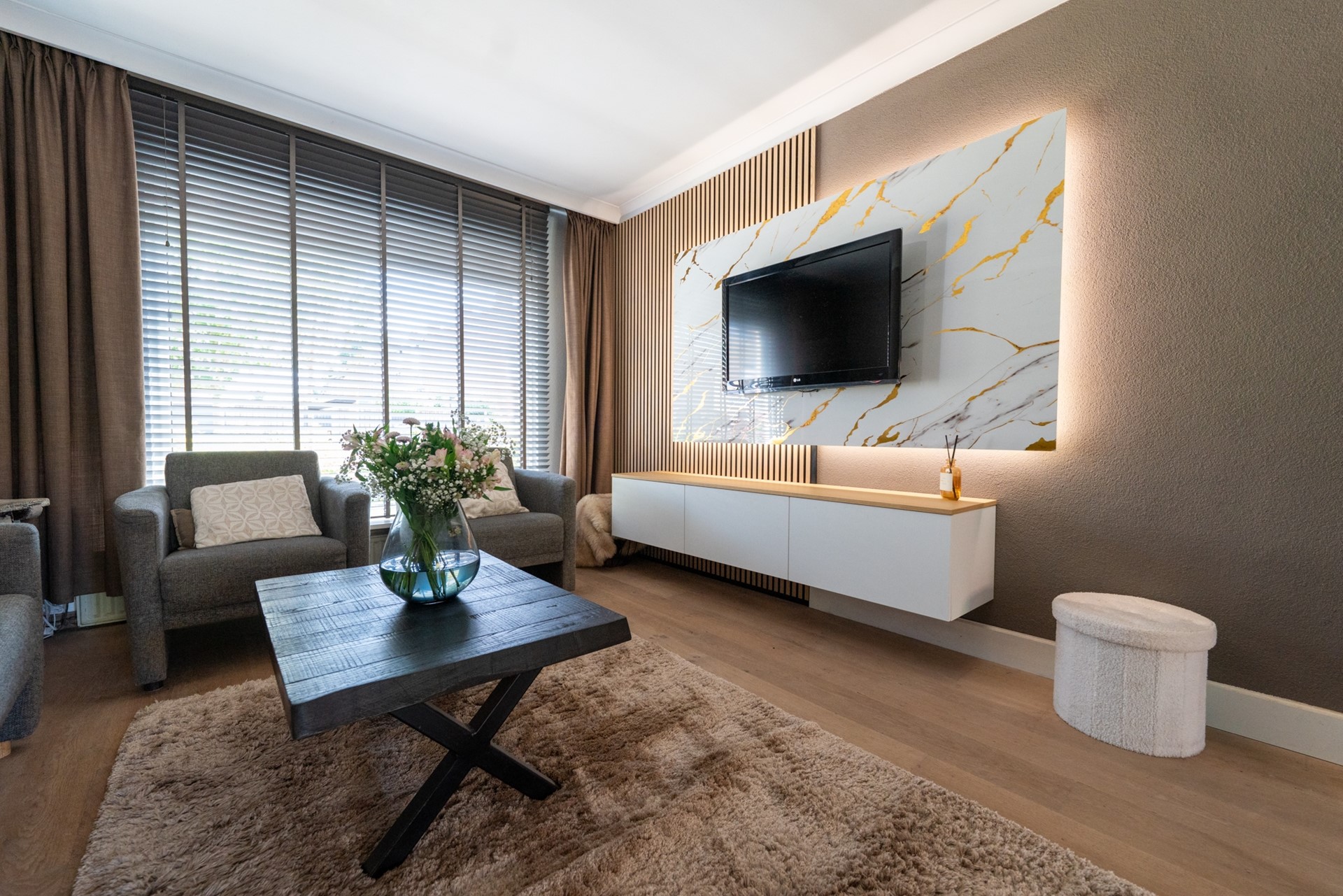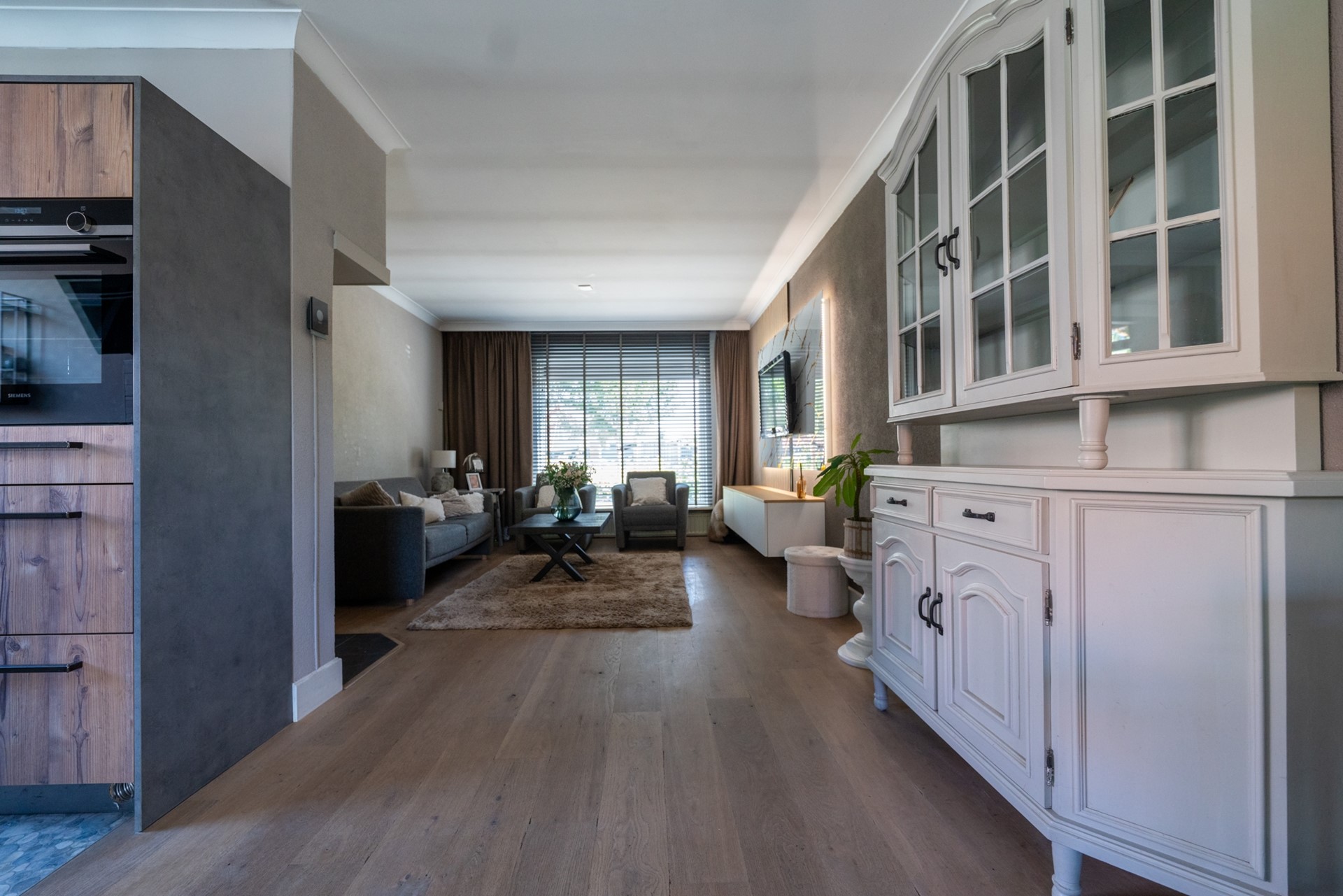 Via de hal met tegelvloer stap je binnen in de lichte, ruime woonkamer met houten vloer en schuifpui voorzien van een elektrisch screen. De woonkamer staat in open verbinding met de moderne keuken, uitgerust met een inductiekookplaat, afzuigkap, combimagnetron, oven, vaatwasser en koelkast.