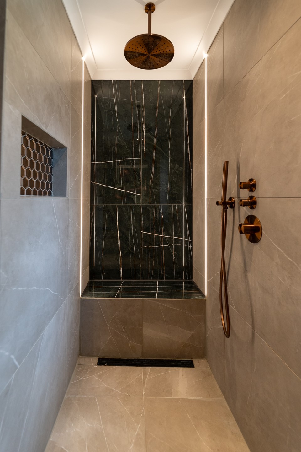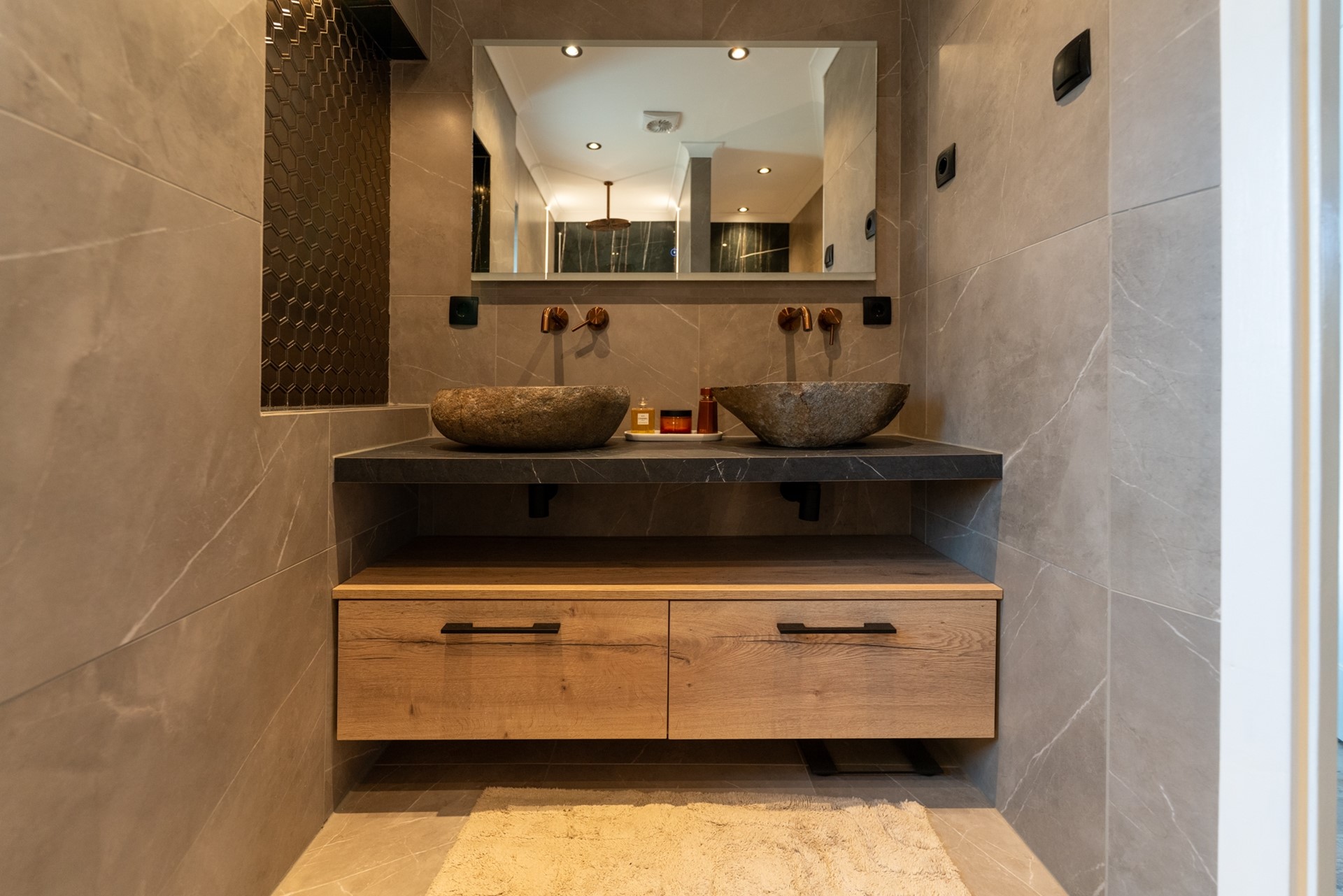 De overloop geeft toegang tot twee ruime slaapkamers, waarvan één voorzien van airco. De derde kamer is ingericht als inloopkast. De moderne badkamer is volledig betegeld en voorzien van een ruime inloopdouche, dubbel wastafelmeubel, en toilet.