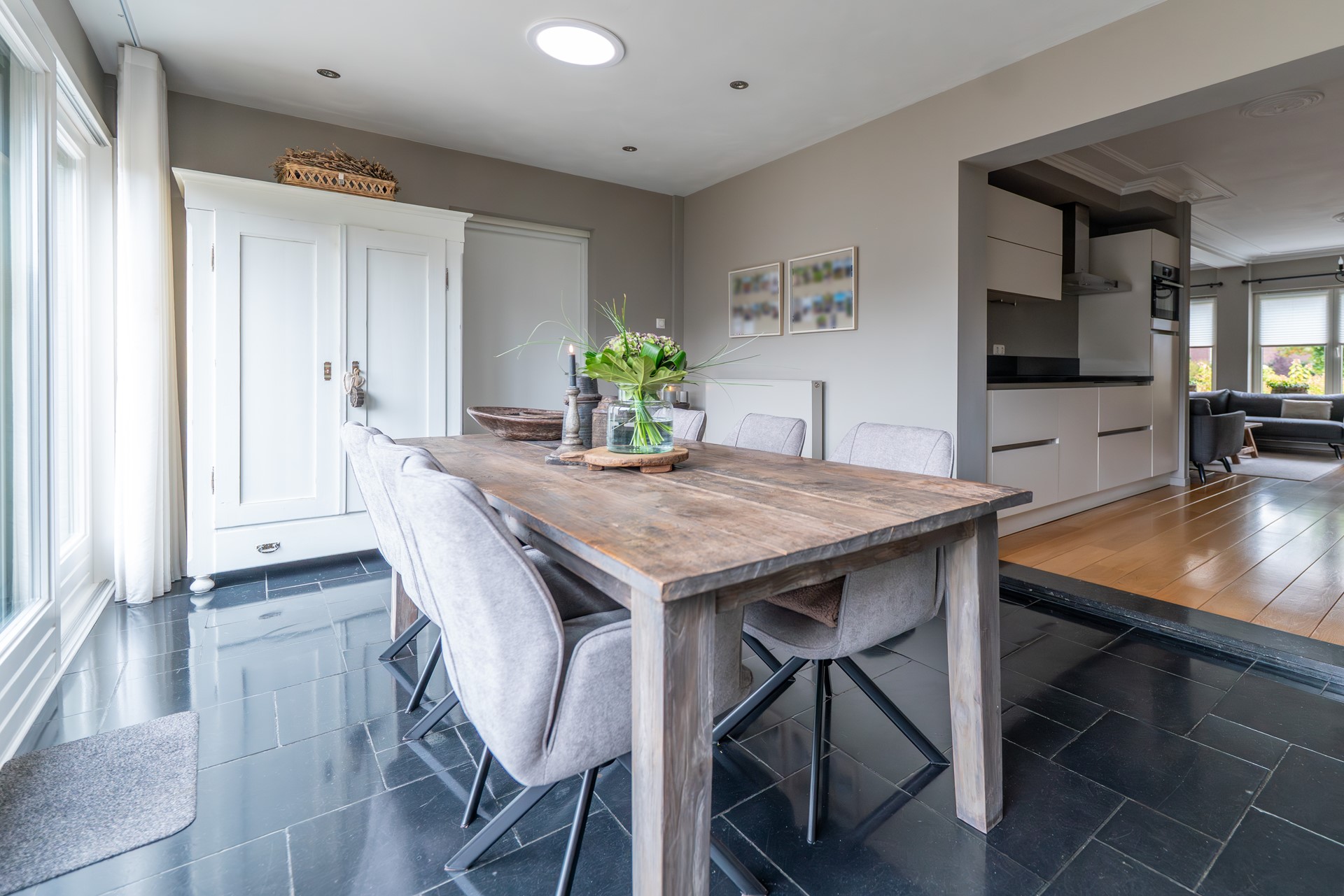 Wat direct opvalt, is de hoeveelheid licht die de woonkamer binnenstroomt. De doorzonopstelling zorgt voor een open, luchtige sfeer waarin je je meteen thuis voelt. De eikenhouten vloer en de sfeervolle allesbrander geven het geheel warmte en karakter — ideaal voor gezellige avonden met familie of vrienden.