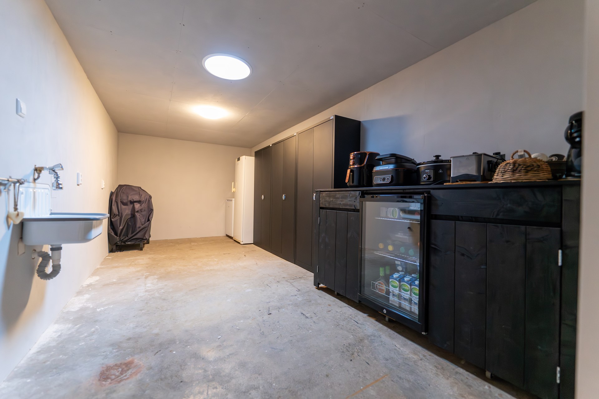 In de praktische bijkeuken bevinden zich de aansluitingen voor wasmachine en droger, veel bergruimte en een radiator. De aangrenzende berging beschikt over een aansluiting voor een vriezer en een waterpunt — ideaal voor het opbergen van voorraad of tuingereedschap.