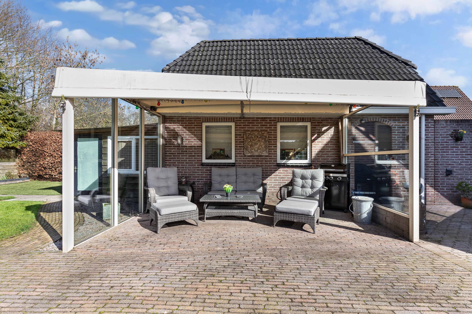 - Garage, in spouw gemetseld met grote zolder en aangebouwde overkapping en berging