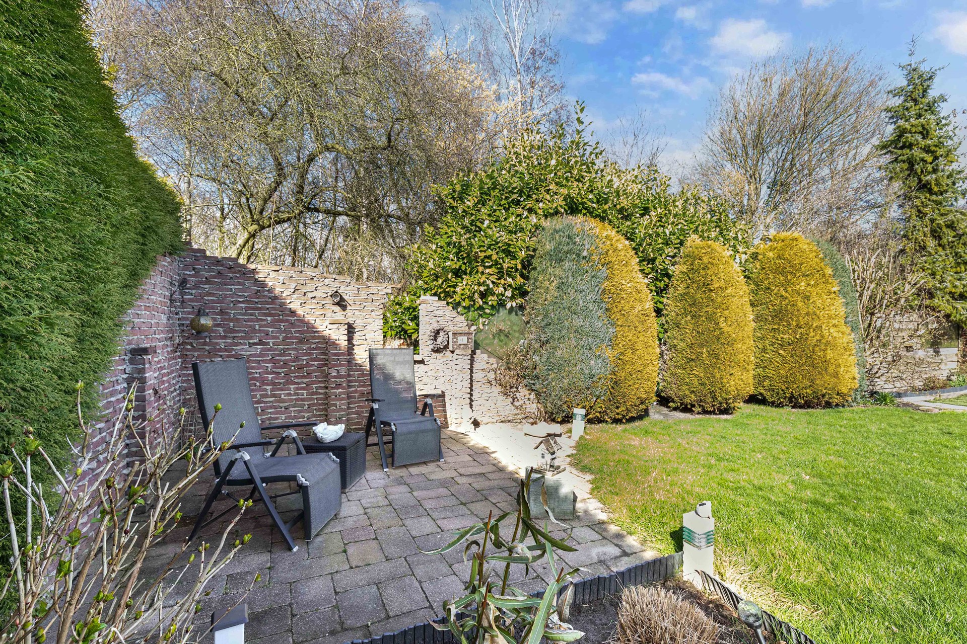 De tuin is gezellig ingericht met meerdere zithoekjes, zo kunt u overal de zon opzoeken. Ook is er een overkapping waar u lekker kunt zitten. U kunt aan beide kanten van de tuin naar voren, rondom het huis is ook tuin. Het huis ligt aan de rand van Bant, tegen de bosrand. Hierdoor heeft u veel privacy. Naast de garage is ook een houten berging aangebouwd, voor extra opslagruimte.