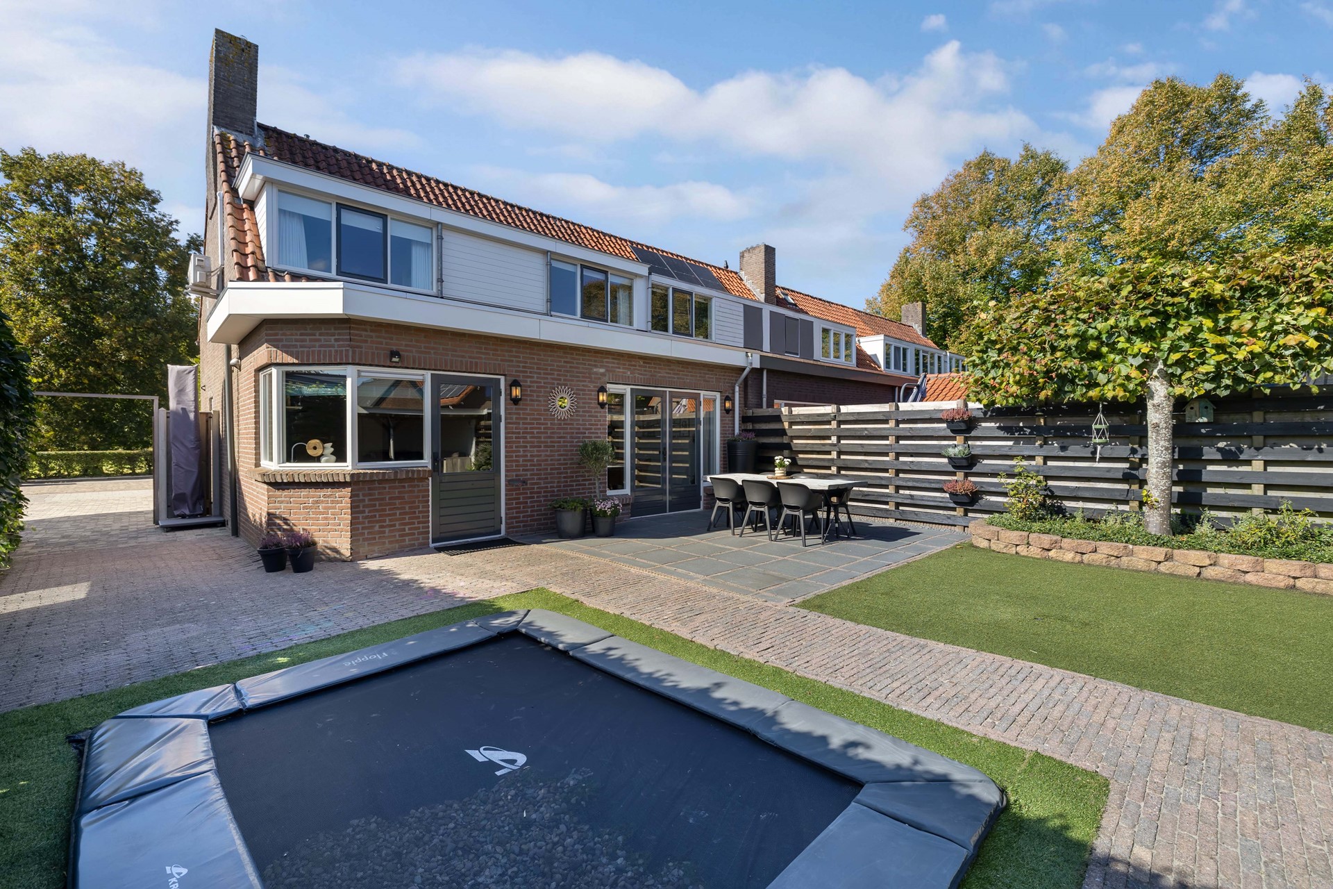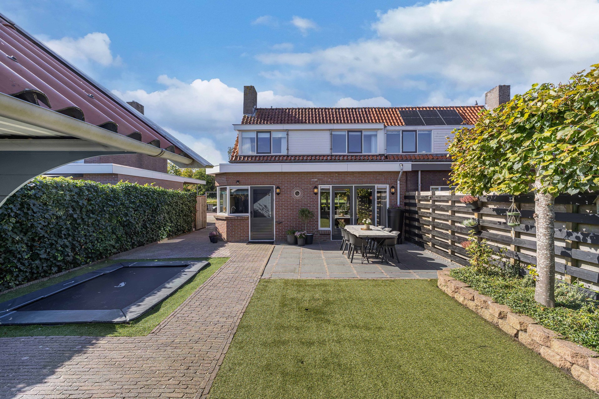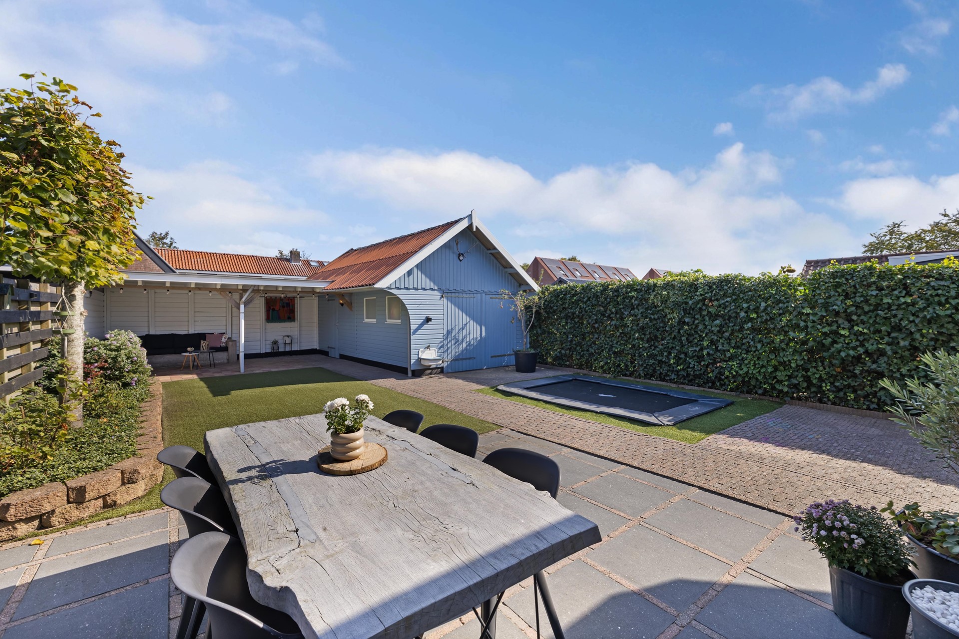 De ruime achtertuin op het oosten biedt een fijne combinatie van zon en schaduw vanwege de overkapping. Op het perceel van 333 m2 staat ook een vrijstaande houten berging met zolder(!), ideaal als opslag.
