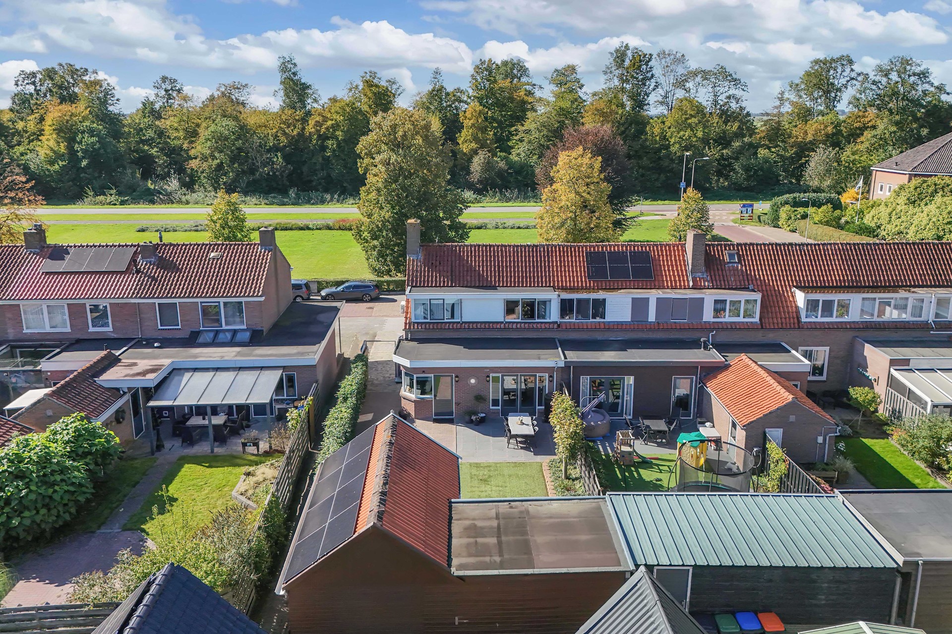 De groene voortuin bevindt zich op het westen en is onderhoudsvrij. U kunt hier beschut zitten vanwege de mooie heg en aangeplante bomen. U kunt de auto parkeren op uw eigen oprit.