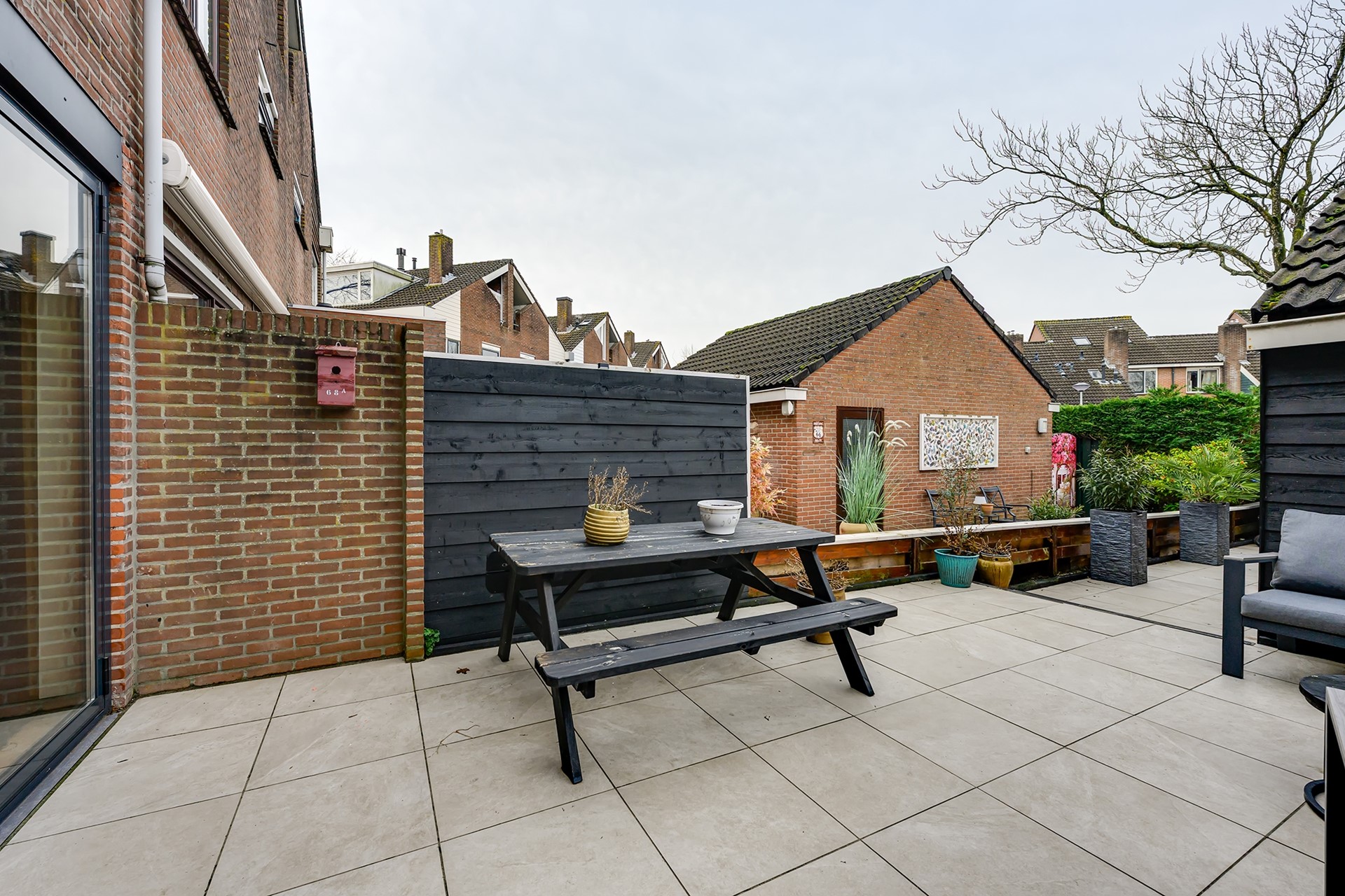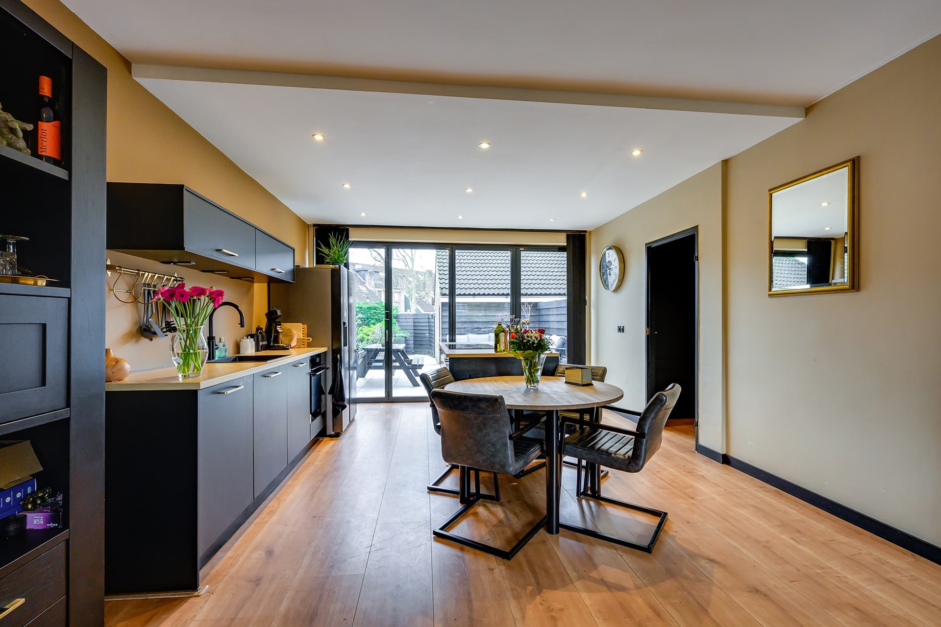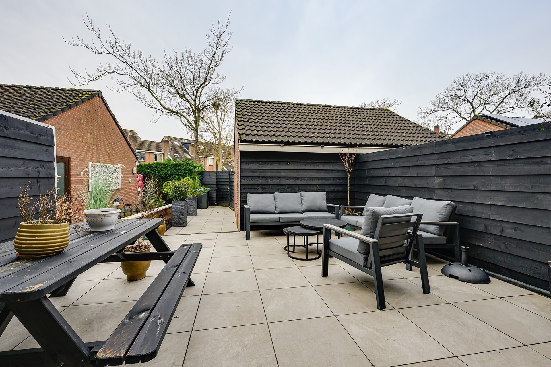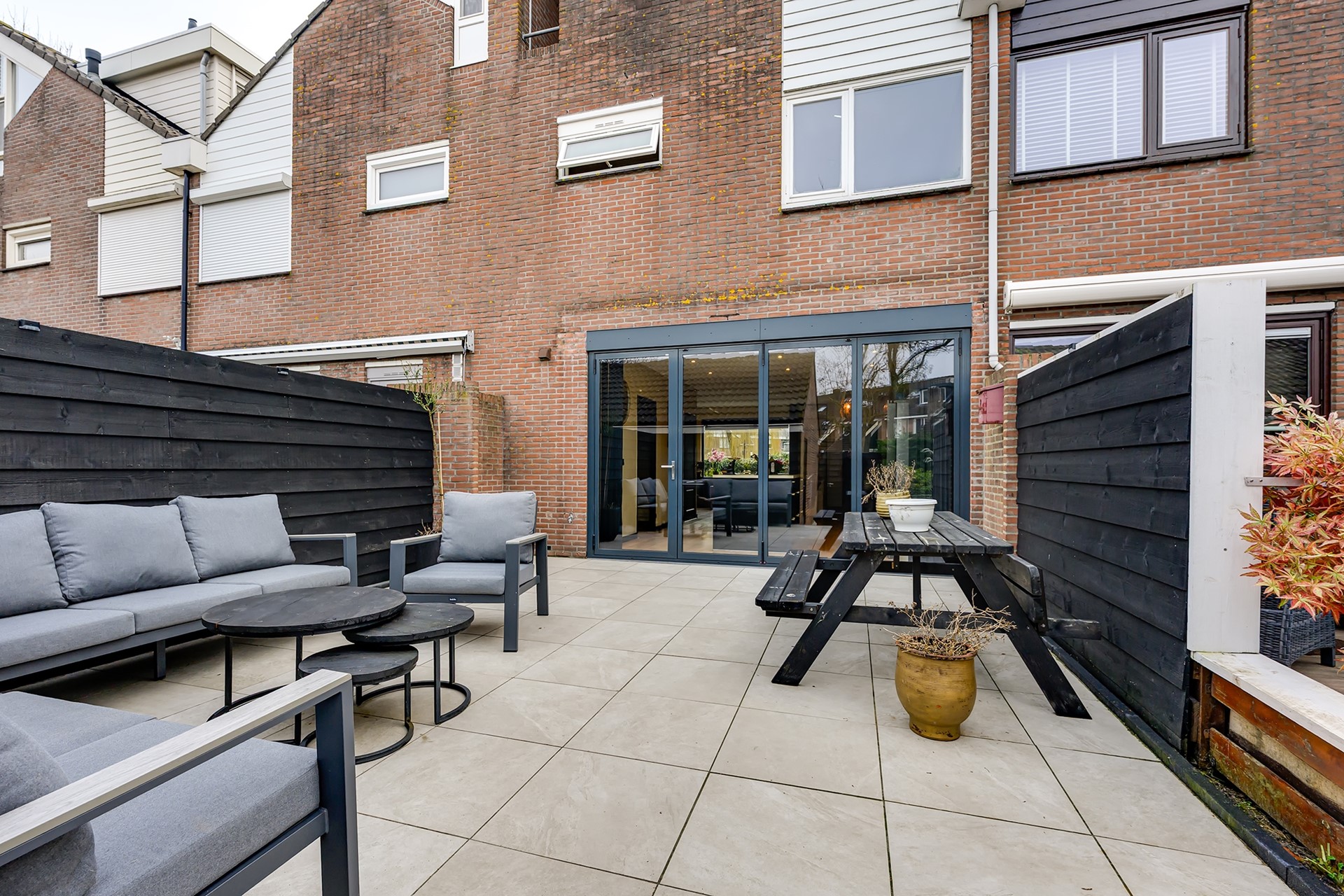 Via de keuken stap je door de stijlvolle harmonica pui zo de zonnige achtertuin in. Dankzij de ligging op het zuidwesten geniet je hier vrijwel de hele dag van de zon – van een rustige kop koffie in de ochtend tot lange, sfeervolle zomeravonden.
