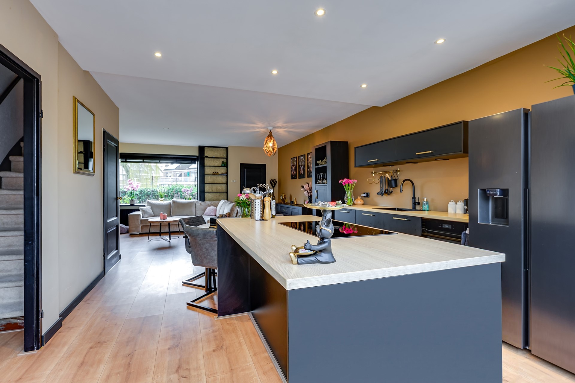 De moderne keuken (2021) combineert stijl en functionaliteit in één. De mat zwarte kasten met houtlook werkblad geven de ruimte een luxe en eigentijdse uitstraling, terwijl de diverse inbouwapparatuur zorgt voor optimaal kookgemak. De keuken is v.v. een inductiekookplaat met ingebouwde afzuiging, Amerikaanse koel-/vrieskast, vaatwasser, oven en Quooker.