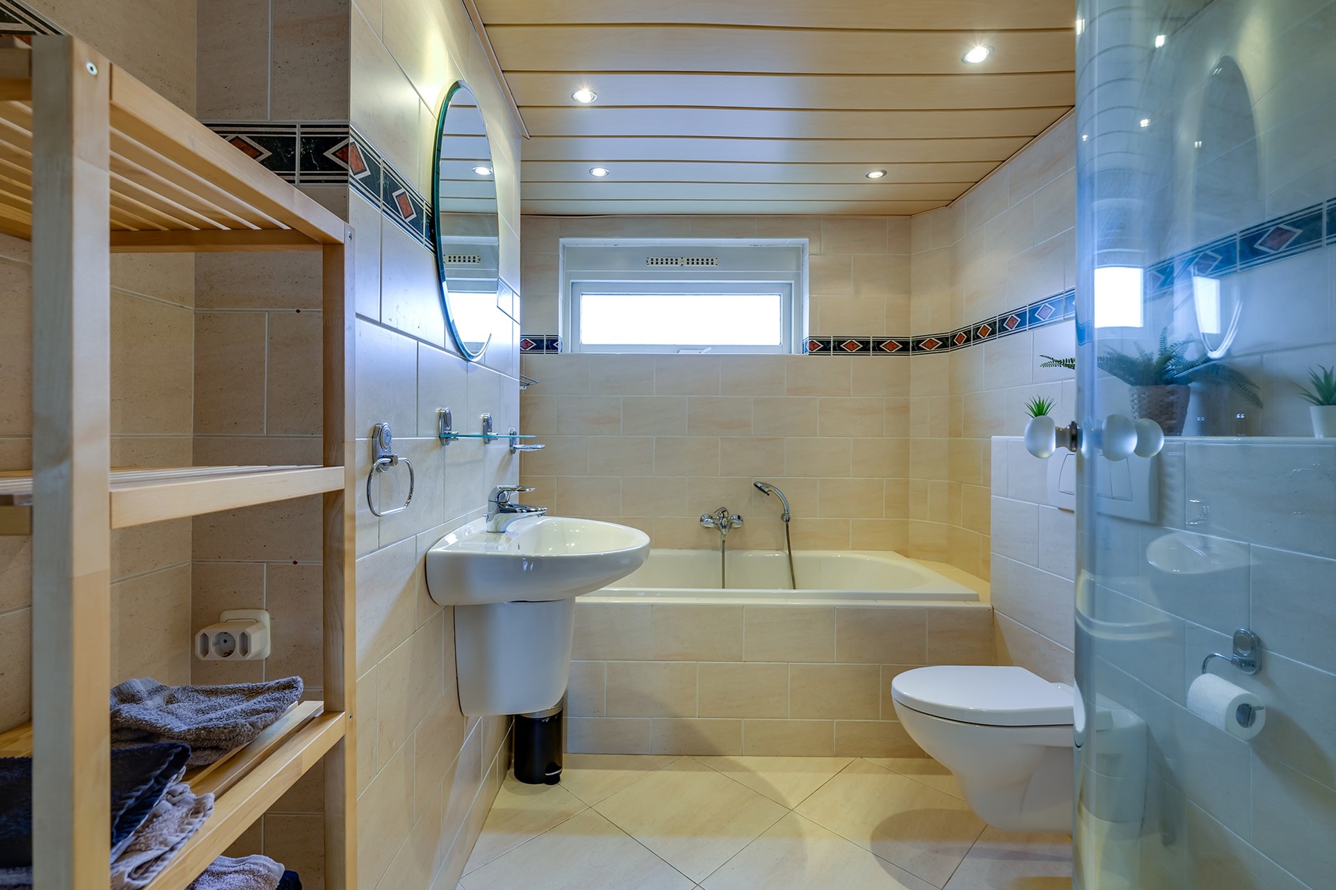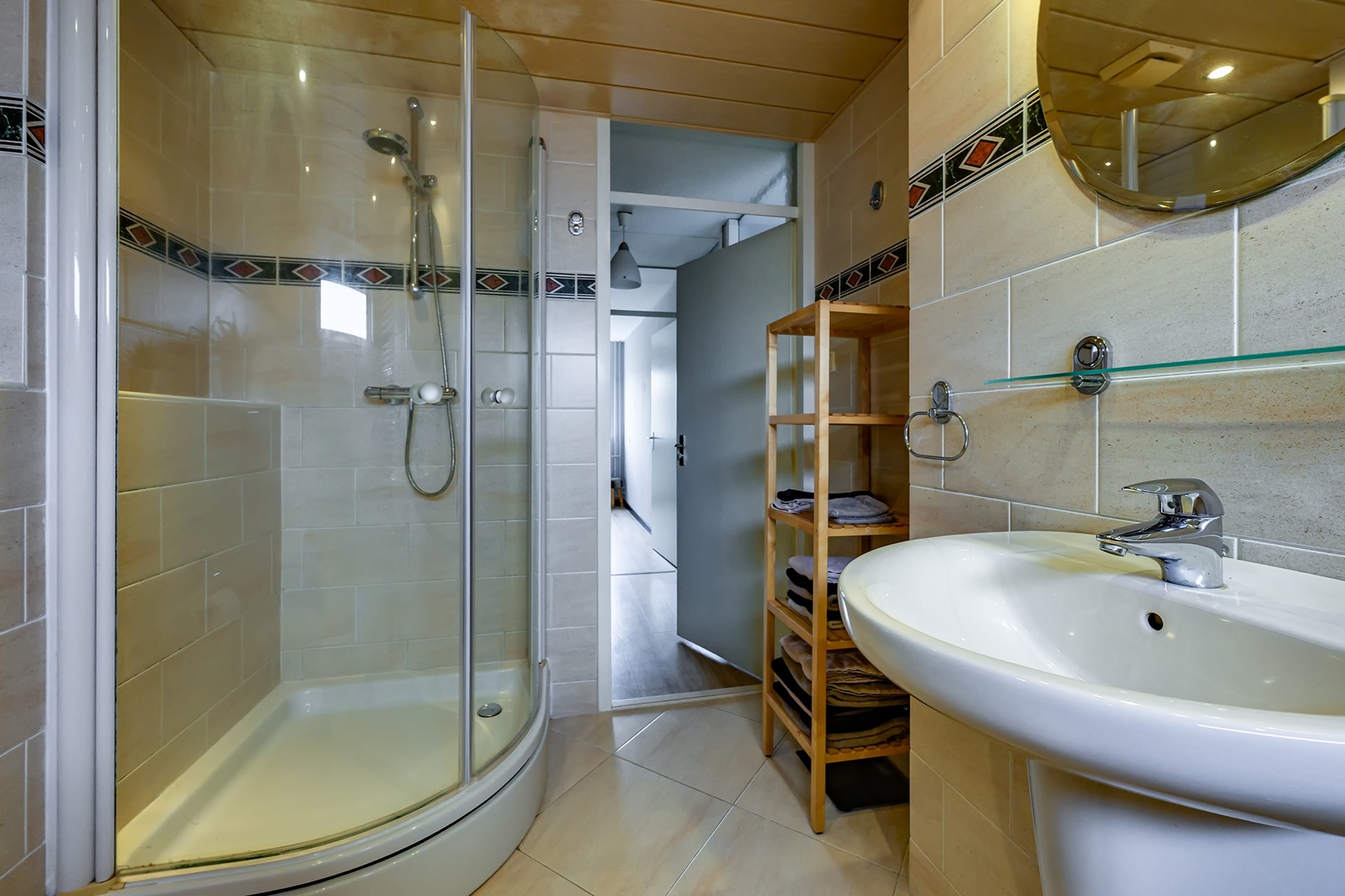 De volledig betegelde badkamer, eveneens aan de achterzijde gelegen, is compleet uitgevoerd en biedt alles wat je nodig hebt. Je vindt hier een ligbad om heerlijk te ontspannen, een aparte douchecabine, een toilet en een wastafel. Een verzorgde en functionele ruimte waar je iedere dag comfortabel begint en eindigt.