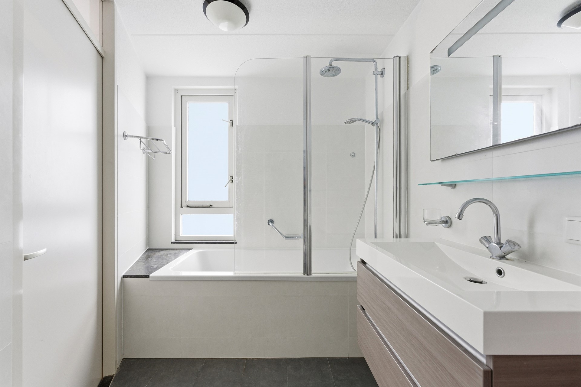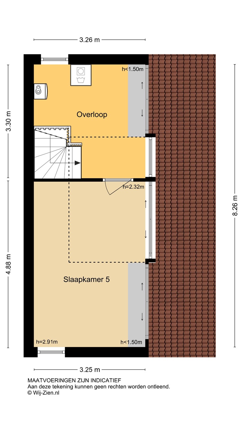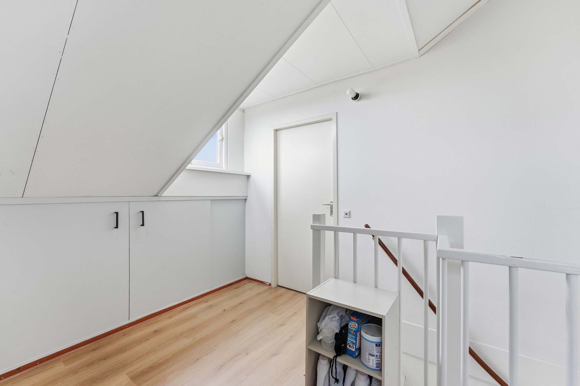 Hier bevindt zich nog een slaapkamer met extra bergruimte achter de knieschotten én een ruime overloop met plaats voor wasmachine/droger. Hier is ook de opstelplaats voor de CV-ketel. Dankzij de dakkapel is hier veel daglicht en ruimte.