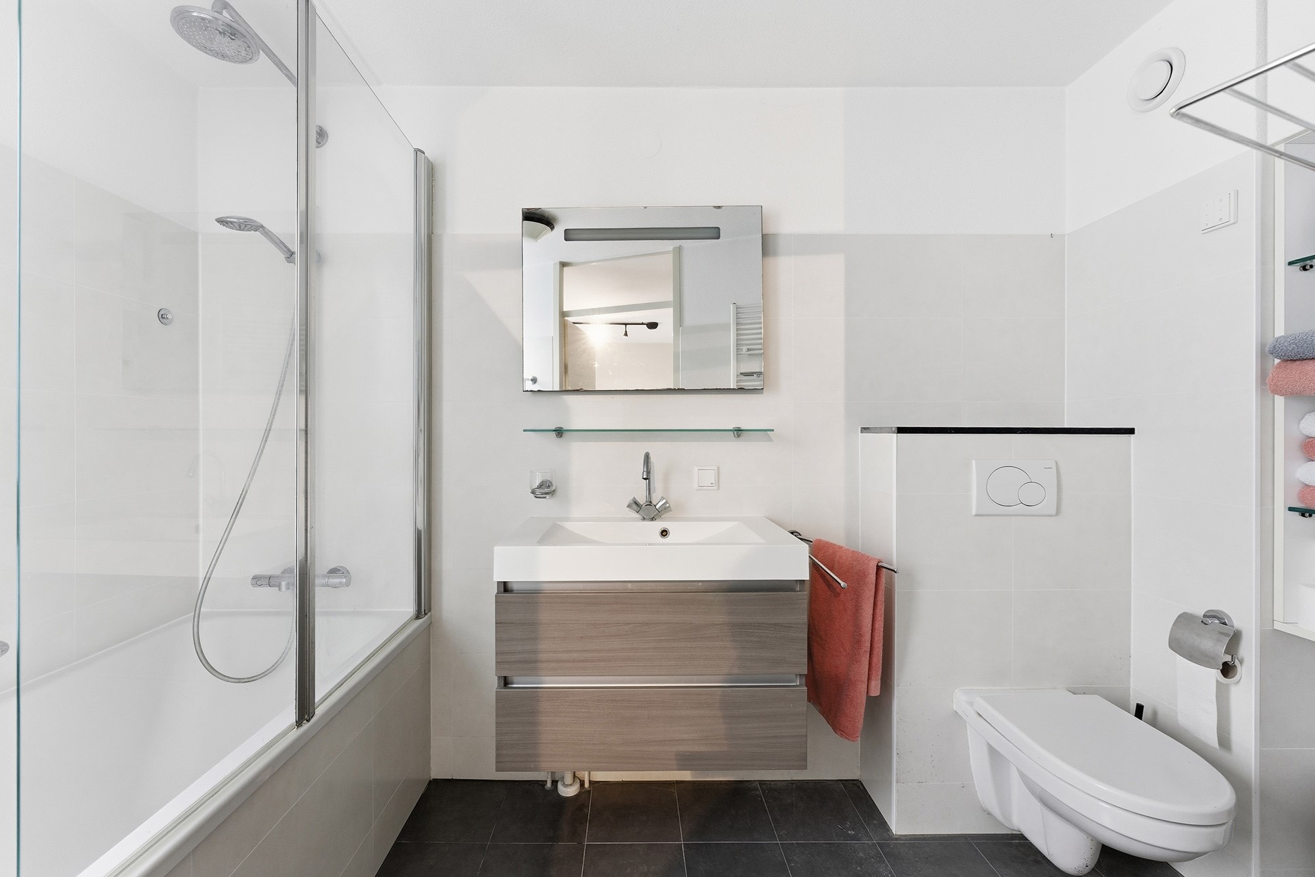 Op deze verdieping vind je twee ruime slaapkamers en een nette badkamer met ligbad/douchecombinatie, wastafelmeubel en toilet. Er is een zeer ruime overloop waar je gemakkelijk nog een gezellige werkplek kan maken.