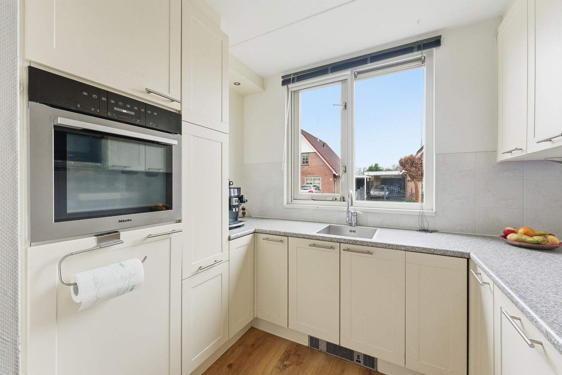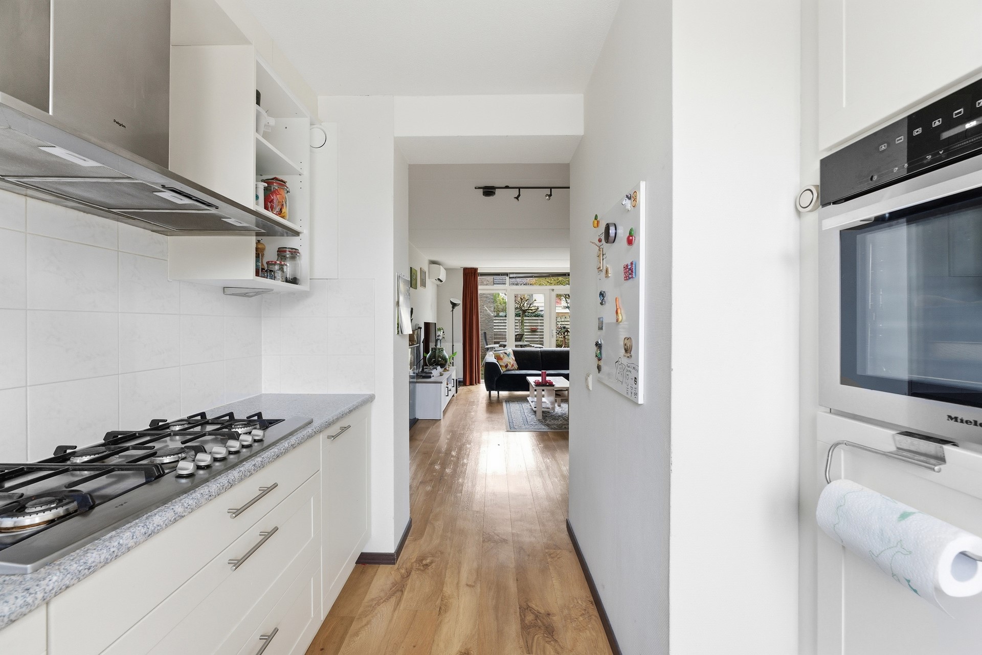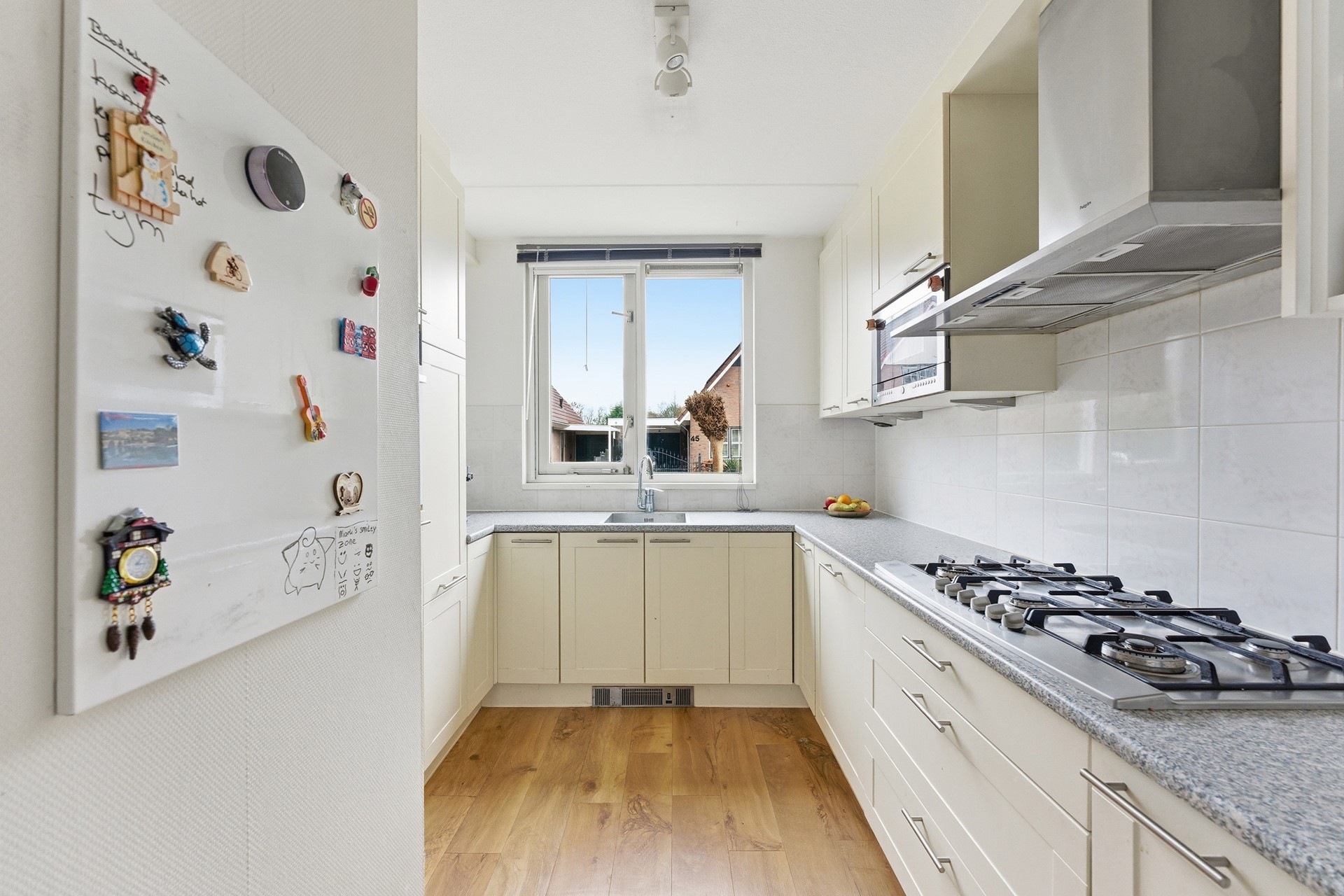 Je komt de woning binnen in een ruime hal met garderobe, trapopgang en toilet. Vanuit hier stap je de royale woonkamer binnen: licht, breed en met openslaande deuren naar de tuin. De open keuken bevindt zich aan de voorzijde en biedt veel kast- en werkruimte.