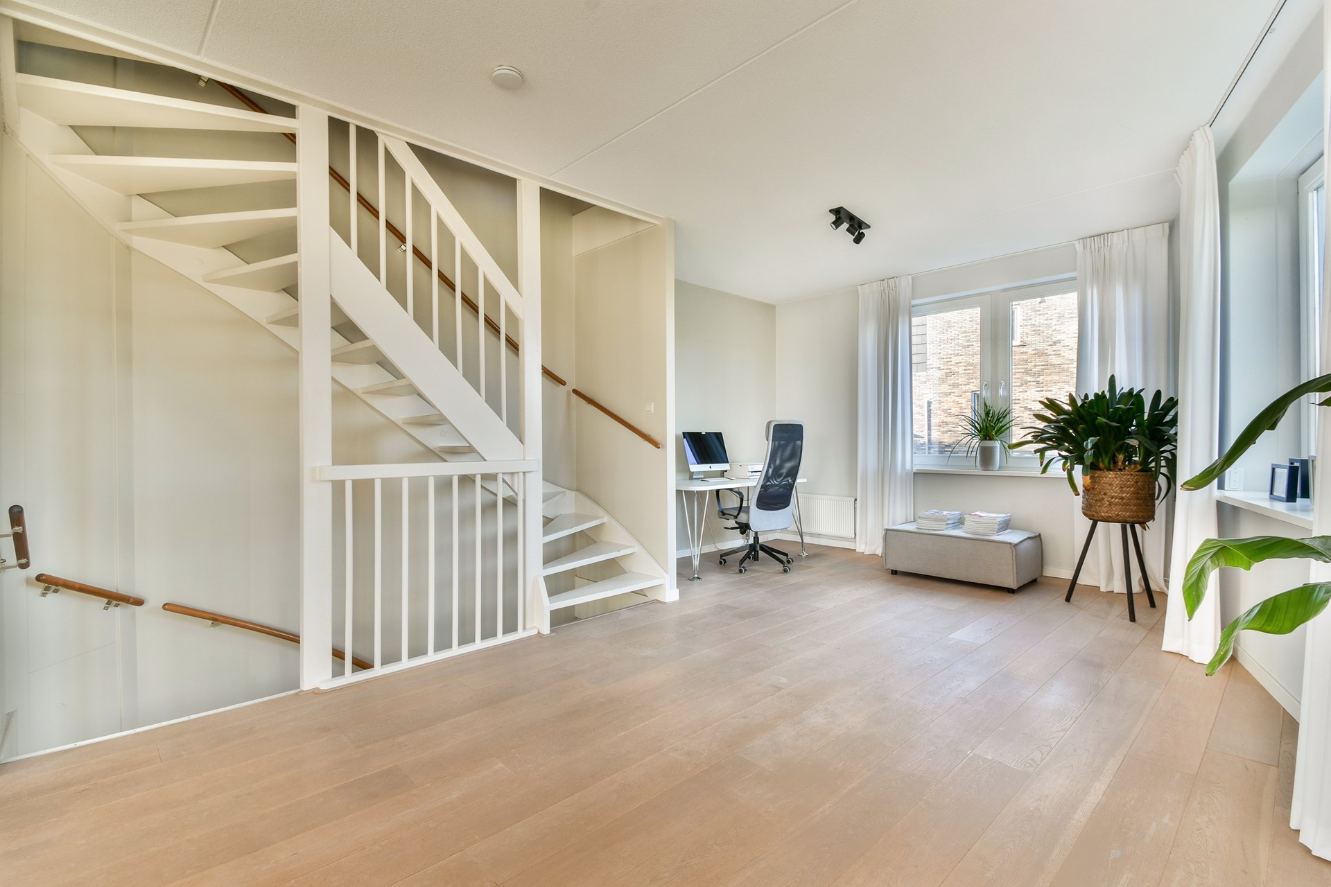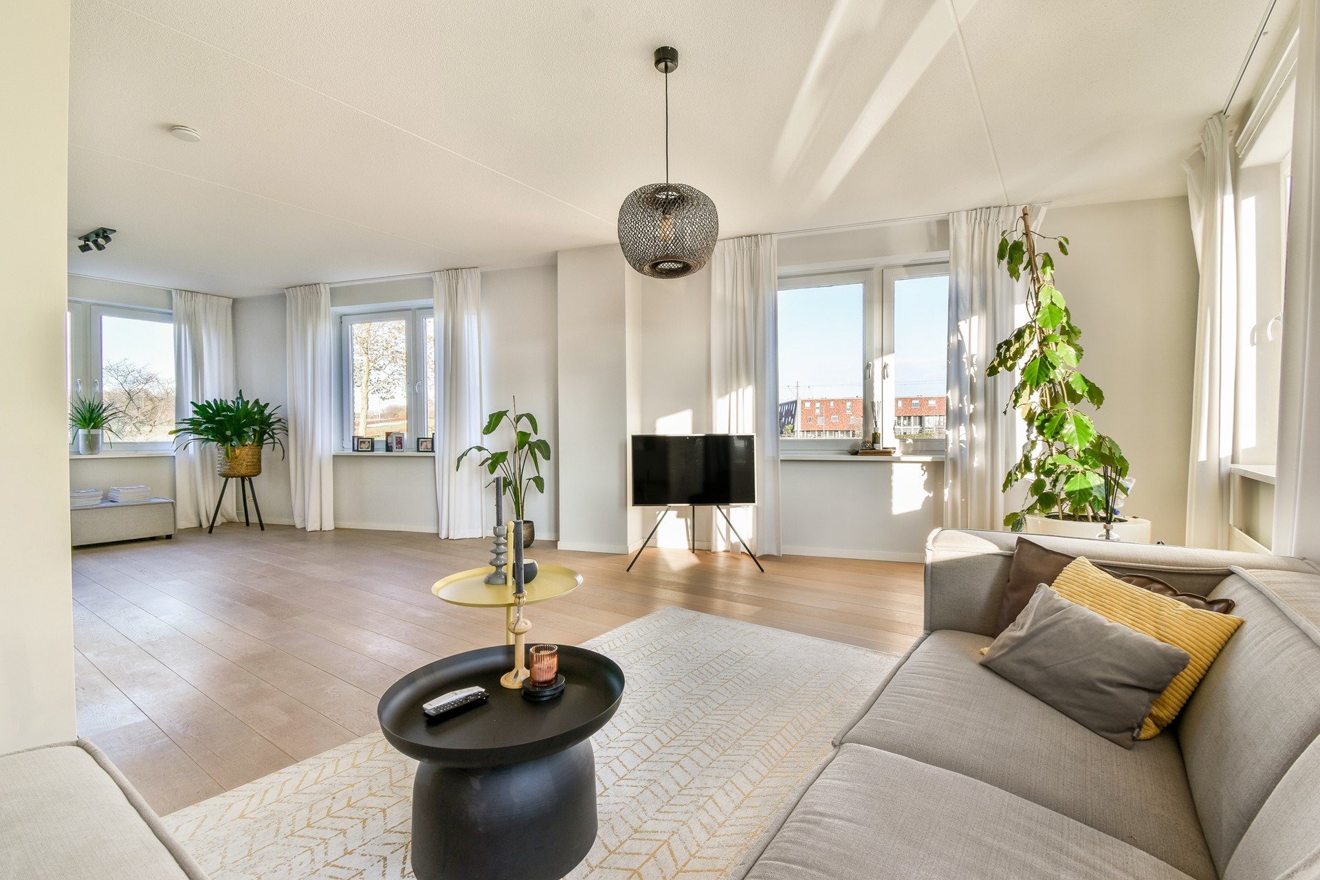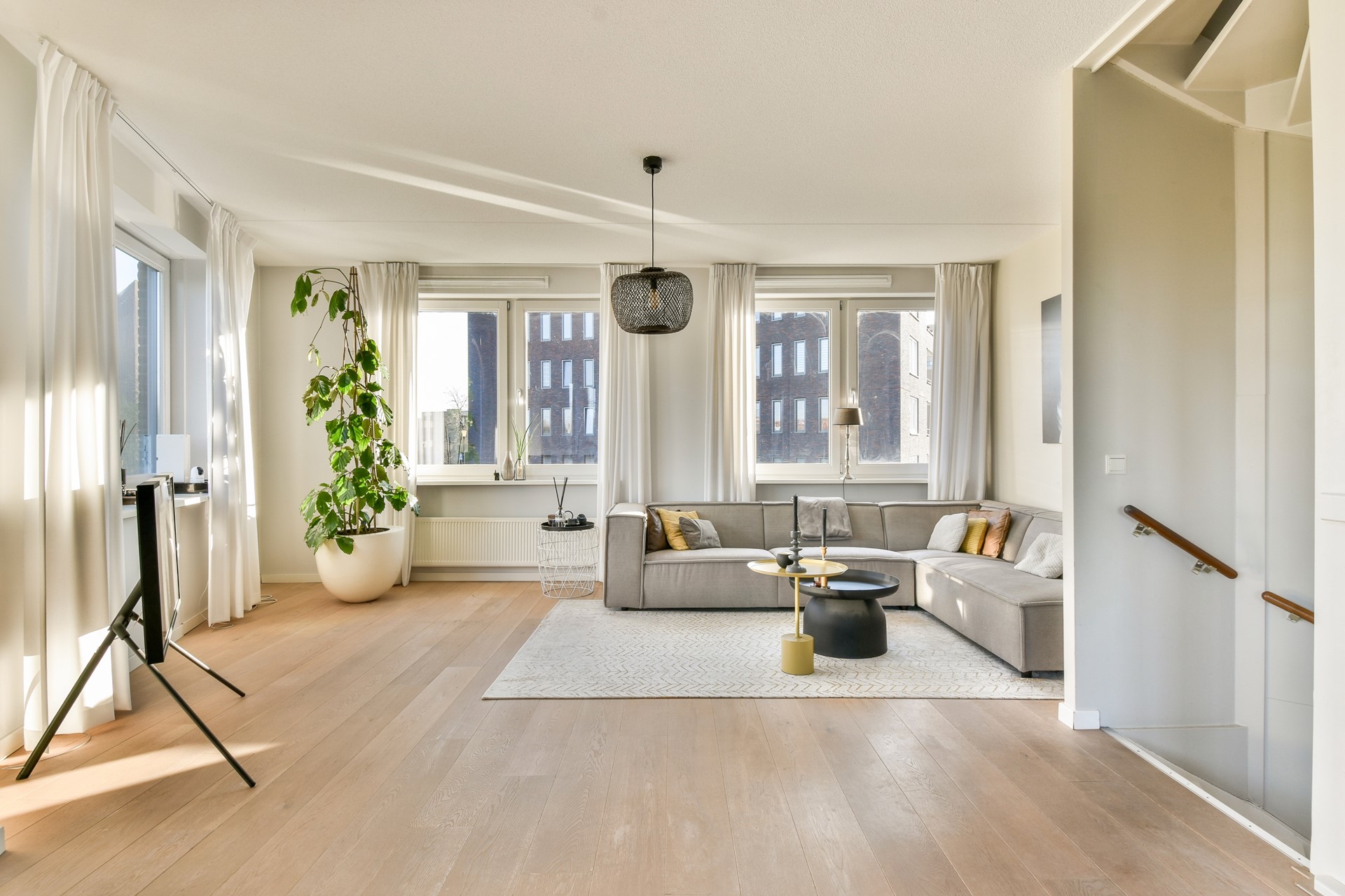 Via de trap bereik je de royale woonkamer en royaal is hier echt het juiste woord. Dit is zo’n verdieping waar je binnenstapt en direct denkt: wauw, dit is groot! De ruimte strekt zich breed uit en doordat de woonkamer rondom grote ramen heeft, valt het daglicht hier werkelijk van alle kanten naar binnen.